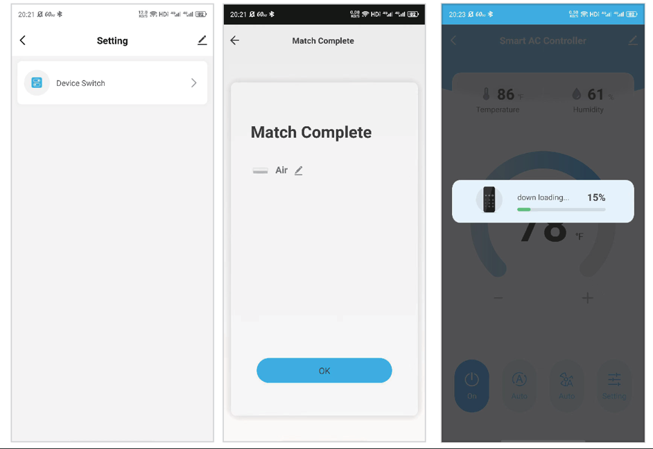 Перейдите в пункт меню "Site" для добавления кондиционера. Выберите пункт меню "Device Switch" и переместите ползунок "Start Learn". Затем выберите ваш бренд из списка брендов. После завершения загрузки кодов можно пользоваться контроллером.