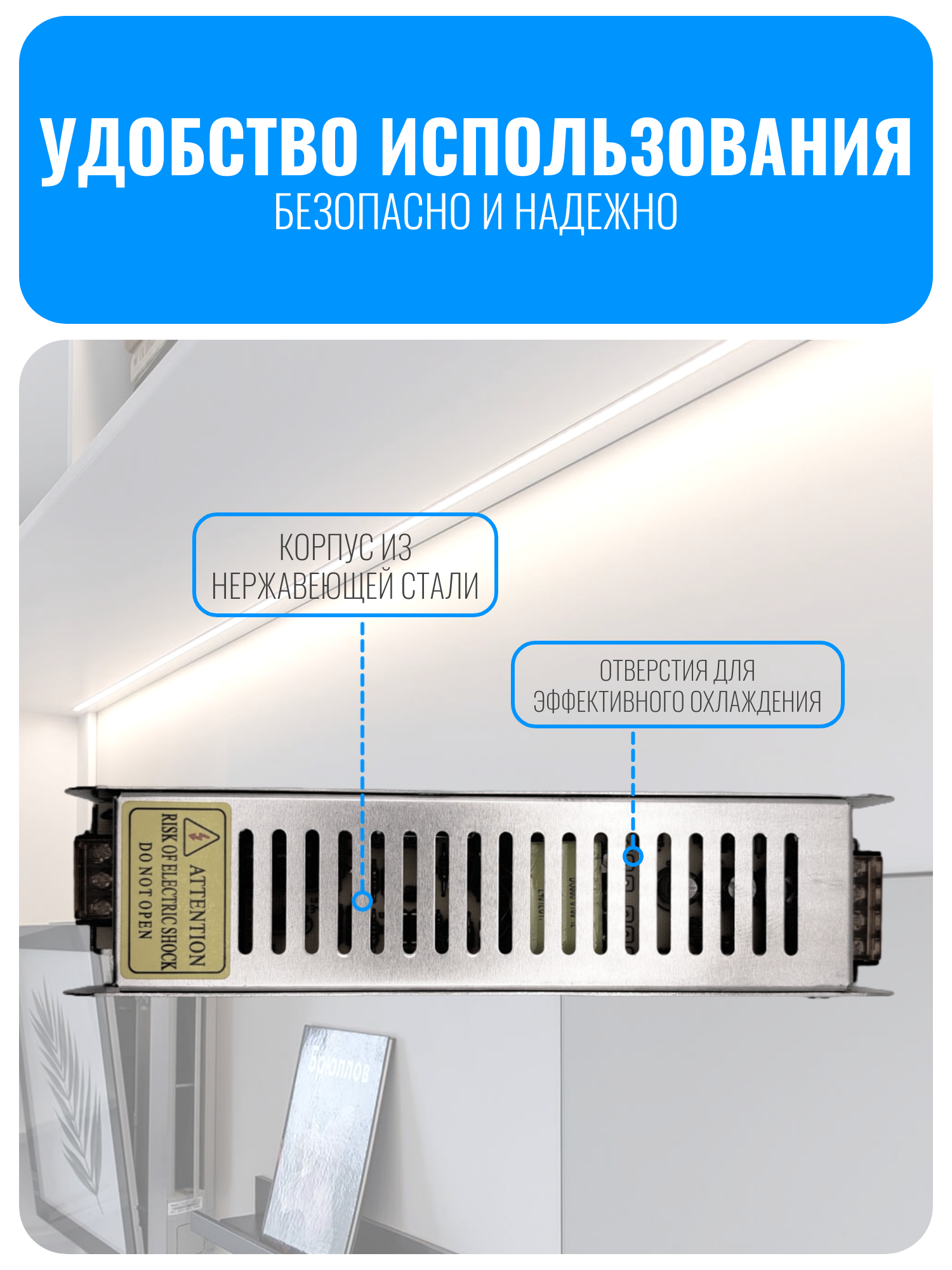 Блок питания подходит для светодиодных изделий с напряжением 12/24 В, используемых для подсветки в сухих помещениях, таких как спальни, залы, коридоры, офисы и кухни.