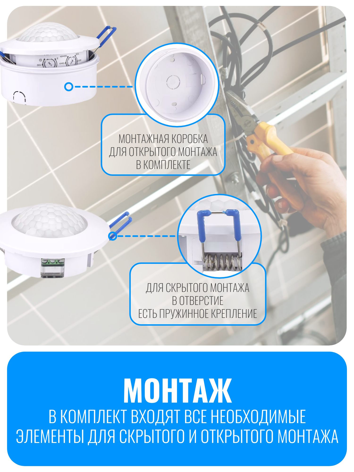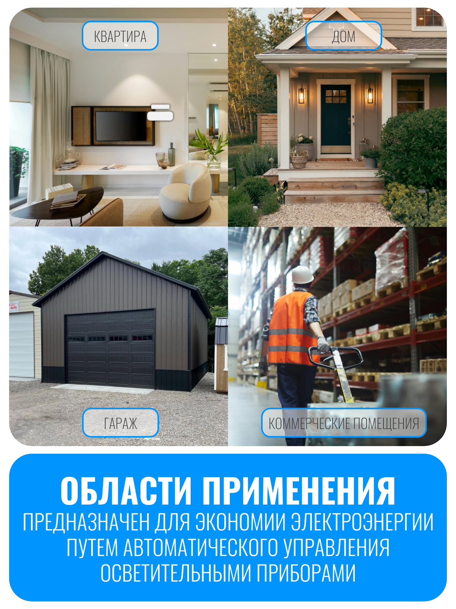 Датчики движения применяются для автоматизации управления освещением. Они подходят для установки в коридорах, на лестницах и в гаражах. Когда человек попадает в зону действия датчика, свет включается автоматически. Это обеспечивает удобство и помогает снизить потребление электроэнергии. После ухода человека свет выключается с задержкой, время которой регулируется с помощью встроенного таймера. Также предусмотрена настройка чувствительности к освещённости, что позволяет адаптировать работу датчика к уровню света в помещении.