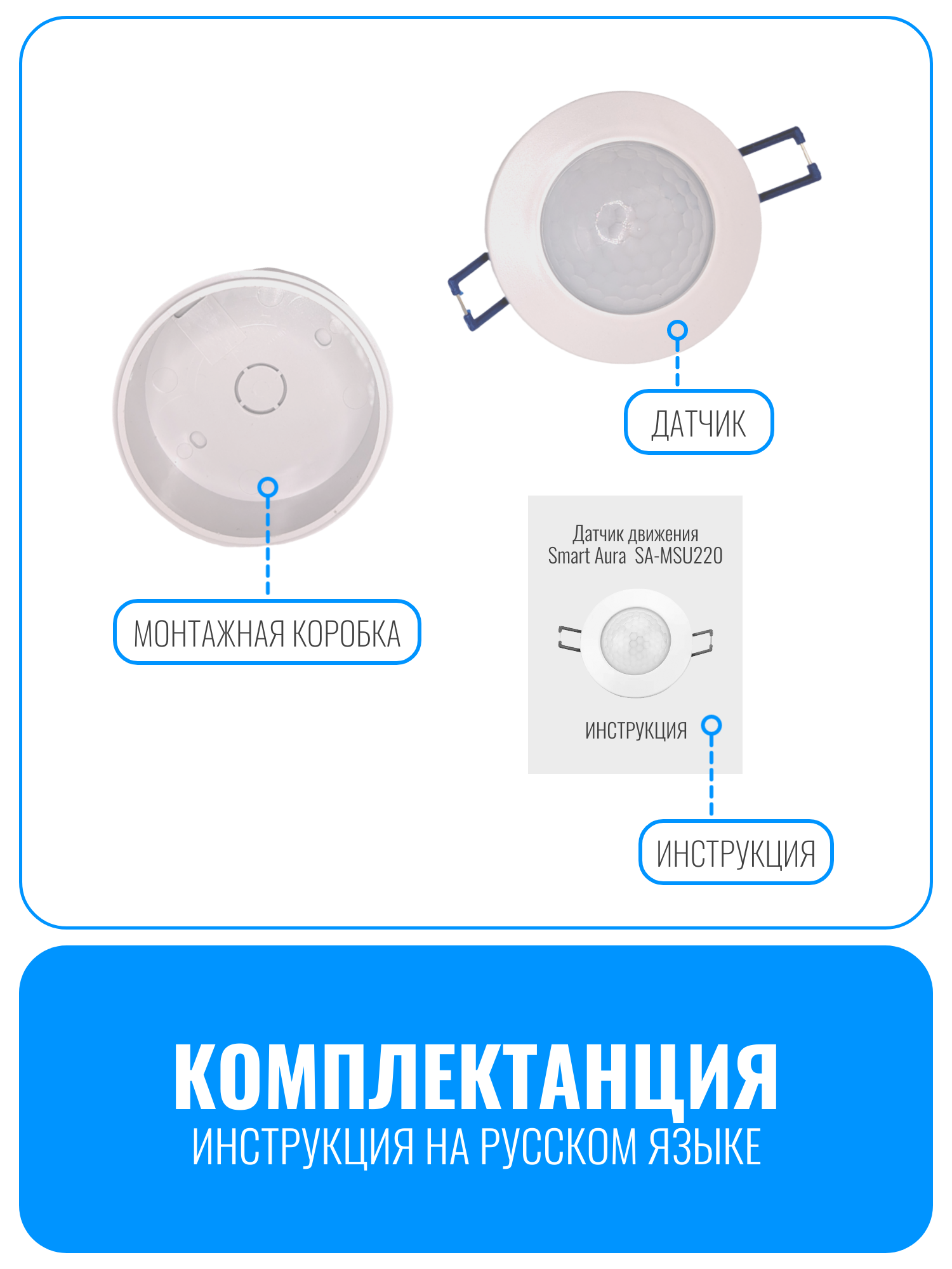 Датчик движения Smart Aura SA-MSU220 автоматически включает освещение на 220 В при обнаружении движения. Компактный корпус и пружинные крепления позволяют легко встраивать устройство в натяжной потолок. При необходимости датчик можно установить накладным способом, используя входящую в комплект монтажную коробку. Радиус действия устройства достигает 6 метров, зона охвата — 360 градусов.