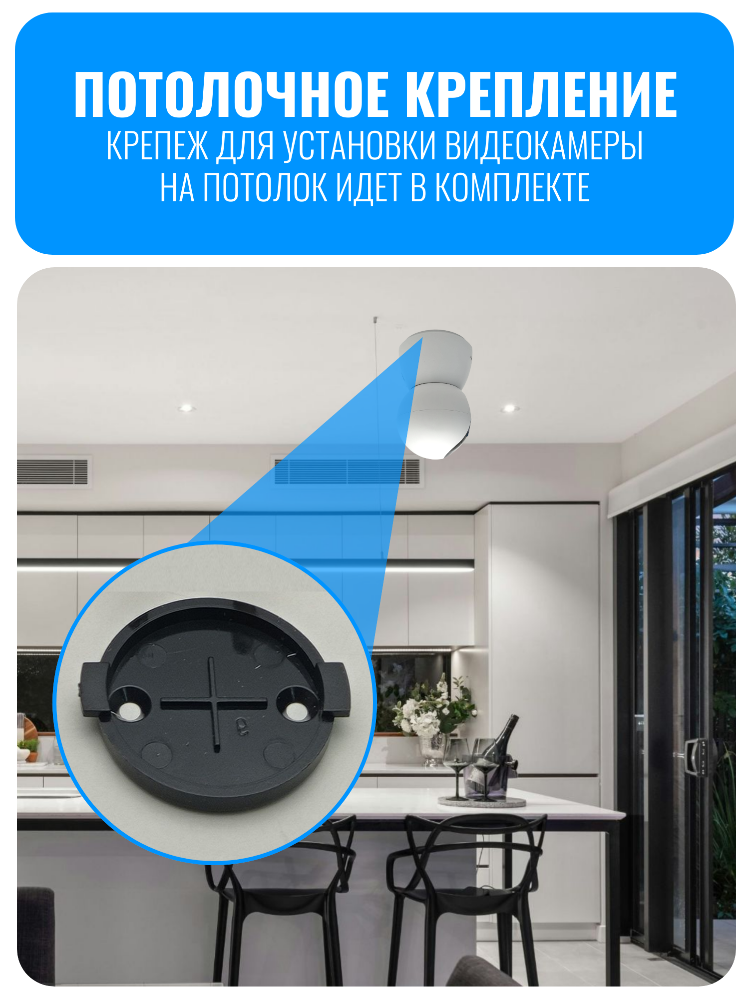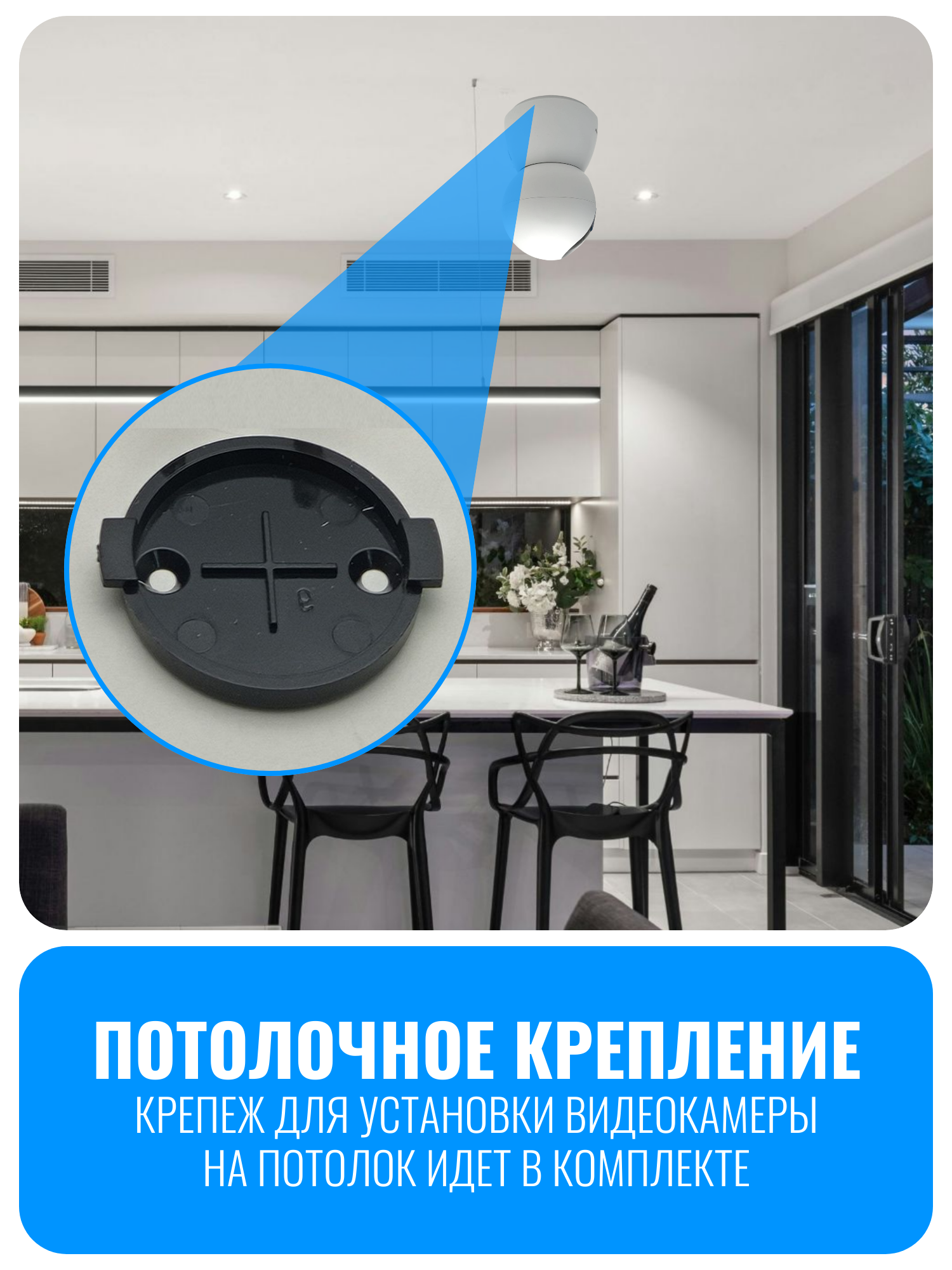 Камера оснащена функцией двухсторонней аудиосвязи, что позволяет общаться с находящимися в помещении людьми. Она также способна распознавать движение человека и автоматически следить за ним. При обнаружении движения отправляется уведомление на смартфон пользователя. Устройство может быть установлено на столе или закреплено на потолке с помощью крепежа из комплекта.