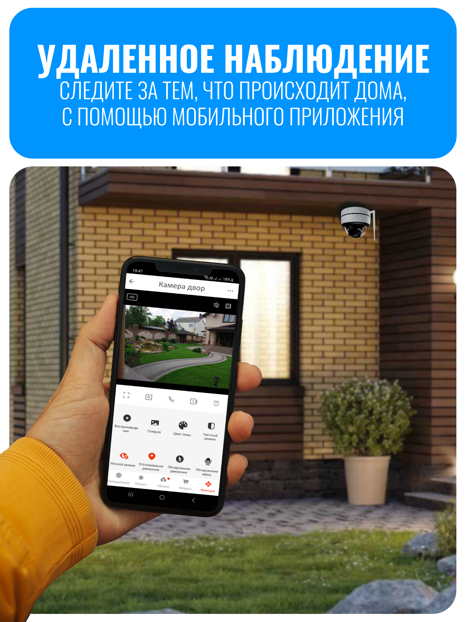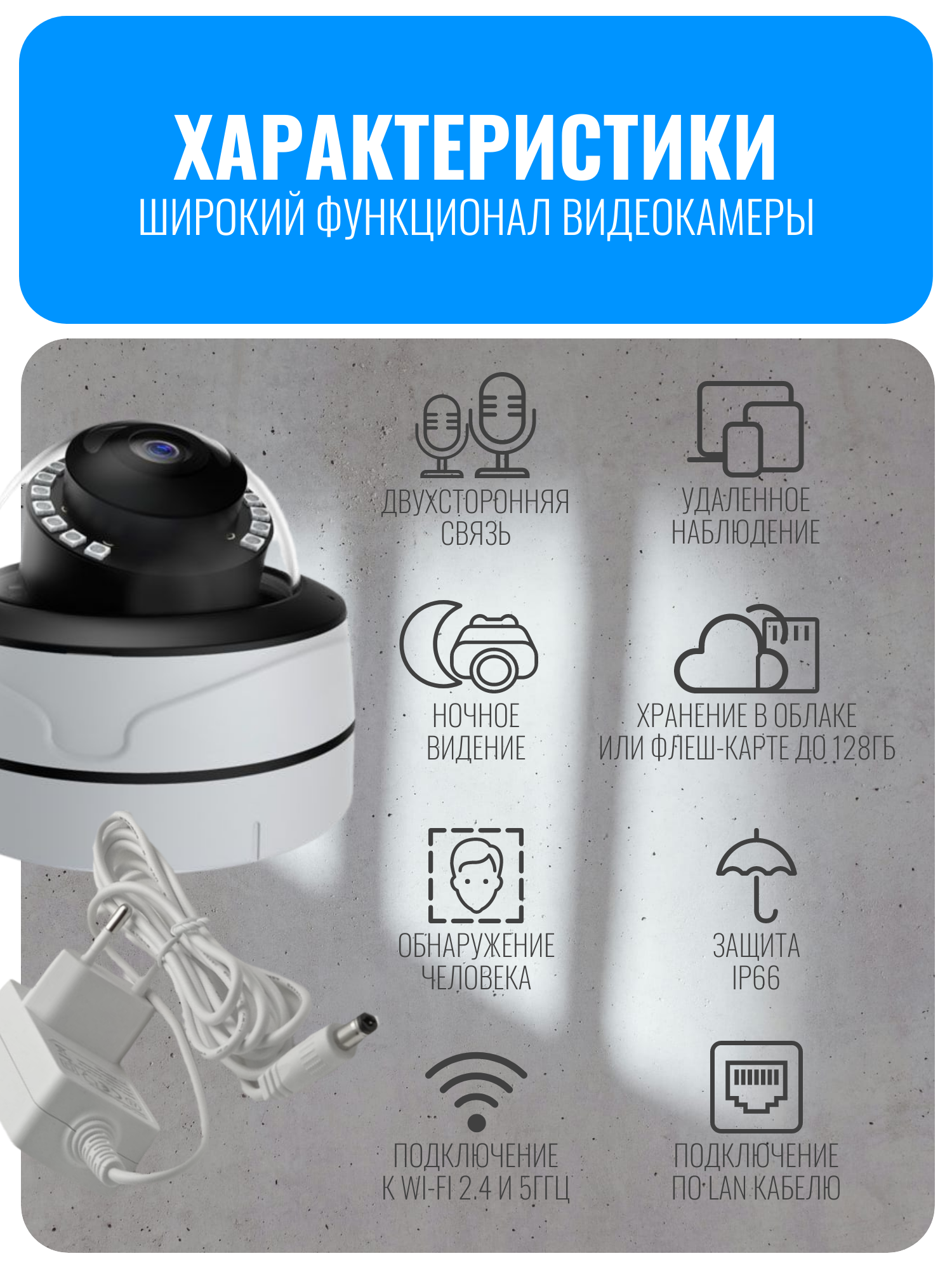 Детектор движения, Дистанционное управление, Режим "День/Ночь", Отправка уведомлений при срабатывании датчиков, Циклическая запись, Onvif, Настройка зоны детекции, Сирена, Dual-band Wifi