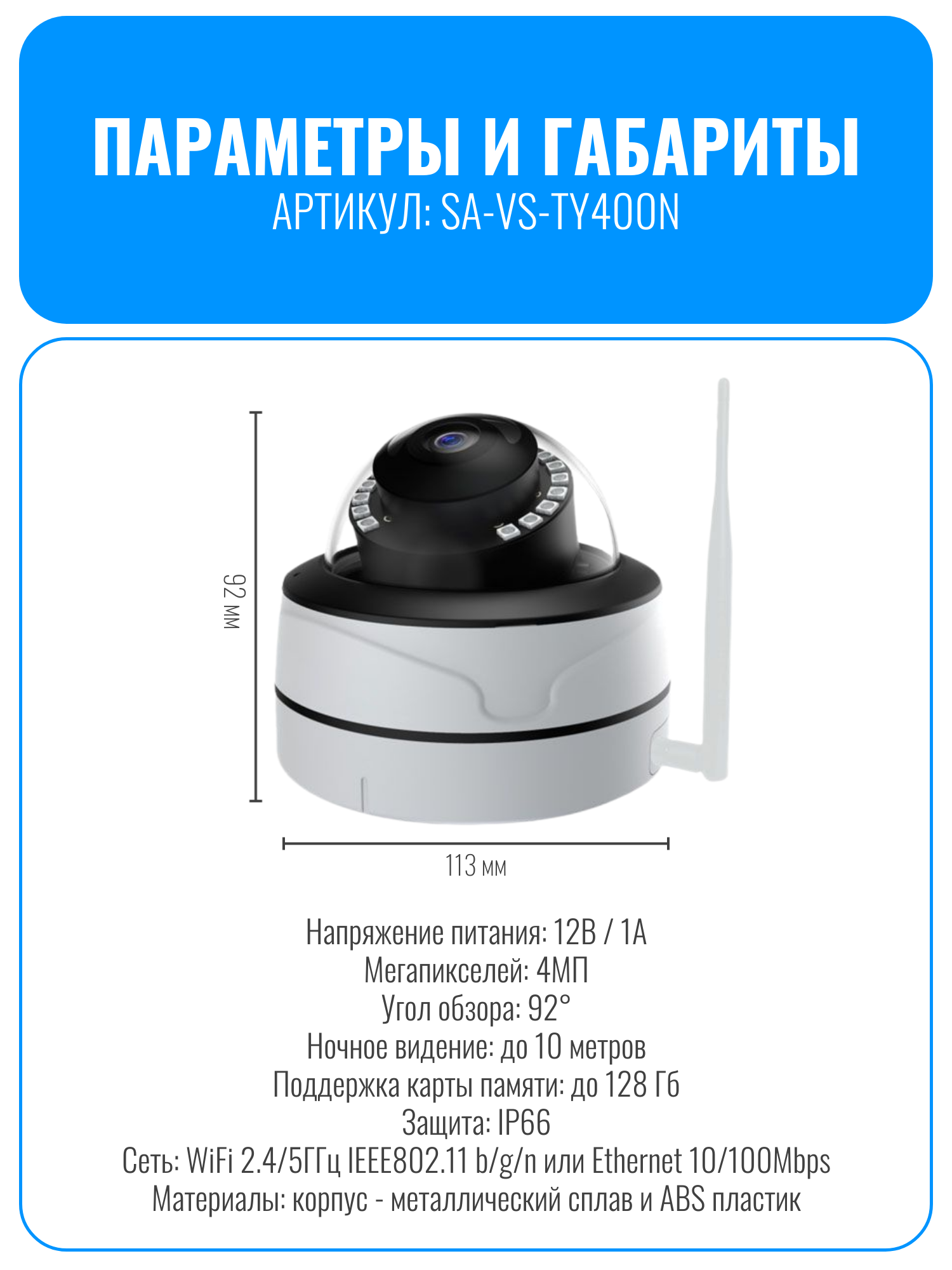 Купольная видеокамера наблюдения Smart Aura SA-VS-TY400N - это надежное решение для обеспечения безопасности вашего объекта. Она обладает защитой уровня IP66, что гарантирует её устойчивость к неблагоприятным погодным условиям. Камера подключается к сети Интернет через Wi-Fi на частотах 2.4 или 5 ГГц, а также с помощью LAN-кабеля, и управляется через приложения для смартфонов Smart Life или DIGMA Smartlife. Чтобы изменить угол обзора, достаточно открутить стеклянный купол и настроить камеру.