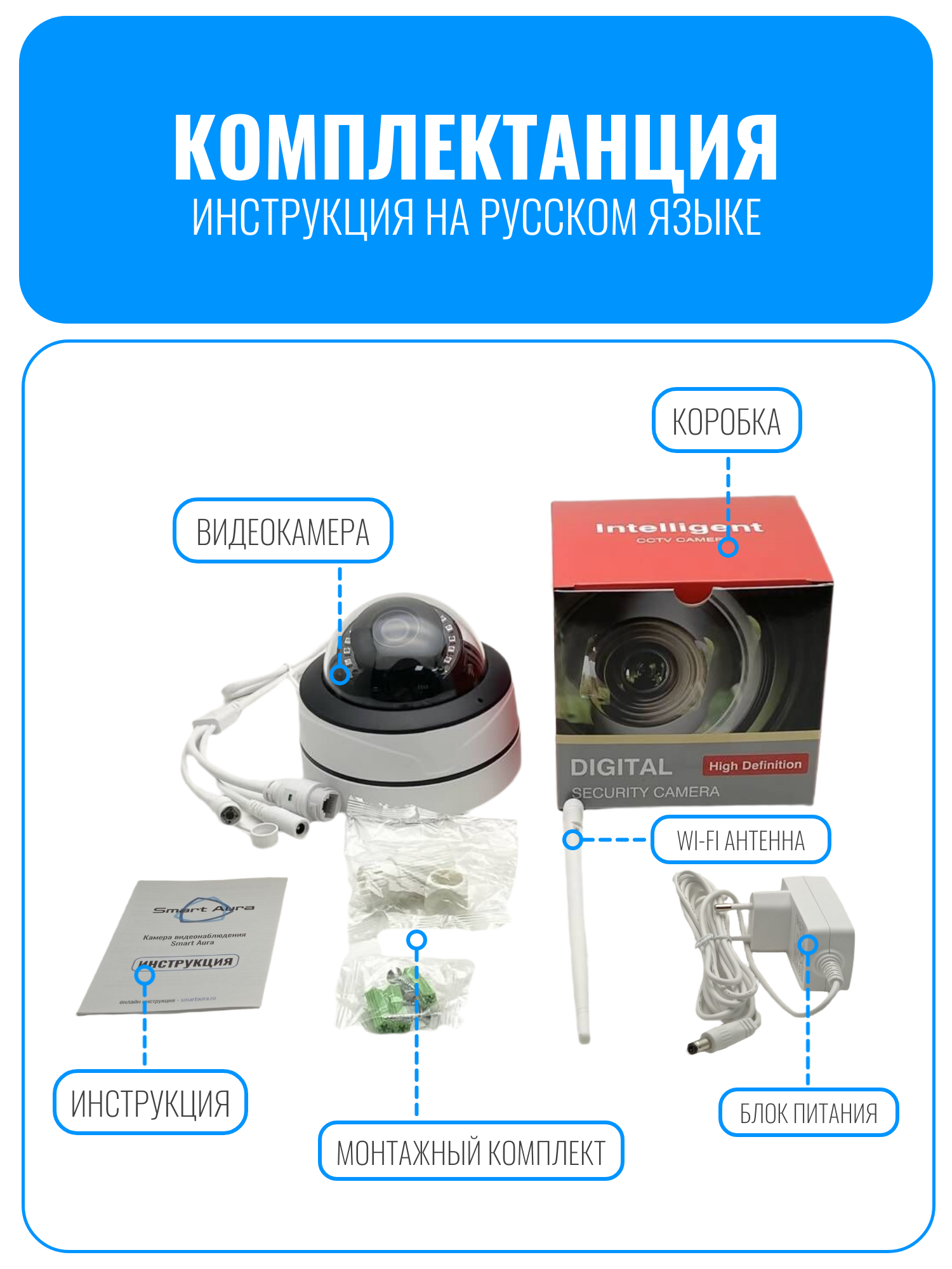 Видеокамера, блок питания, внешняя wi-fi антенна, монтажный комплект, инструкция