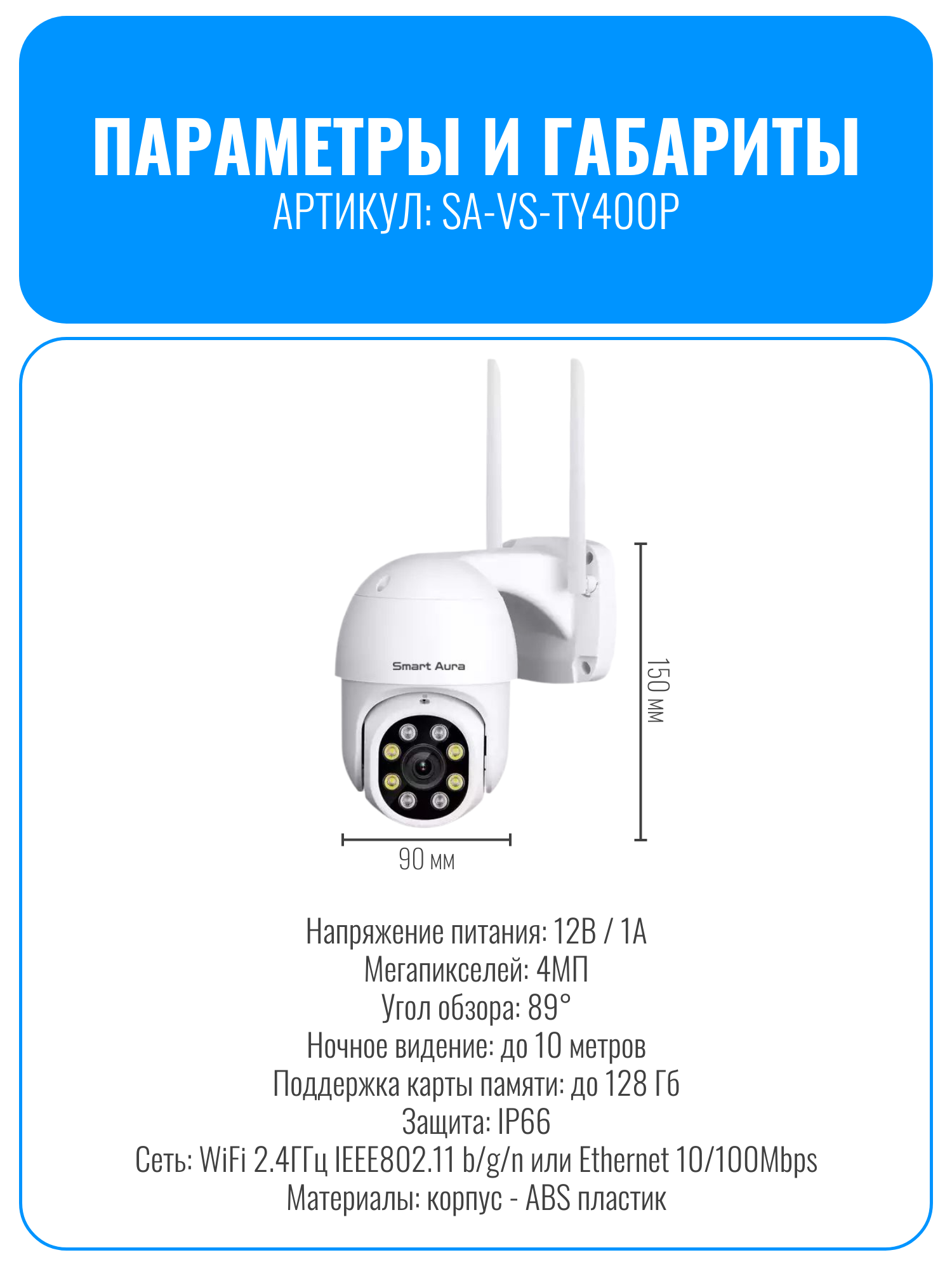 Камера видеонаблюдения Smart Aura SA-VS-TY400P — превосходное решение для обеспечения безопасности вашего объекта. Она обладает классом защиты IP66, что делает её устойчивой к погодным условиям. Камера подключается к интернету через Wi-Fi или LAN-кабель и управляется с помощью смартфонных приложений Smart Life или DIGMA Smartlife. Приложение позволяет пользователю поворачивать камеру на 355 градусов по горизонтали и 90 градусов по вертикали, что обеспечивает практически полный обзор территории.