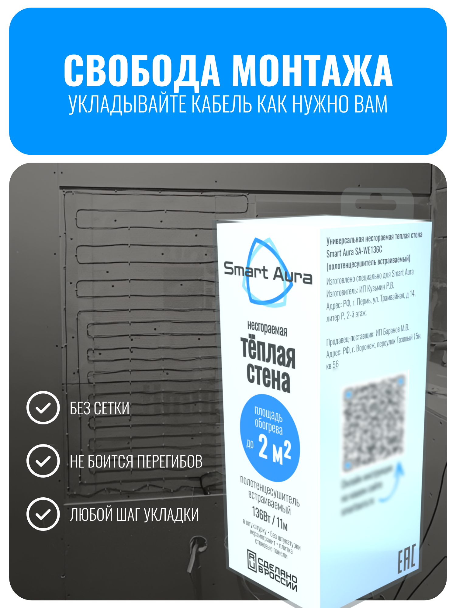 Полотенцесушитель встраиваемый Smart Aura SA-WE136C электрический представляет собой современное решение для обогрева стен, которое включает в себя комплект из 11 метров кабеля, способного покрыть площадь до 2 квадратных метров. Уникальность данного изделия заключается в его конструкции, которая предусматривает соединение секций кабеля длиной по 11 метров. Основным греющим элементом в этом устройстве является карбоновая сверхпрочная нить. Данная нить обладает высокой термостойкостью и выдерживает температуры до 985°С, что обеспечивает надежную защиту кабеля от перегрева и скачков напряжения.