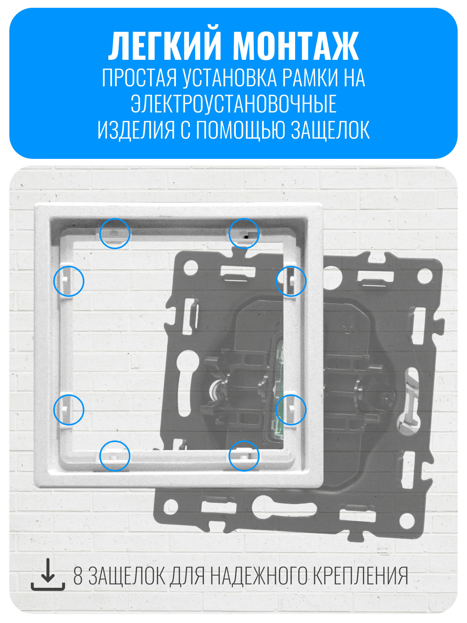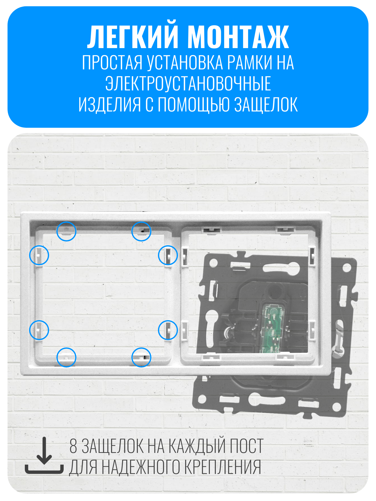 Каждый пост рамки имеет 8 защелок для легкого и надежного монтажа. А между отдельными элементами нет перегородок, что обеспечивает цельный и аккуратный внешний вид всей конструкции.