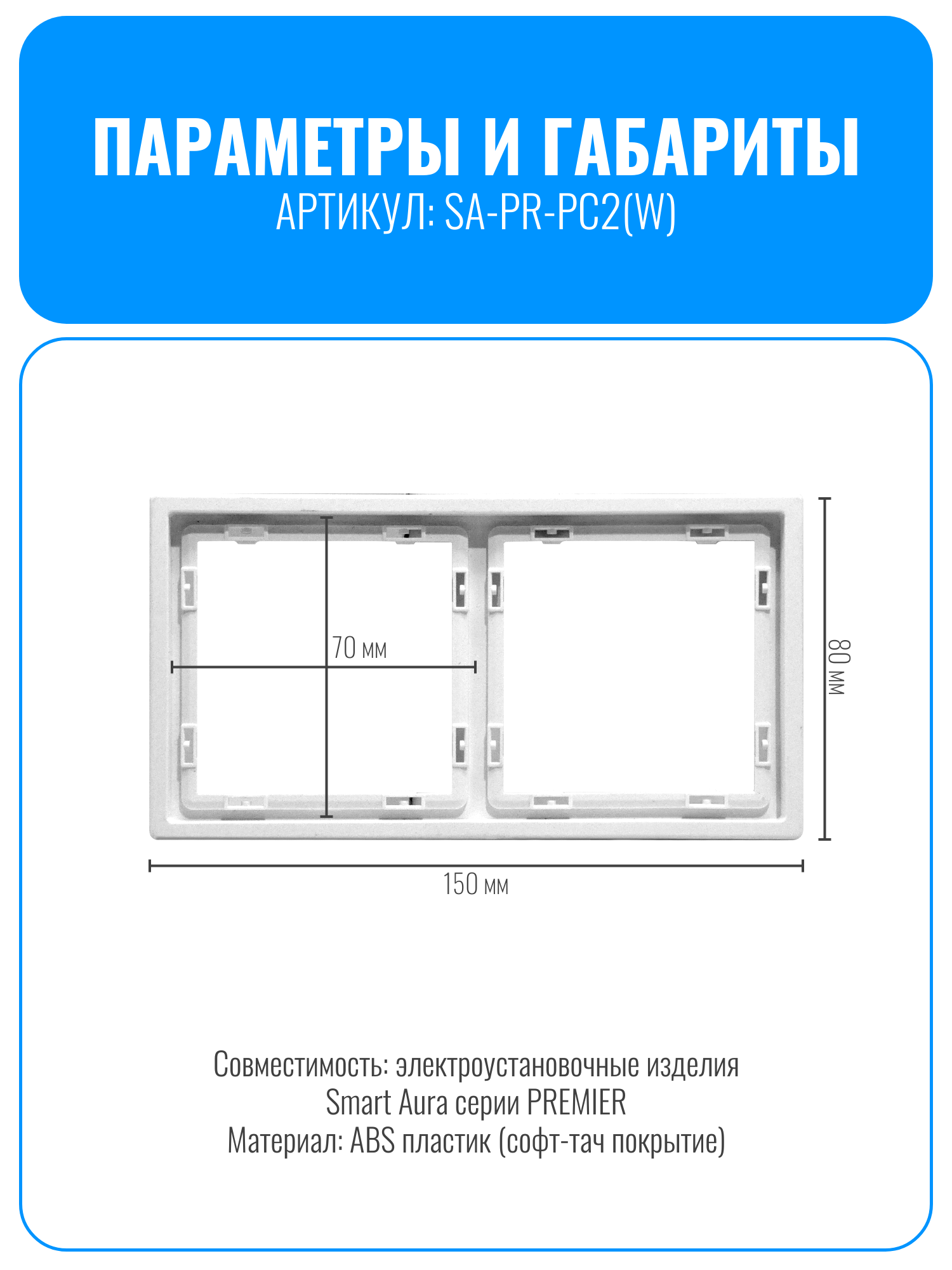 Эта рамка подходит для различных электроустановочных изделий бренда Smart Aura серии PREMIER: розеток, выключателей, диммеров и терморегуляторов.