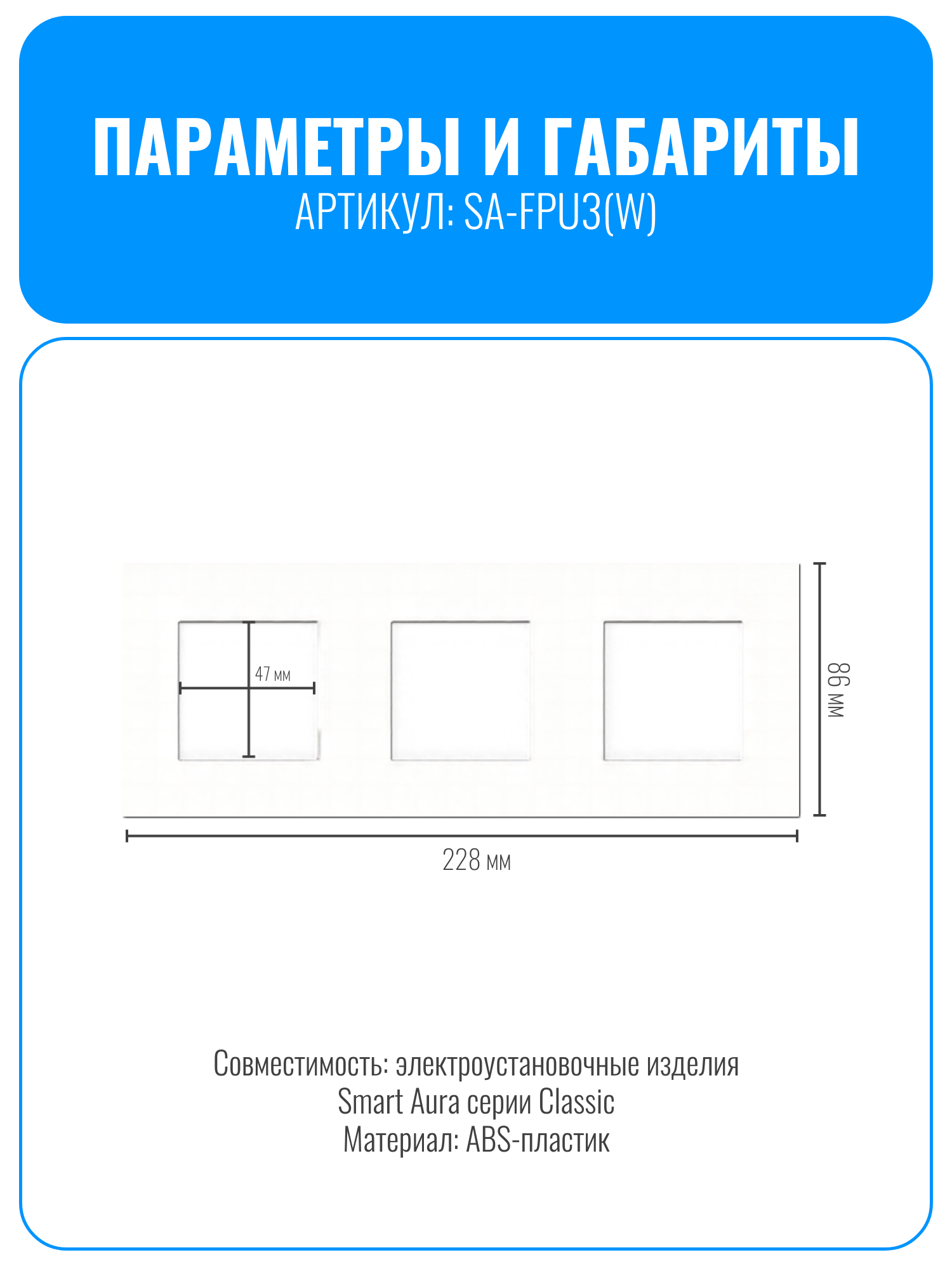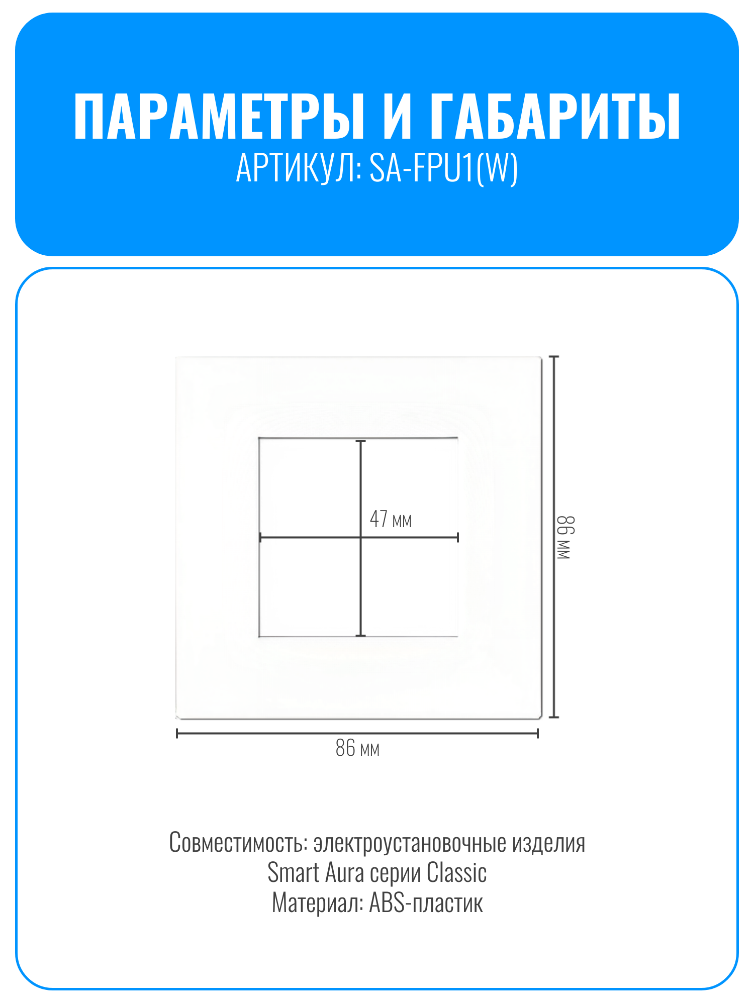Пластиковая рамка Smart Aura SA-FPU предназначена для электроустановочных изделий серии Classic компании Smart Aura. Изделие выполнено из прочного ABS-пластика с матовой поверхностью. Материал не выгорает на солнце и легко очищается.