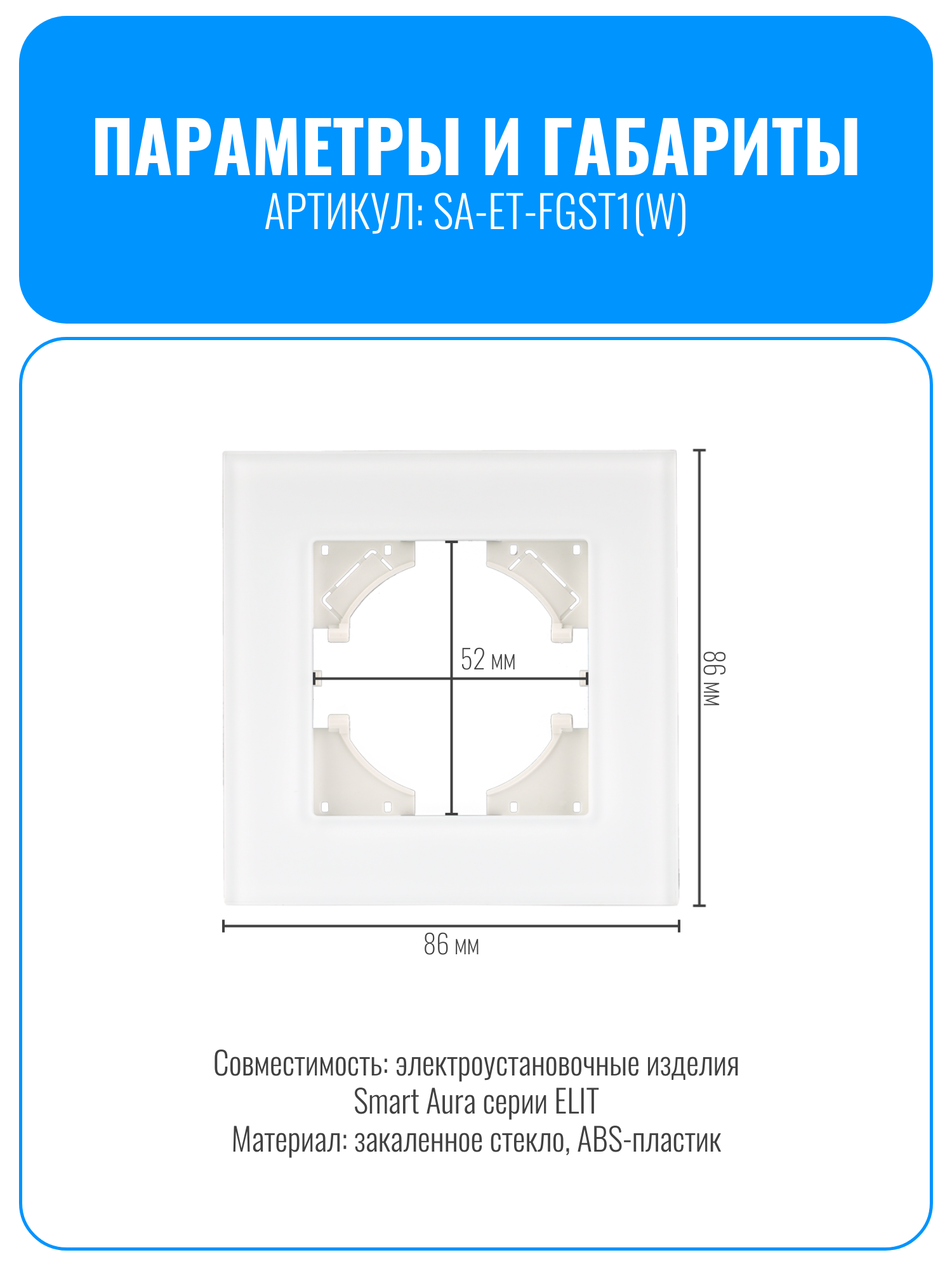 Рамка стеклянная софт-тач Smart Aura SA-ET-FGST предназначена для электроустановочных изделий из серии ELIT от компании Smart Aura. Эта рамка изготовлена из высококачественного закаленного стекла, что обеспечивает ей прочность и долговечность. Закаленное стекло отличается повышенной устойчивостью к механическим повреждениям и царапинам, что делает рамку надежным выбором для использования в различных условиях. Внимание! В комплекте только рамка!