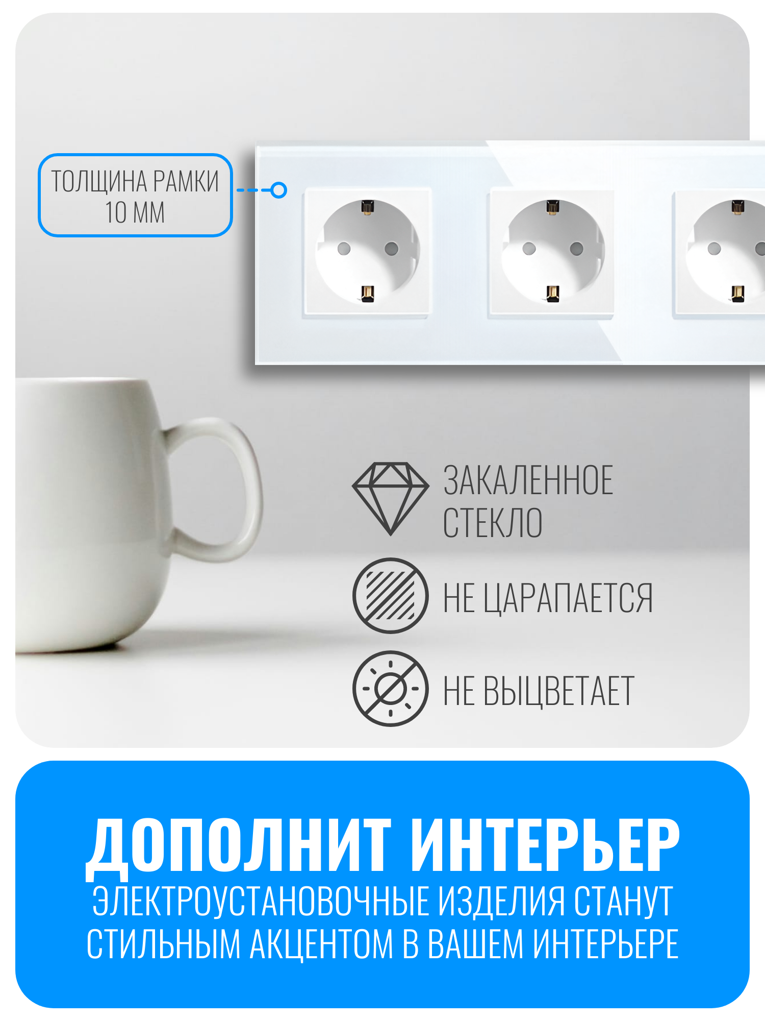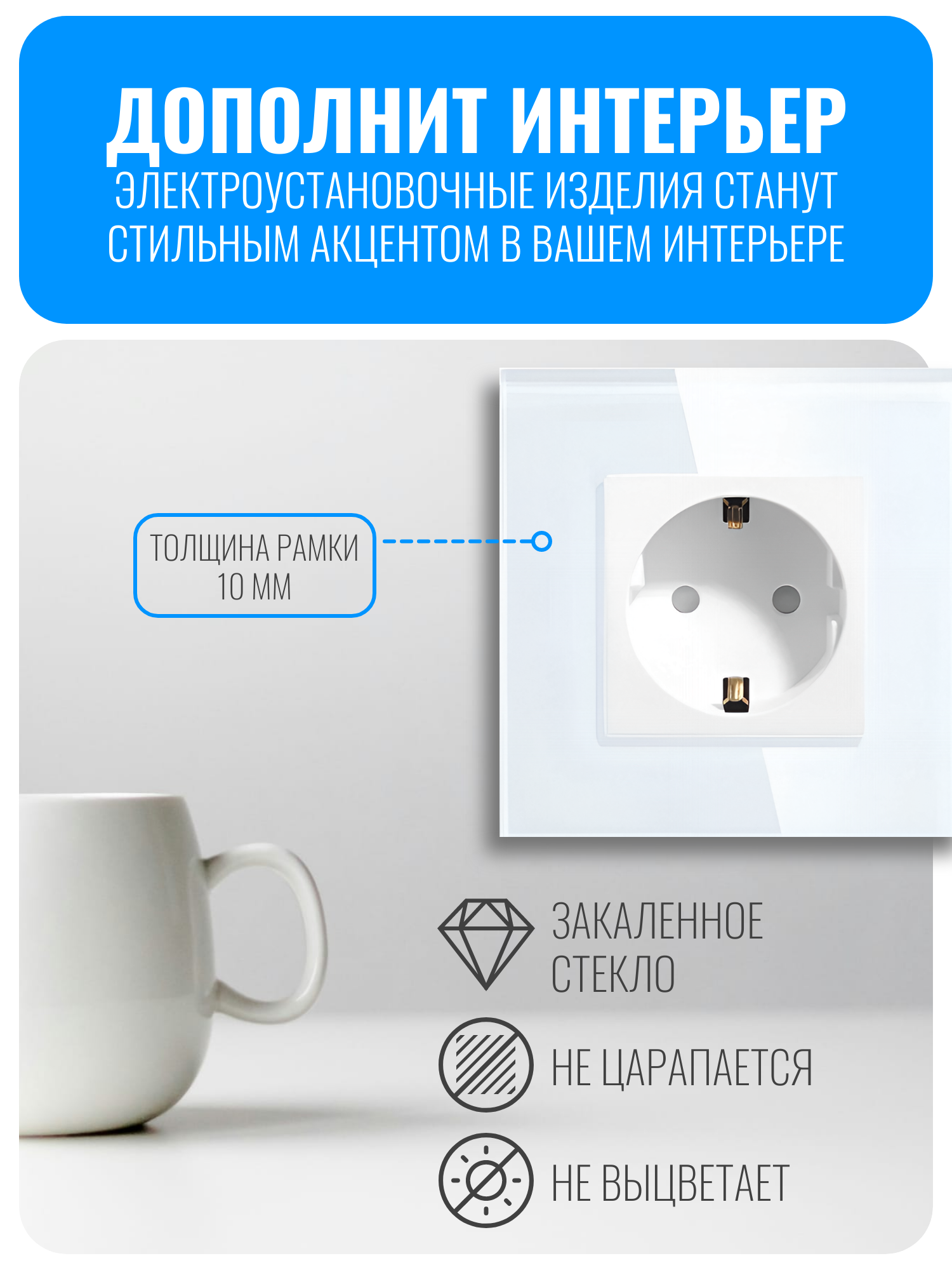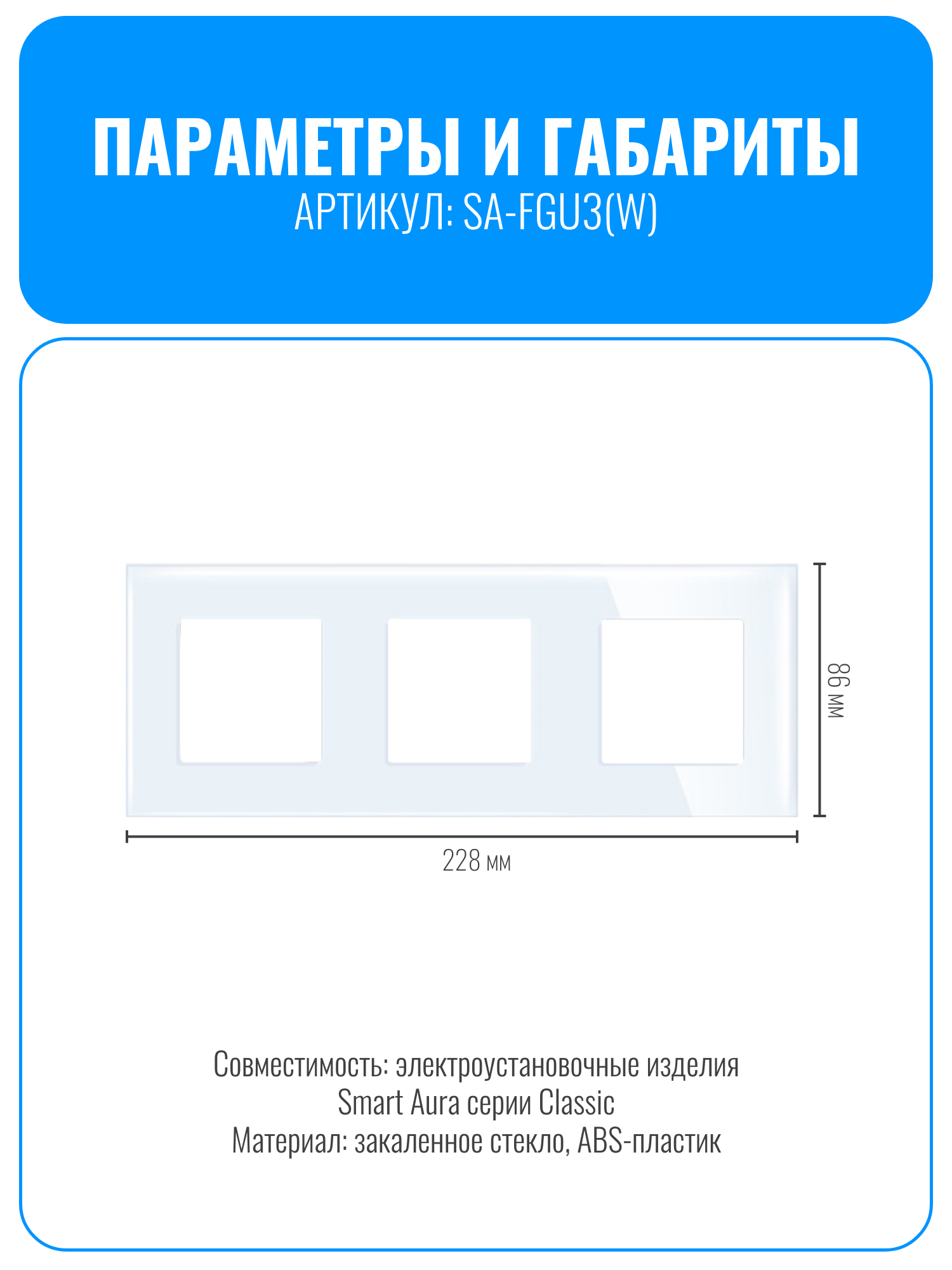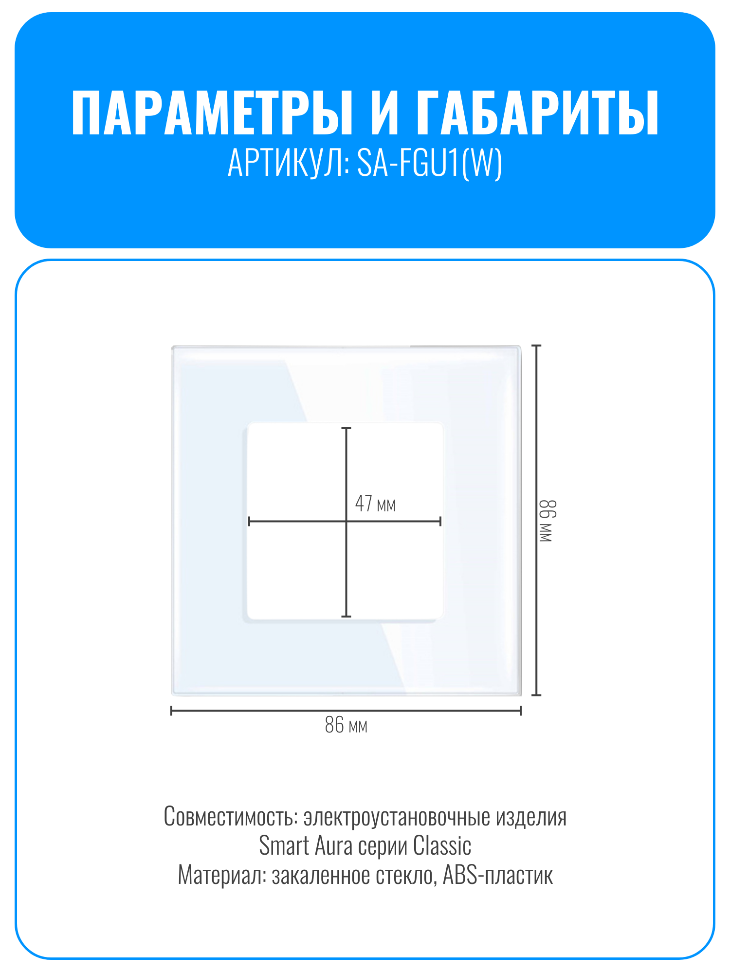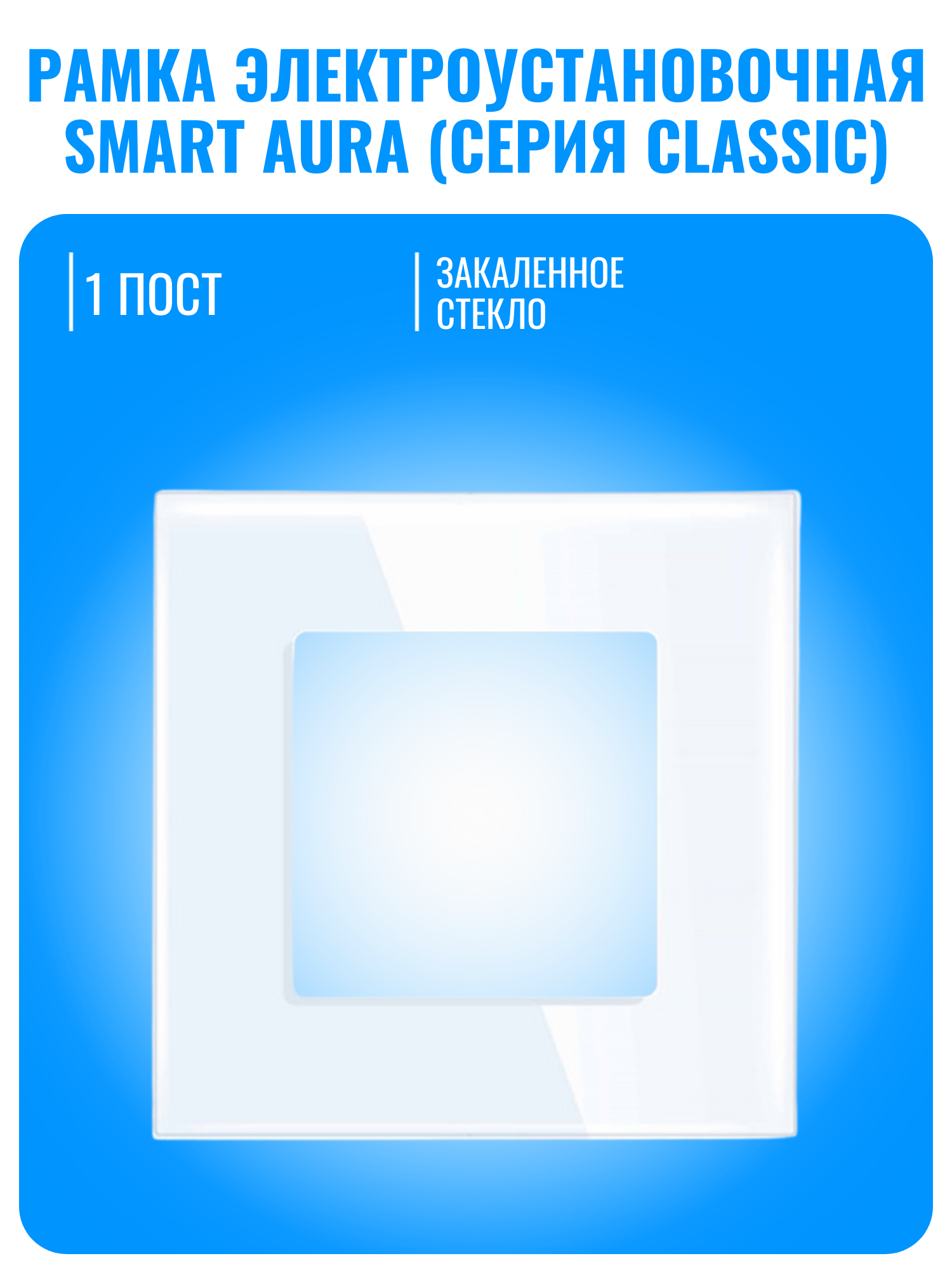 Стеклянная рамка Smart Aura SA-FGU разработана для электроустановочных изделий серии Classic от компании Smart Aura. Она изготовлена из закаленного стекла, что обеспечивает устойчивость к царапинам и облегчает уход за изделием.