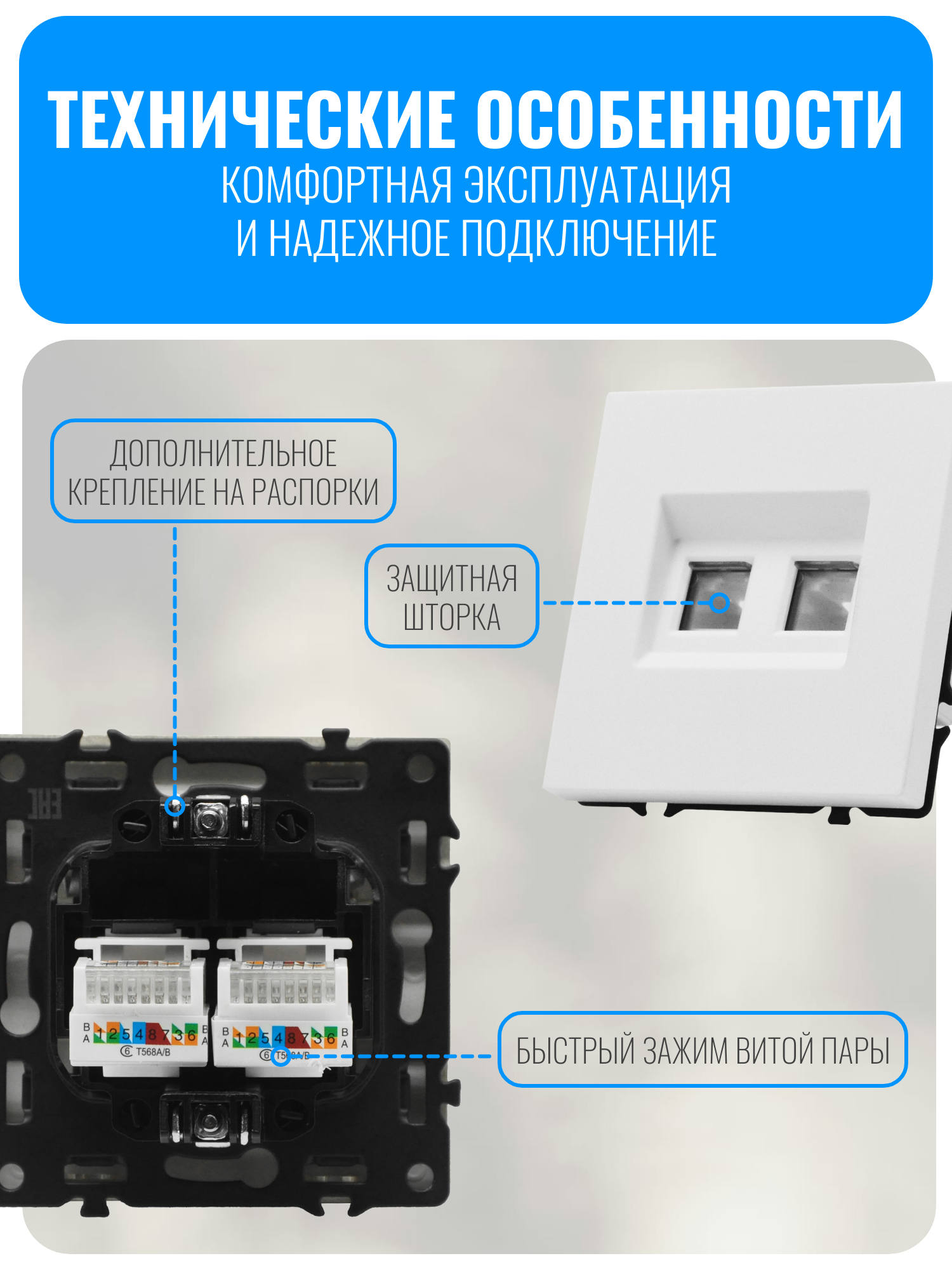 Розетка двойная интернет Smart Aura SA-PR-2CAT6 с разъемом RJ45 серии PREMIER - предназначена для подключения к локальной сети Ethernet. Розетка оснащена двумя разъемами стандарта RJ45, который поддерживает работу с кабелями категории 6 (CAT6). Такая категория кабеля обеспечивает высокую скорость передачи данных и стабильное соединение, что особенно важно для работы в офисе или дома. Эта модель отличается современным дизайном, который гармонично впишется в любой интерьер. Особое внимание в серии PREMIER уделено внешнему виду — рамка розетки имеет минимальную толщину, благодаря чему изделие выглядит элегантно и аккуратно на стене.