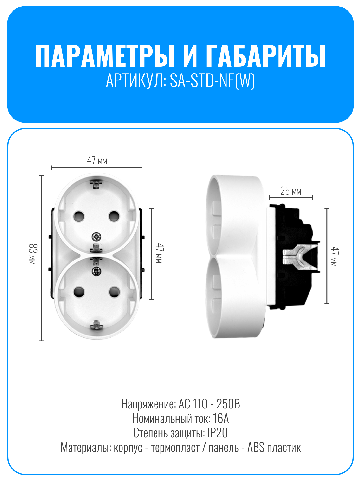 Розетка двойная в один пост Smart Aura SA-STD-NF из серии Classic — это отдельный электрический модуль, который можно установить в рамку на один или до пяти постов, чтобы подобрать оптимальное решение для любого помещения. Данный блок двойной розетки монтируется в одно посадочное место, что помогает освободить пространство в рамке.