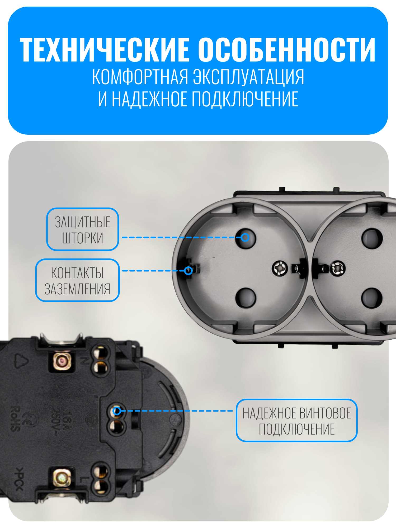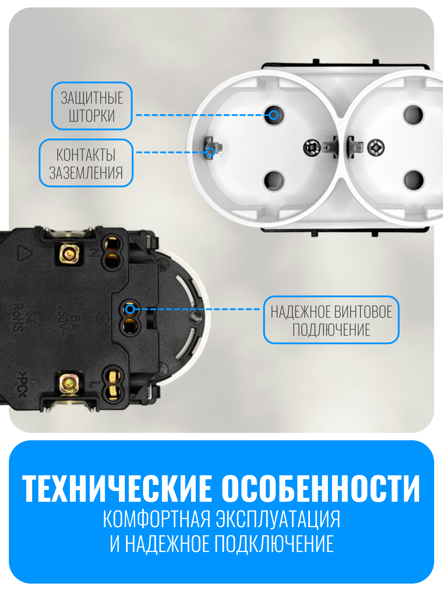 В устройстве предусмотрен контакт для заземления, что делает эксплуатацию бытовых приборов более безопасной. Встроенные защитные шторки уменьшают риск случайного соприкосновения с токопроводящими частями, что особенно важно для семей с детьми. Корпус выполнен из прочного ABS-пластика, отличающегося устойчивостью к износу. Для подключения используется винтовой зажим, который обеспечивает крепкую фиксацию проводов и помогает предотвратить возможные поломки или короткие замыкания.
