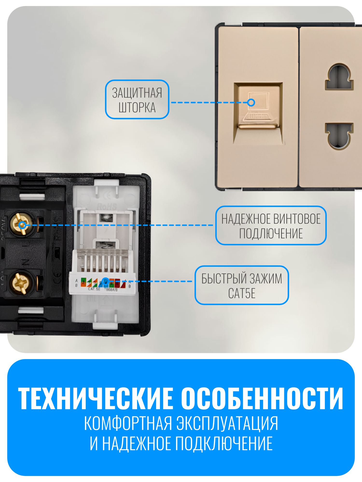 Розетка комбинированная 220В и интернет Smart Aura SA-STCAT5-MD из серии Classic предназначена для удобного и безопасного подключения бытовых и сетевых устройств. Она оснащена стандартной электрической розеткой на 220 вольт, а также разъёмом RJ-45 для подключения к локальной сети или интернету. Такое сочетание позволяет одновременно подключать, например, роутер к электропитанию и сети передачи данных, занимая только лишь один пост в электроустановочной рамке. Модуль можно установить в рамку на один или до пяти постов, чтобы подобрать оптимальное решение для любого помещения
