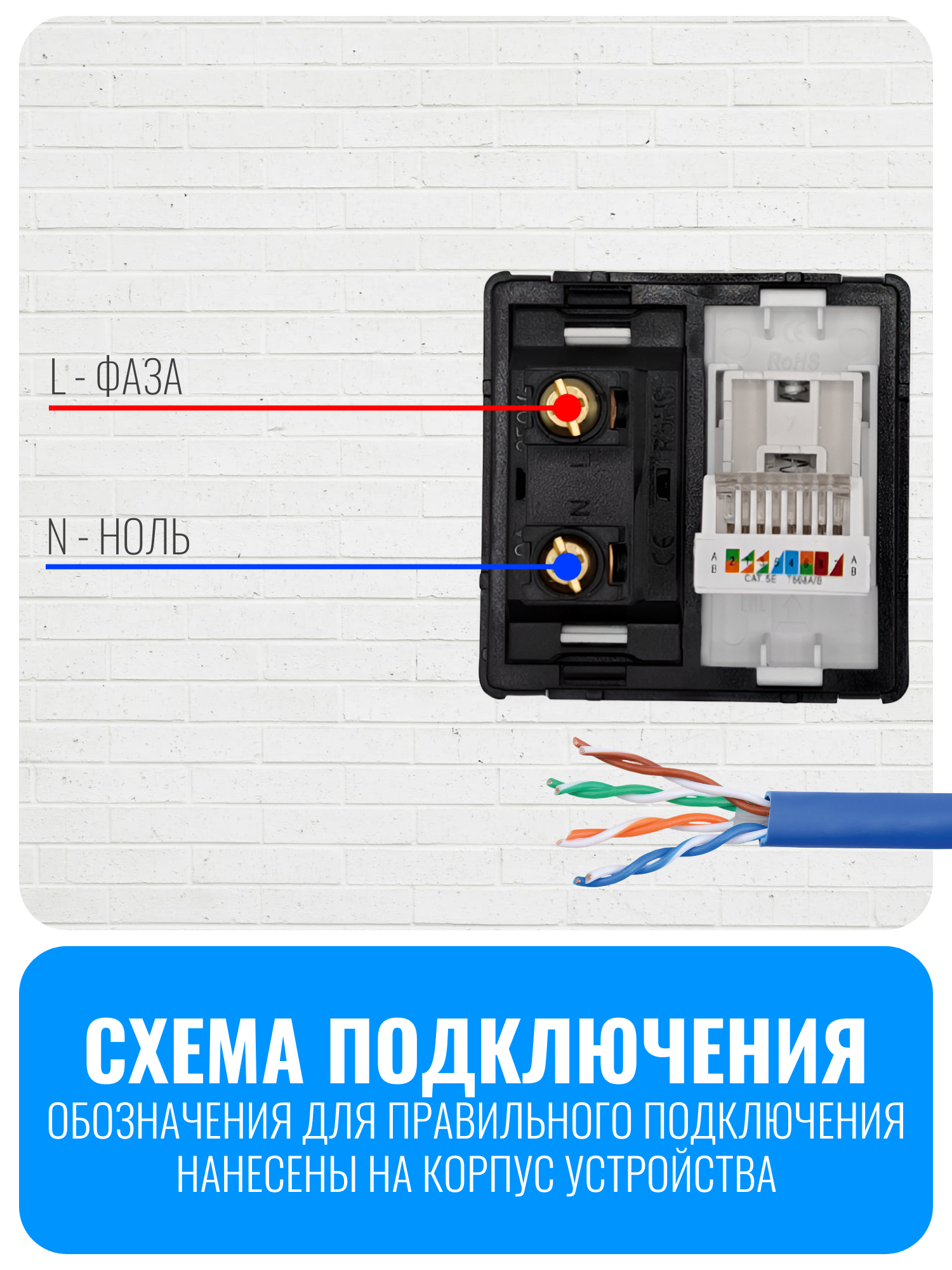 Корпус выполнен из прочного ABS-пластика, отличающегося устойчивостью к износу. Для подключения к сети 220 В применяется винтовой зажим. Он надежно фиксирует провода и предотвращает их ослабление. Для подключения интернет-кабеля используется быстрый зажим стандарта CAT5E, что обеспечивает удобство и стабильное соединение.