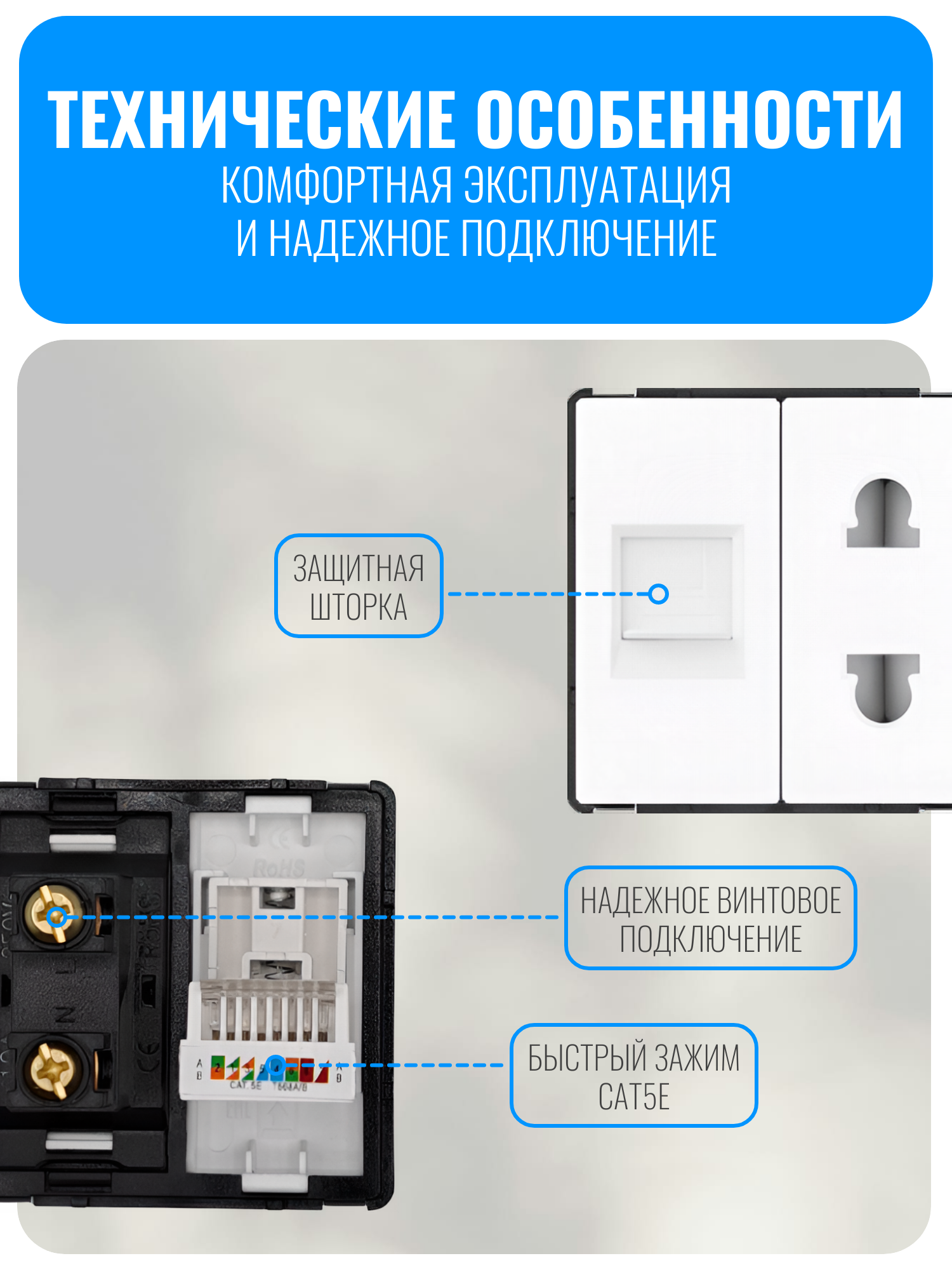 Корпус выполнен из прочного ABS-пластика, отличающегося устойчивостью к износу. Для подключения к сети 220 В применяется винтовой зажим. Он надежно фиксирует провода и предотвращает их ослабление. Для подключения интернет-кабеля используется быстрый зажим стандарта CAT5E, что обеспечивает удобство и стабильное соединение.