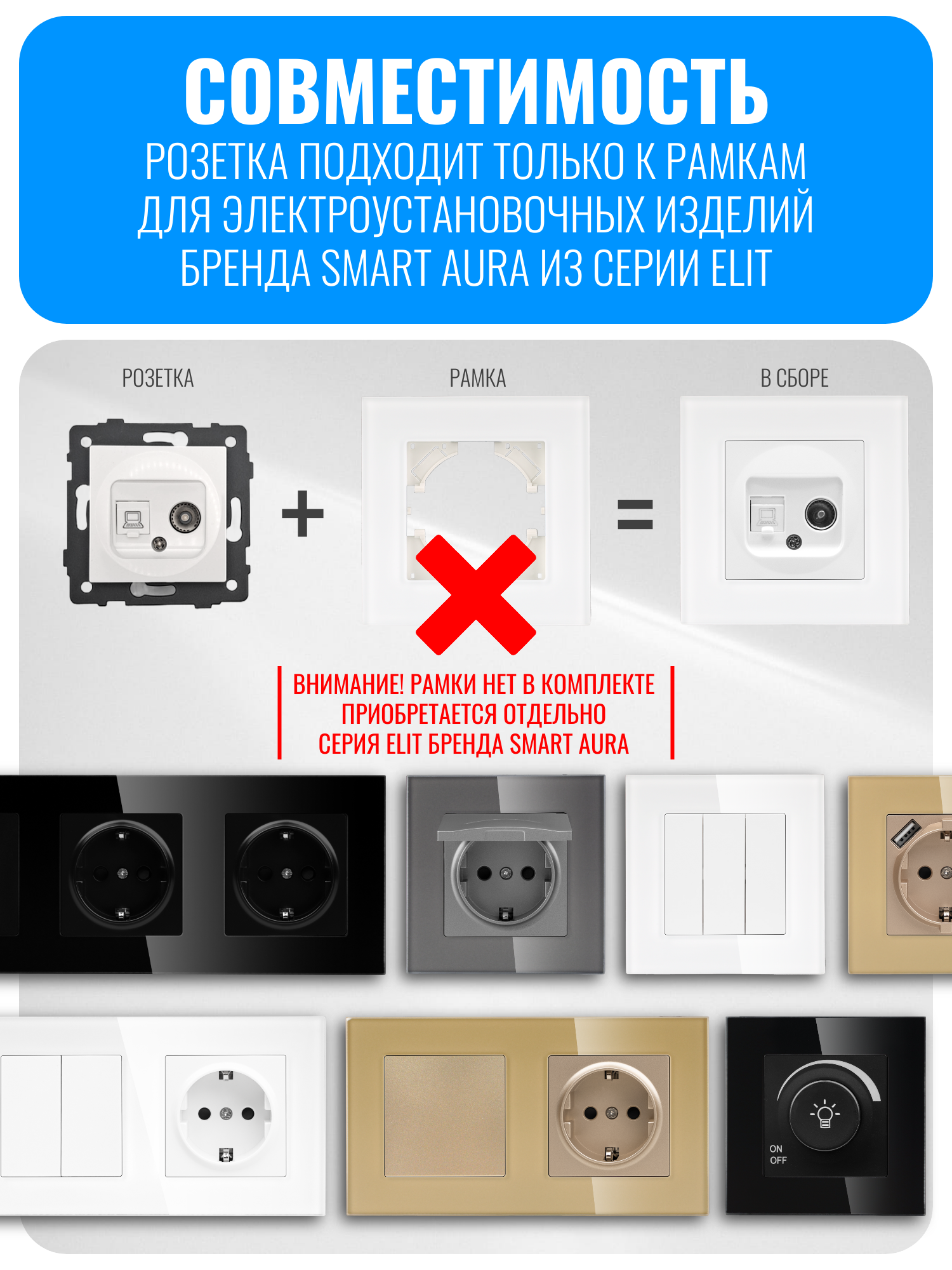 Внимание! Рамки нет в комплекте, приобретается отдельно. Совместимо с рамкой Smart Aura серии ELIT: SA-ET-FG, SA-ET-FGST, SA-ET-FGR, SA-ET-FAС, SA-ET-FAB, SA-ET-FAR, SA-ET-FAST, SA-ET-FP, SA-ET-FPB, SA-ET-FW.
