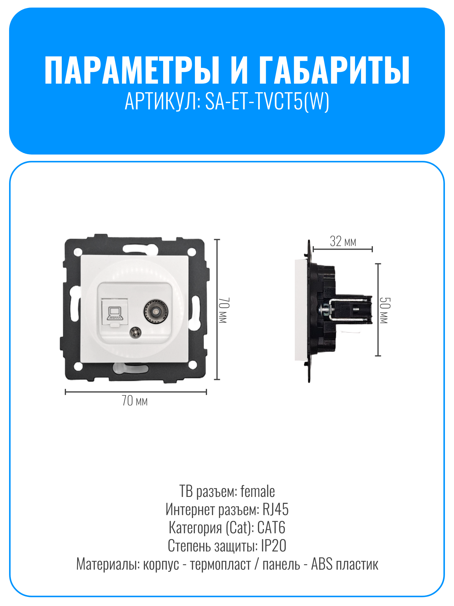 Розетка комбинированная телевизионная и интернет Smart Aura SA-ET-TVCT5 серии ELIT представляет собой многофункциональное устройство, предназначенное для удобного подключения как телевизионного, так и интернет-оборудования. Этот модуль позволяет подключить телевизионную антенну к телевизору, обеспечивая стабильный и качественный прием телевизионного сигнала. Кроме того, он оснащен разъемом RJ45, который предназначен для подключения интернет-кабеля.