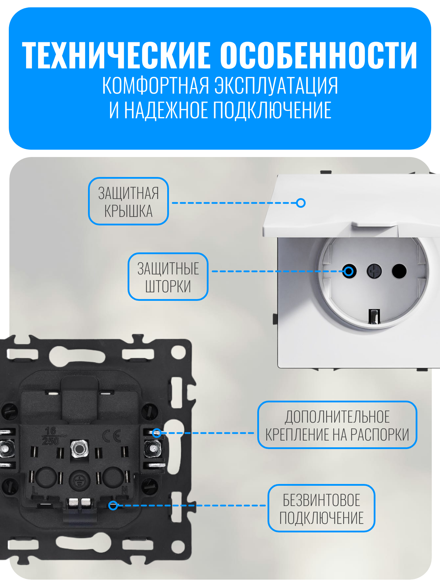 Розетка подходит как для вертикального, так и для горизонтального монтажа. Для повышения безопасности эксплуатации предусмотрен заземляющий контакт, который защищает пользователя от поражения электрическим током в случае неисправности прибора. Также в конструкции розетки есть защитные шторки. Они закрывают отверстия, когда розетка не используется, и предотвращают случайное попадание посторонних предметов внутрь, что особенно важно для семей с детьми.