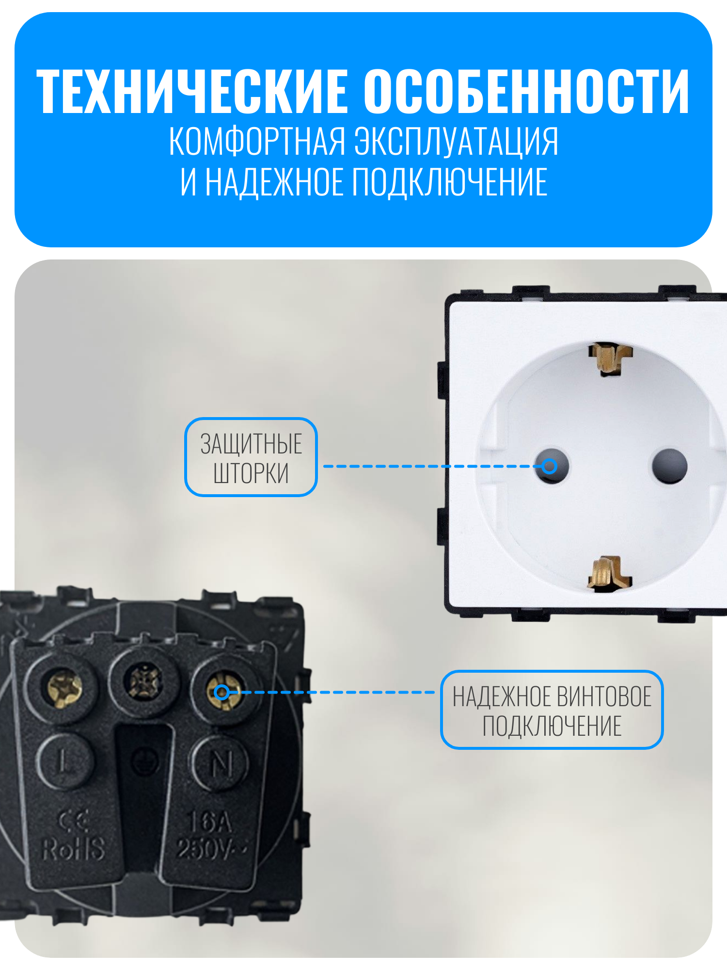 В устройстве предусмотрен контакт для заземления, что делает эксплуатацию бытовых приборов более безопасной. Встроенные защитные шторки уменьшают риск случайного соприкосновения с токопроводящими частями, что особенно важно для семей с детьми. Корпус выполнен из прочного ABS-пластика, отличающегося устойчивостью к износу. Для подключения используется винтовой зажим, который обеспечивает крепкую фиксацию проводов и помогает предотвратить возможные поломки или короткие замыкания.