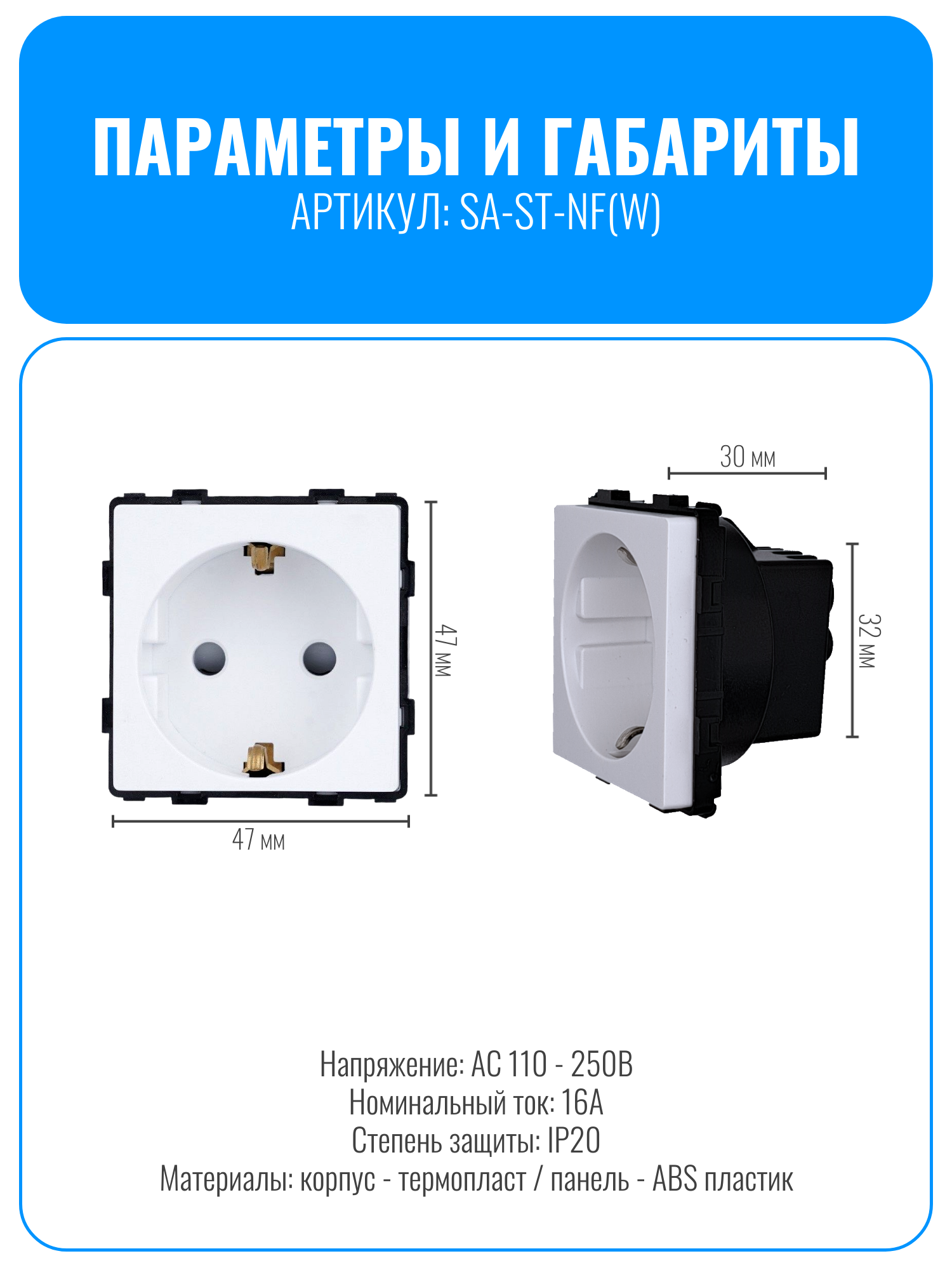 Розетка Smart Aura SA-ST-NF из серии Classic — это отдельный электрический модуль, который можно установить в рамку на один или до пяти постов, чтобы подобрать оптимальное решение для любого помещения.