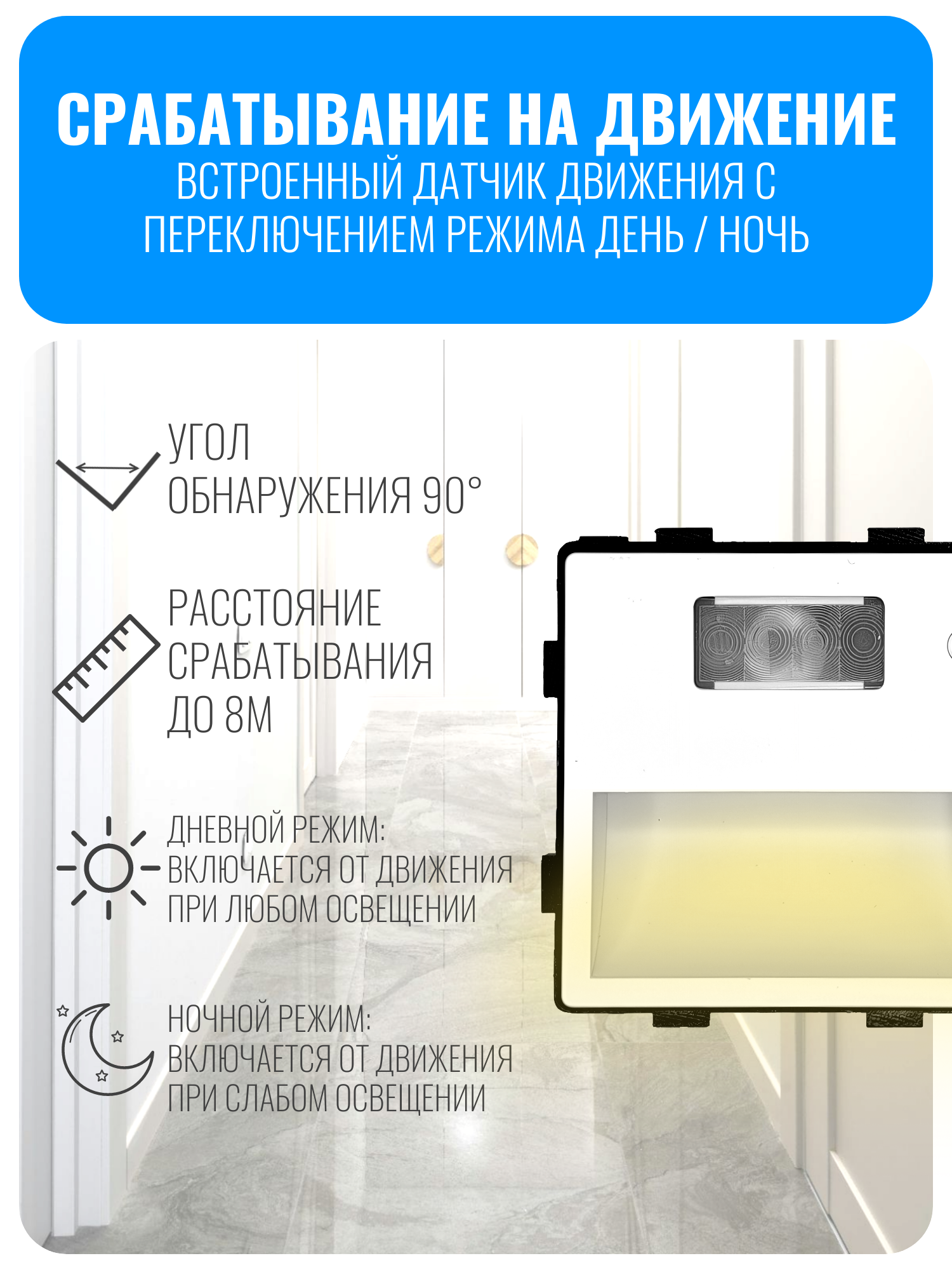 светильник встраиваемы, светильник для лестницы, светильник с датчиком движения, подсветка лестницы