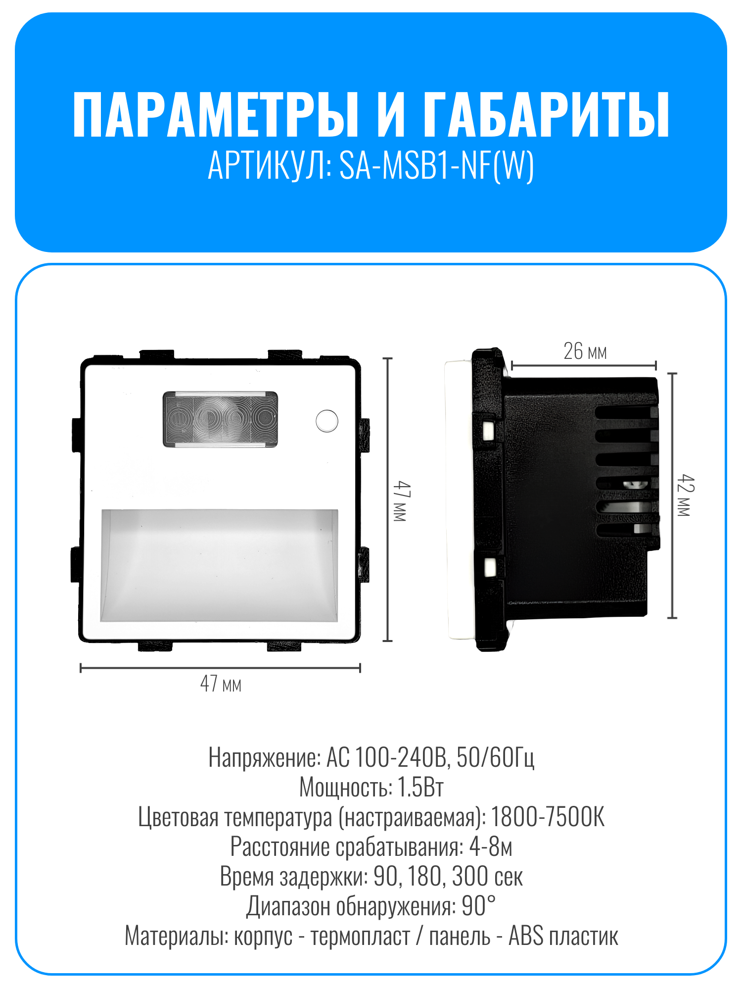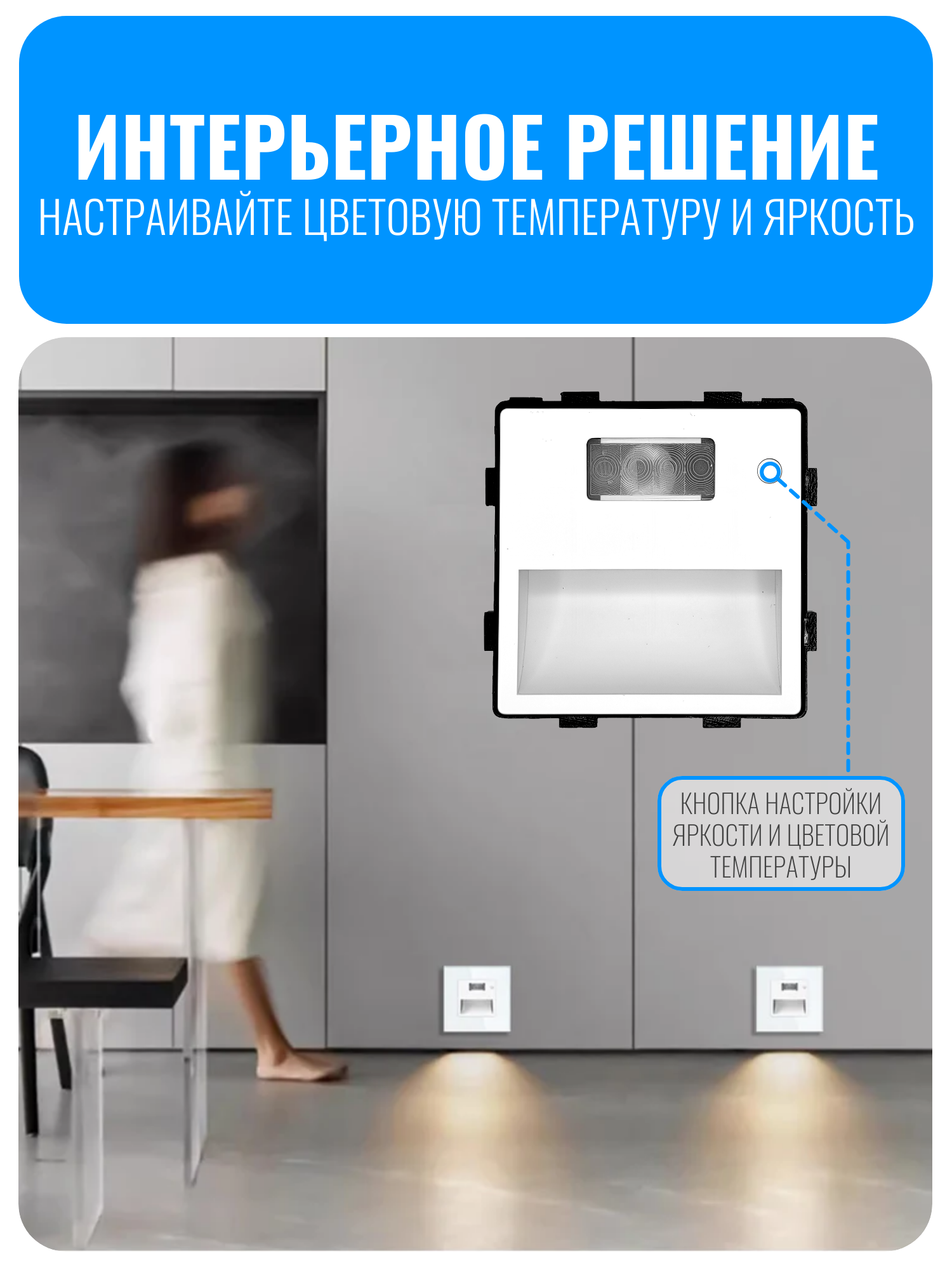 Светильник оснащен датчиком движения, который реагирует на движение на расстоянии до 8 метров. Это позволяет экономить электроэнергию, так как светильник включается только при наличии движения. Два режима работы светильника - дневной и ночной. В дневном режиме светильник включается от датчика движения при любом освещении, а в ночном - только при слабом освещении. Это позволяет создать комфортное освещение в зависимости от времени суток. Настройка цветовой температуры от 1800 до 7500К позволяет выбрать наиболее подходящий для вас оттенок света. Выбор задержки свечения позволяет настроить время работы светильника после включения. Мощность всего 1,5Вт достаточно для акцентного освещения и отлично экономит электроэнергию.