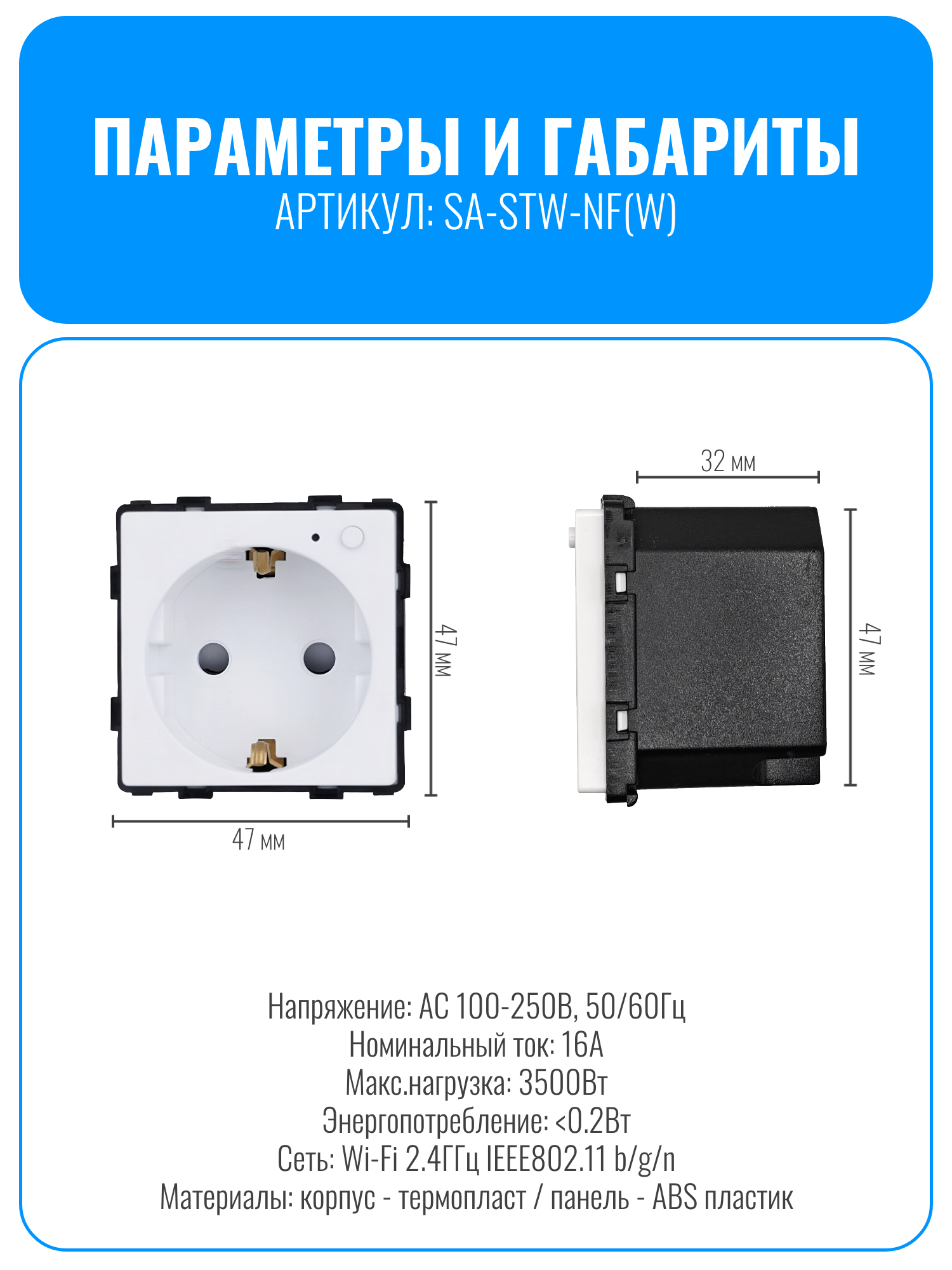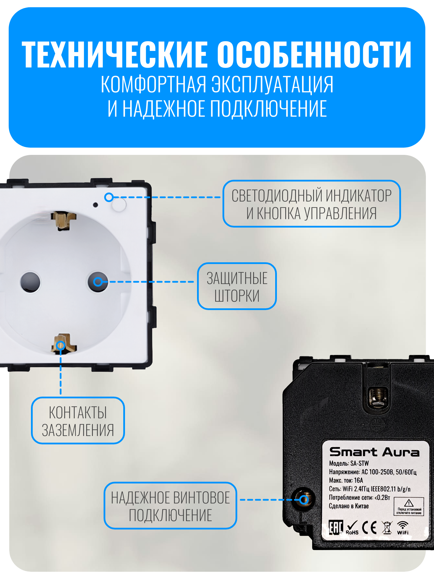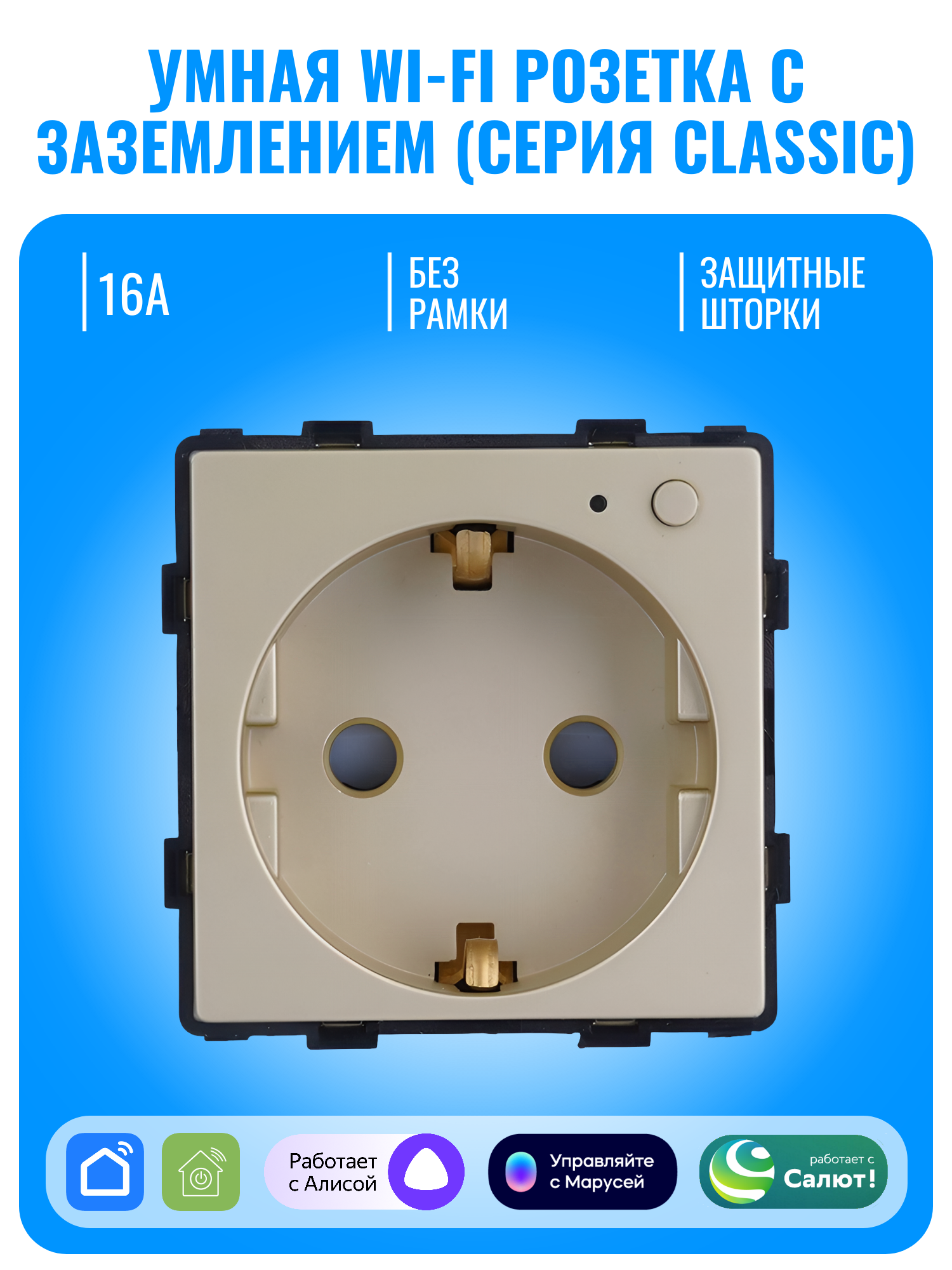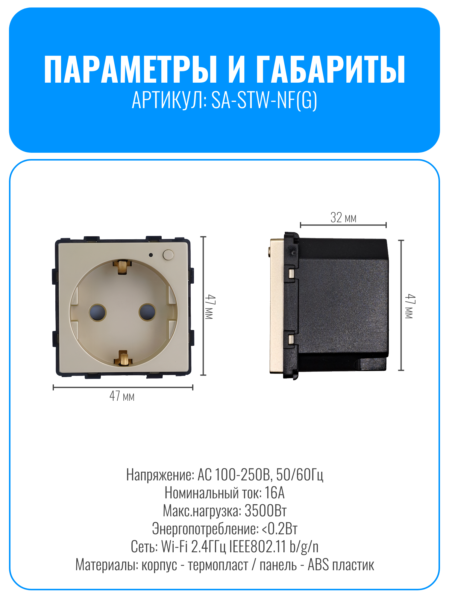 Умная Wi-Fi розетка Smart Aura SA-STW-NF серии Classic предназначена для автоматизации бытовых электроприборов. С ее помощью можно удаленно включать и выключать устройства, а также настраивать таймеры и индивидуальные сценарии работы. Управлять розеткой можно тремя способами: с помощью кнопки на корпусе, через мобильное приложение или с помощью голосовых команд.