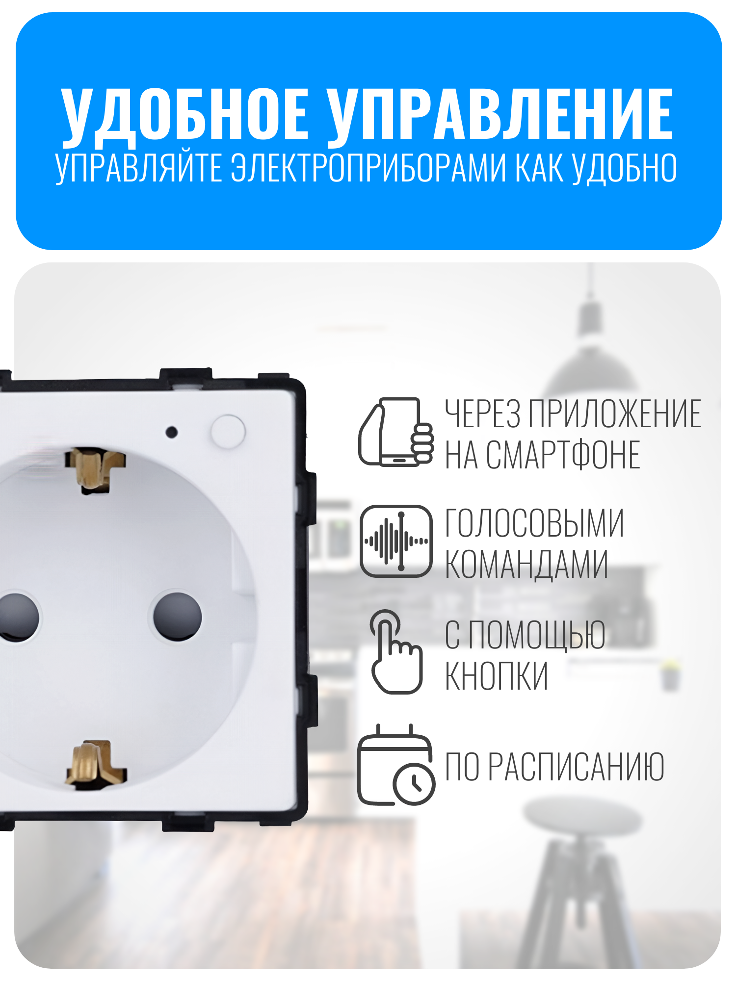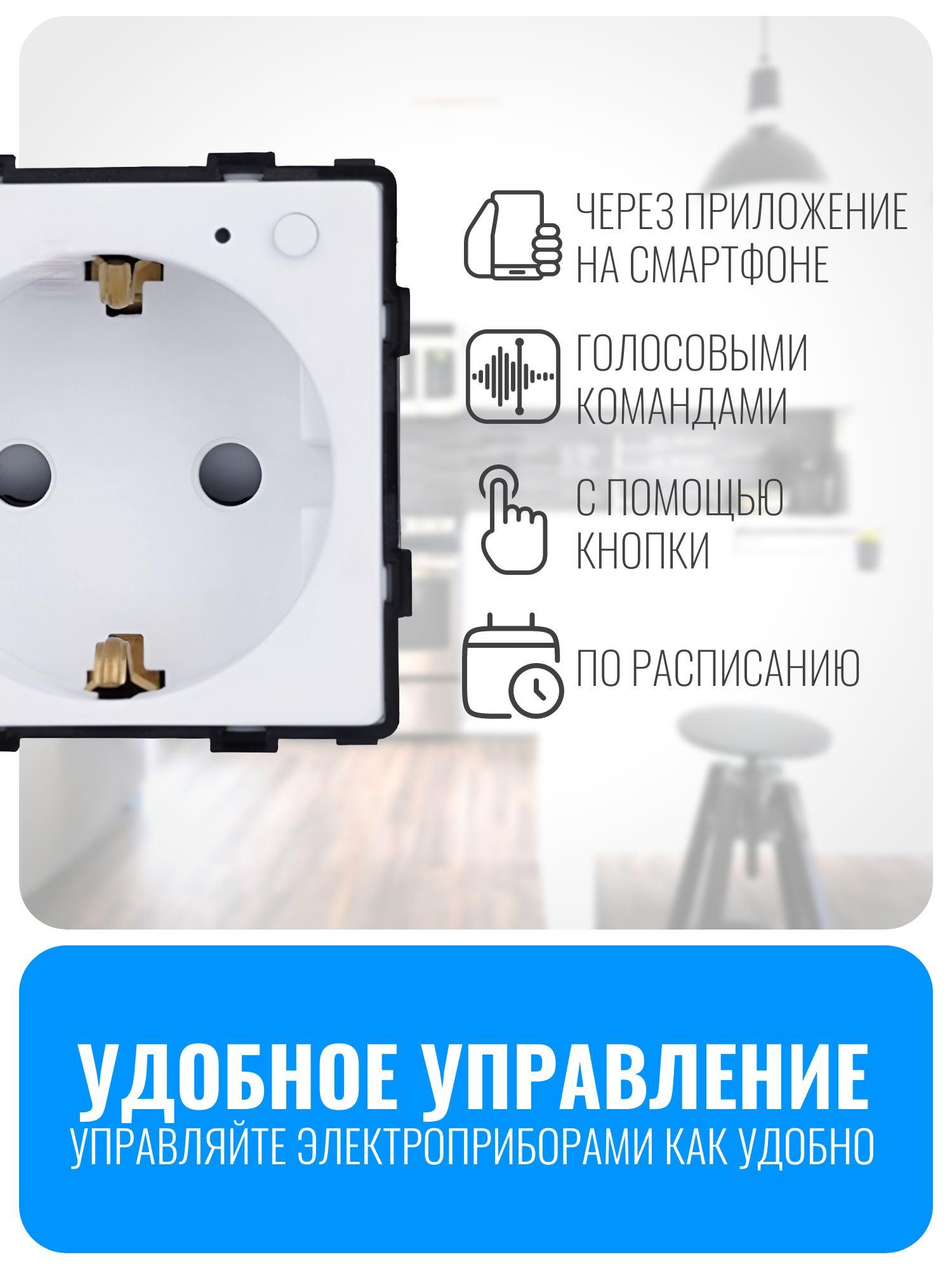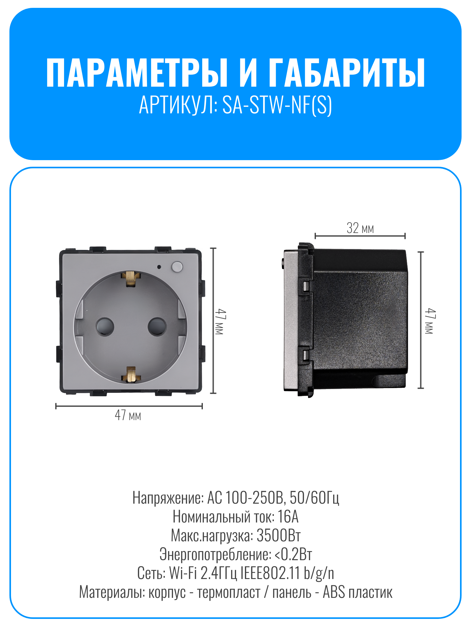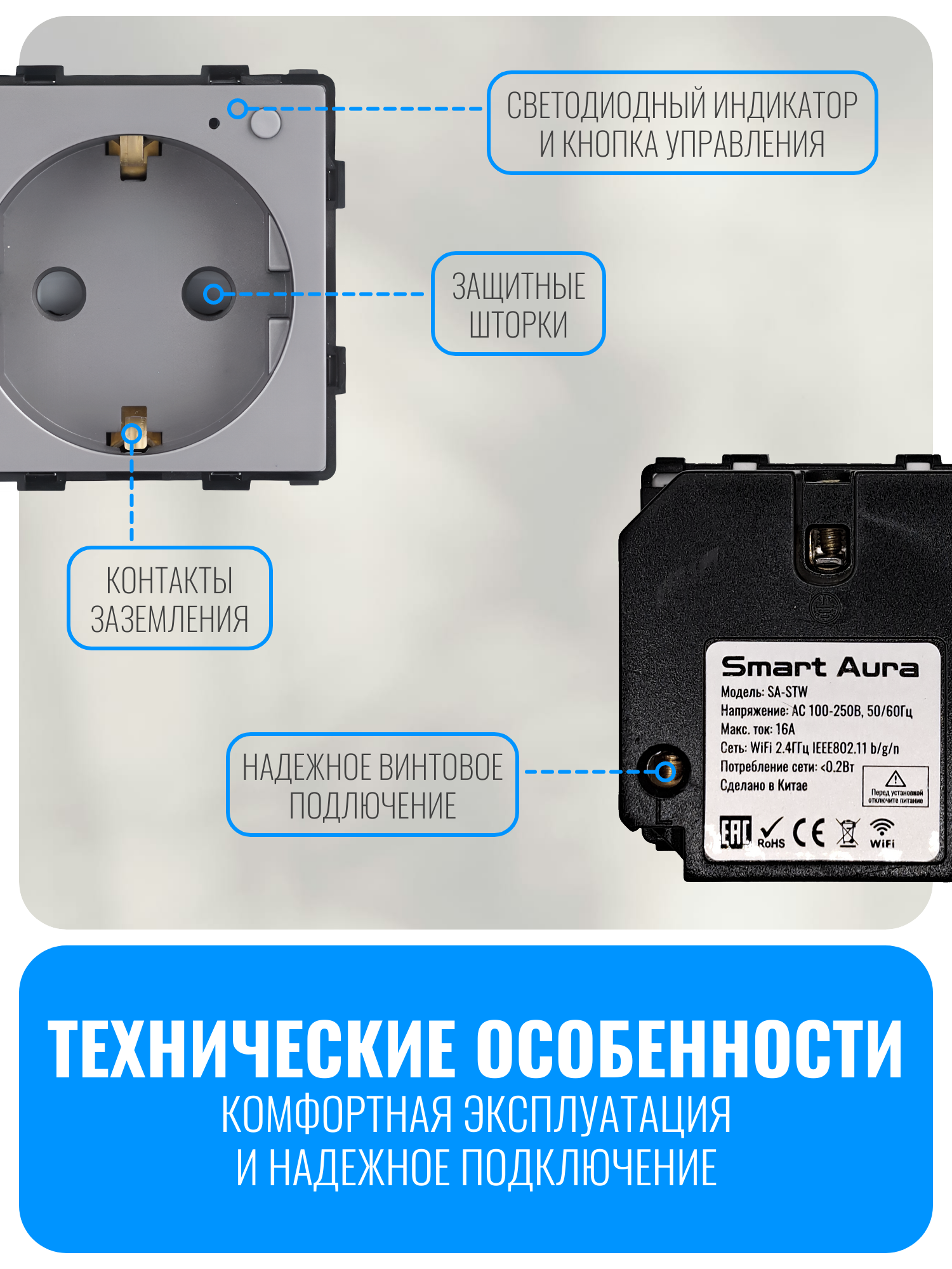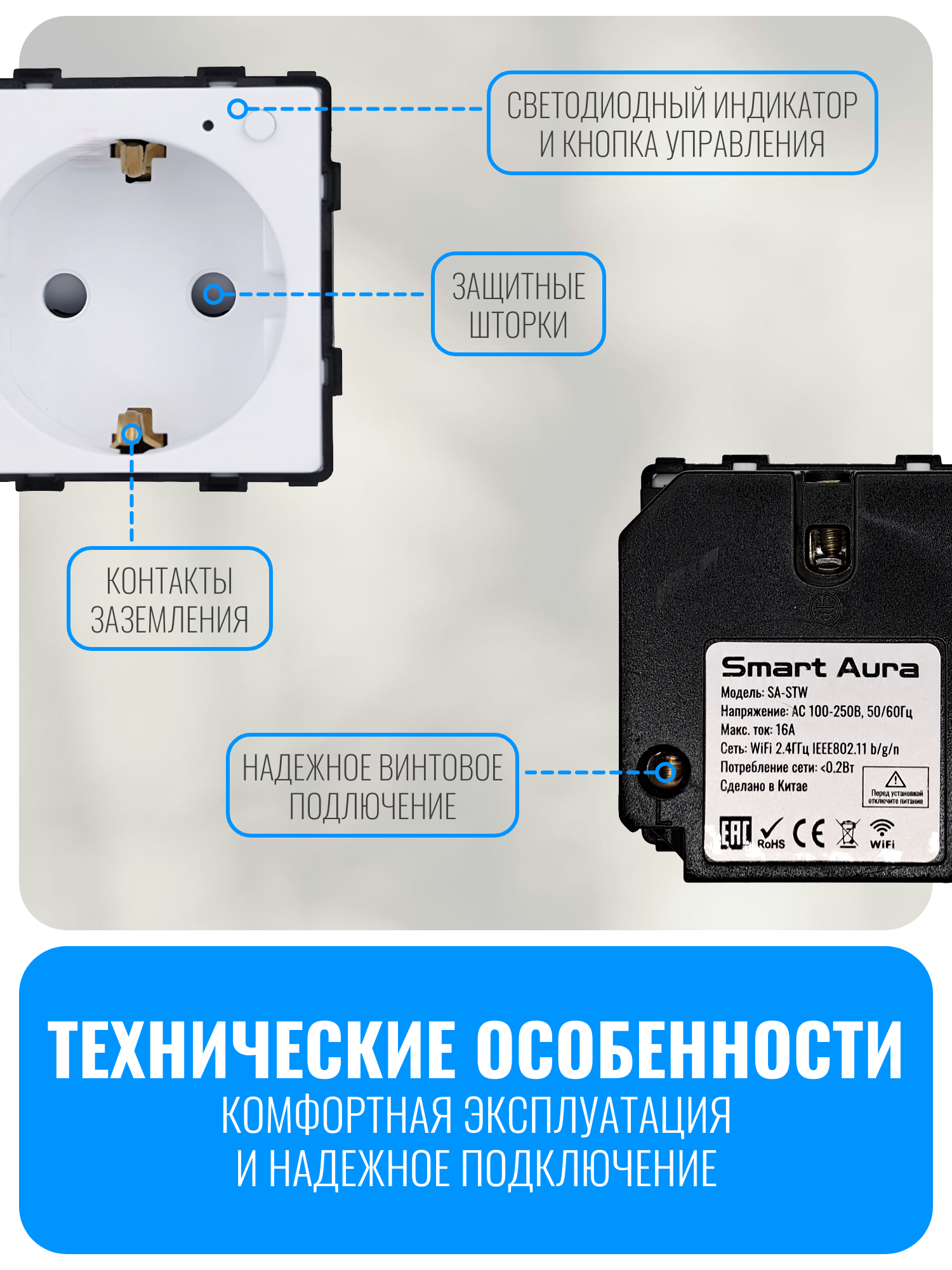 Умная Wi-Fi розетка Smart Aura SA-STW-NF серии Classic предназначена для автоматизации бытовых электроприборов. С ее помощью можно удаленно включать и выключать устройства, а также настраивать таймеры и индивидуальные сценарии работы. Управлять розеткой можно тремя способами: с помощью кнопки на корпусе, через мобильное приложение или с помощью голосовых команд.