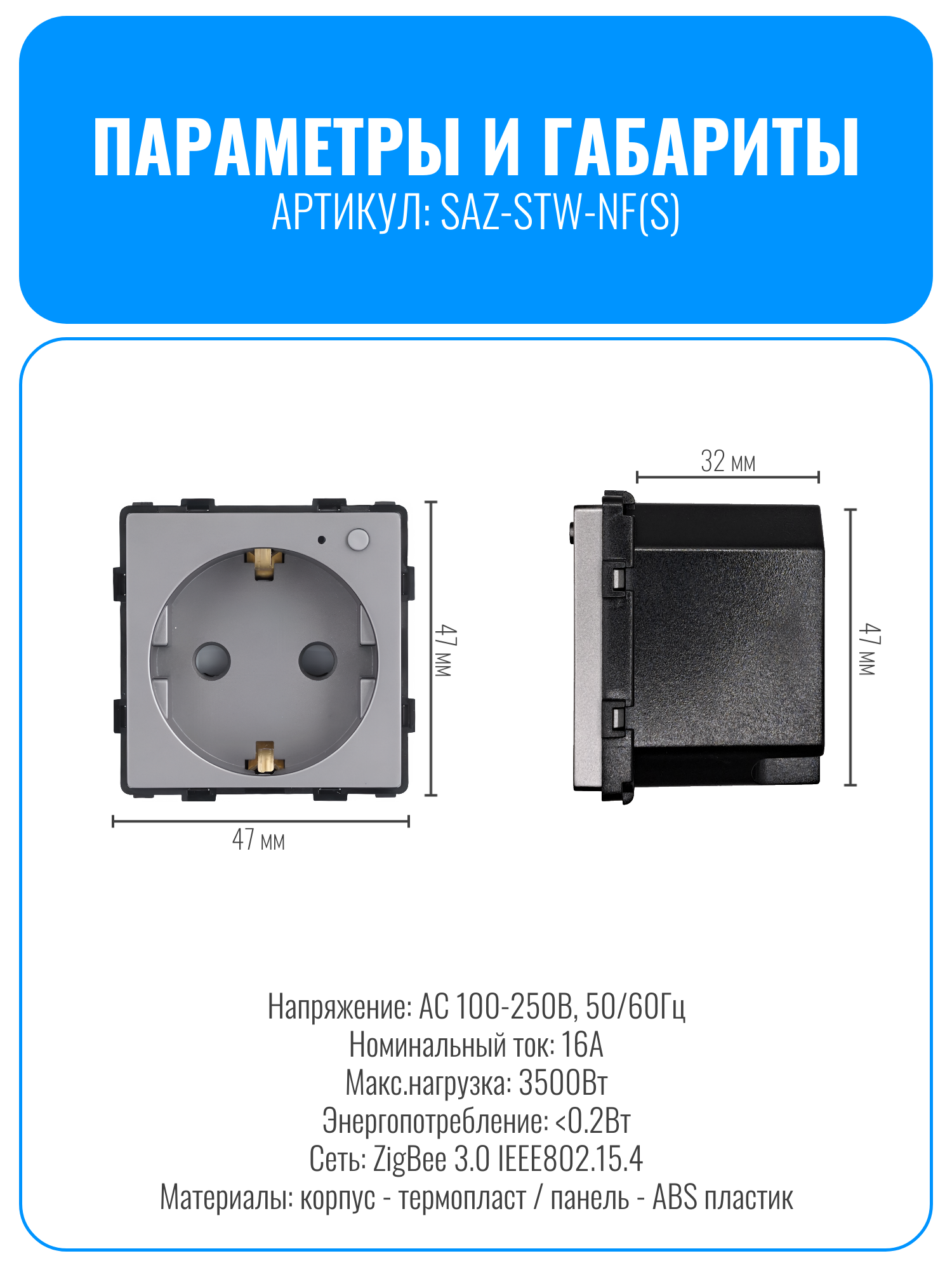 Умная ZigBee розетка Smart Aura SAZ-STW-NF серии Classic предназначена для автоматизации бытовых электроприборов. С ее помощью можно удаленно включать и выключать устройства, а также настраивать таймеры и индивидуальные сценарии работы. Управлять розеткой можно тремя способами: с помощью кнопки на корпусе, через мобильное приложение или с помощью голосовых команд.