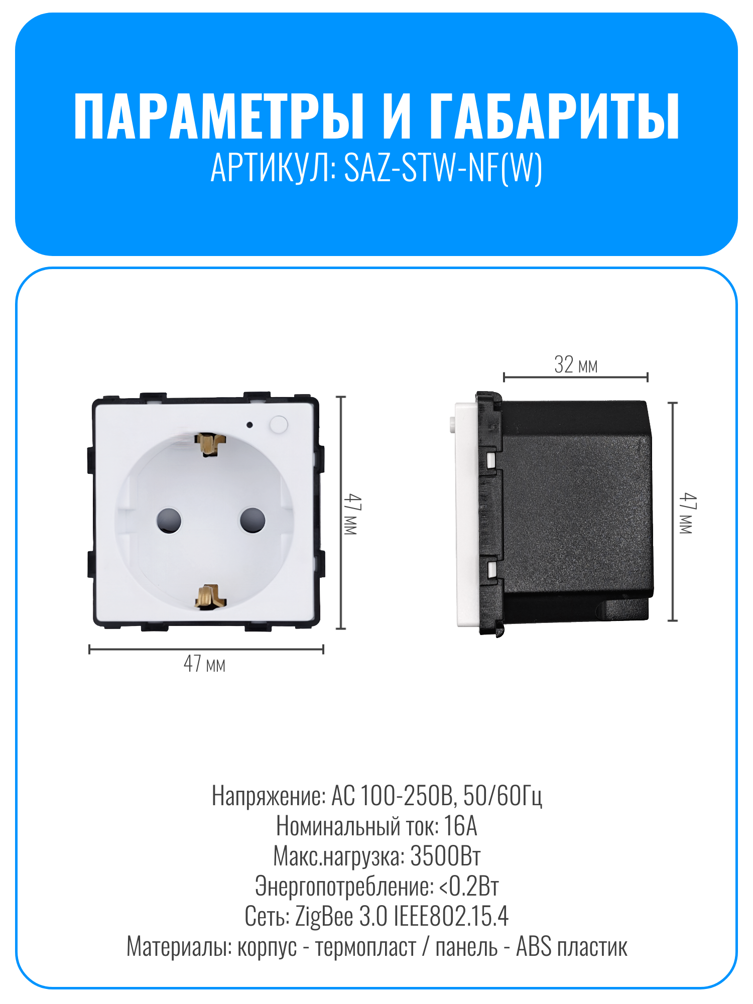 Умная ZigBee розетка Smart Aura SAZ-STW-NF серии Classic предназначена для автоматизации бытовых электроприборов. С ее помощью можно удаленно включать и выключать устройства, а также настраивать таймеры и индивидуальные сценарии работы. Управлять розеткой можно тремя способами: с помощью кнопки на корпусе, через мобильное приложение или с помощью голосовых команд.