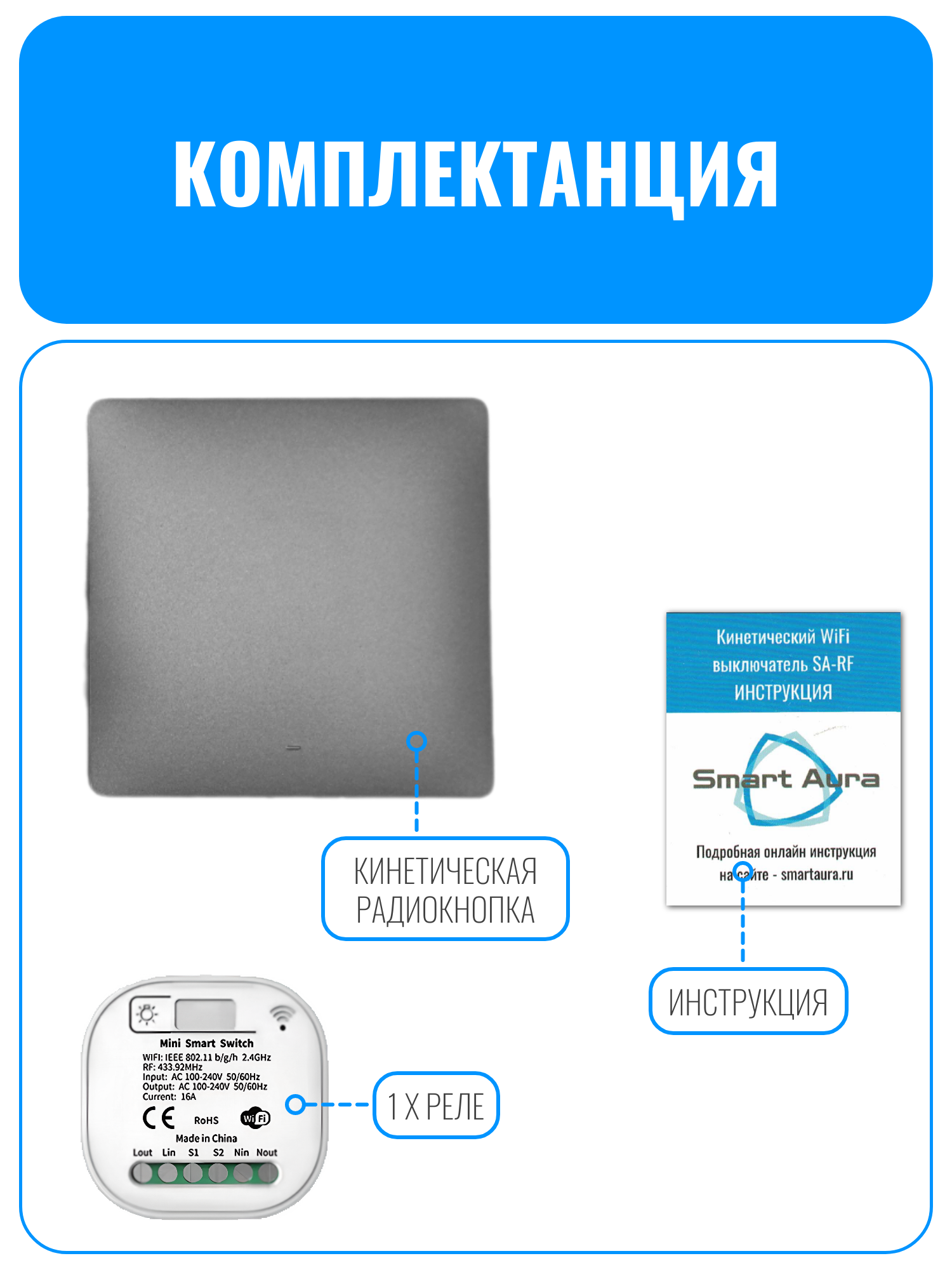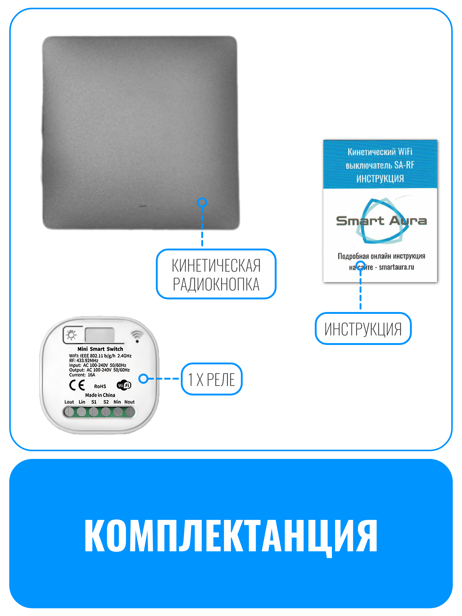 Умный кинетический WiFi радиовыключатель Smart Aura SA-RF — это современное устройство для управления освещением в доме. Он работает по инновационной технологии сбора энергии и не требует батареек. При нажатии кнопки встроенный модуль преобразует кинетическую энергию в электрическую, после чего передаёт сигнал на приёмник по радиоканалу с частотой 433,92 МГц. Приёмник, получая сигнал, включает или выключает свет.
