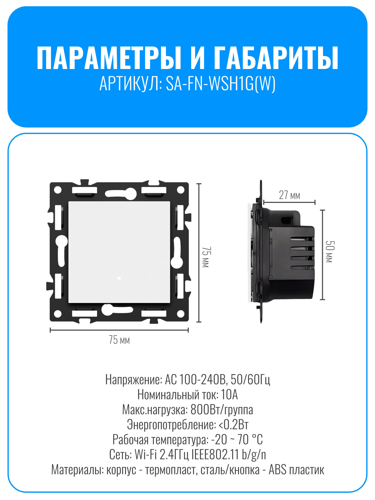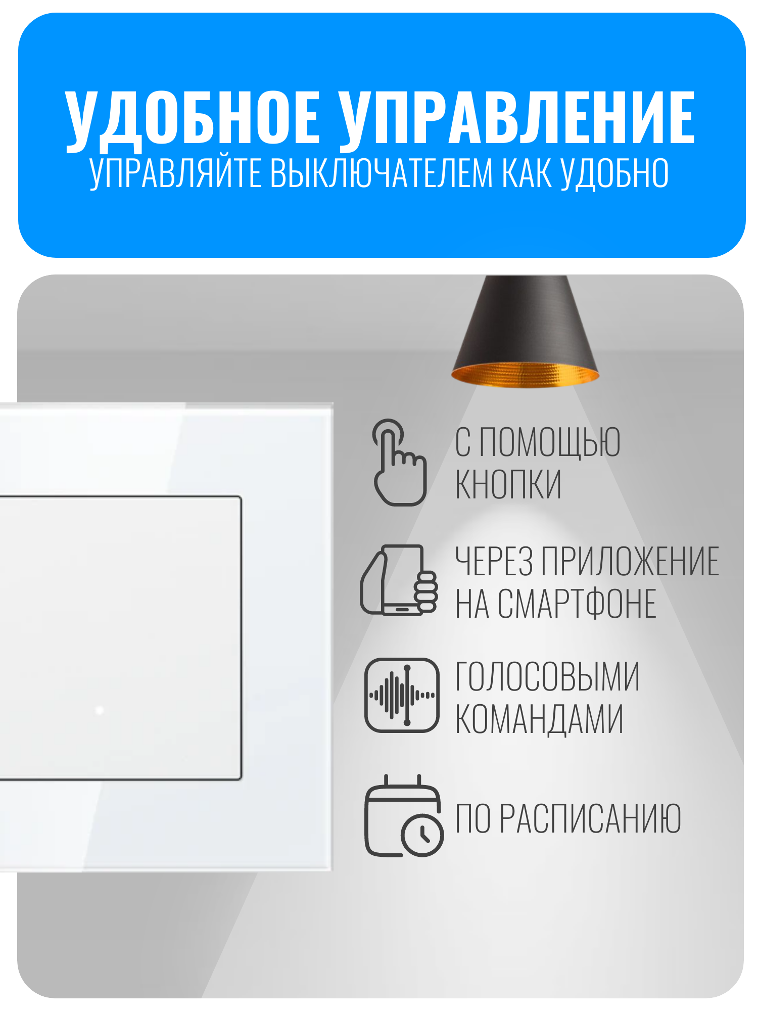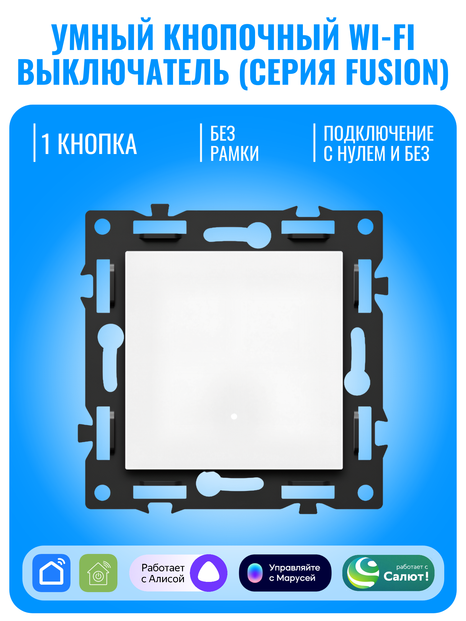 Умный кнопочный Wi-Fi выключатель Smart Aura серии Fusion — это современное решение для управления освещением в доме. Пользователь может включать и выключать свет с помощью удобной кнопки, через мобильное приложение или с помощью голосовых команд.