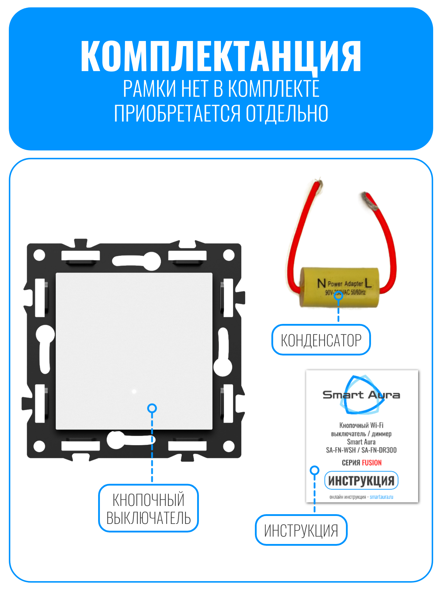 Внимание! Рамки нет в комплекте, приобретается отдельно. Совместимо с рамкой Smart Aura серии Fusion: SA-FN-GS