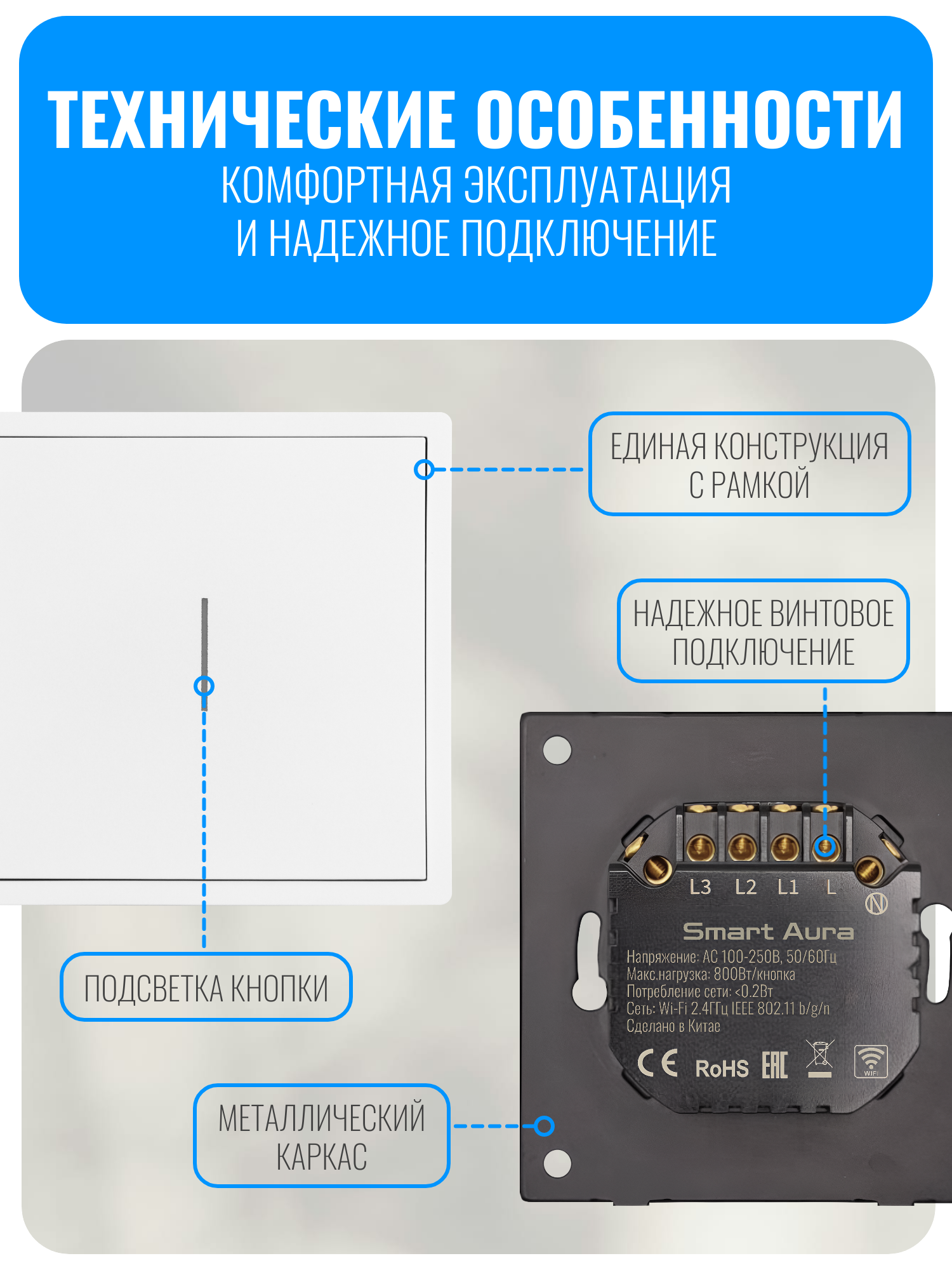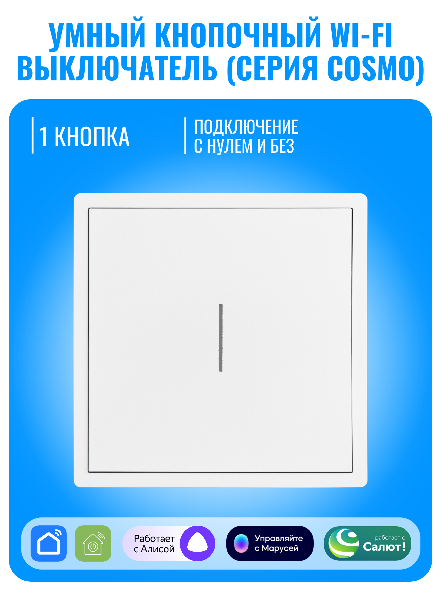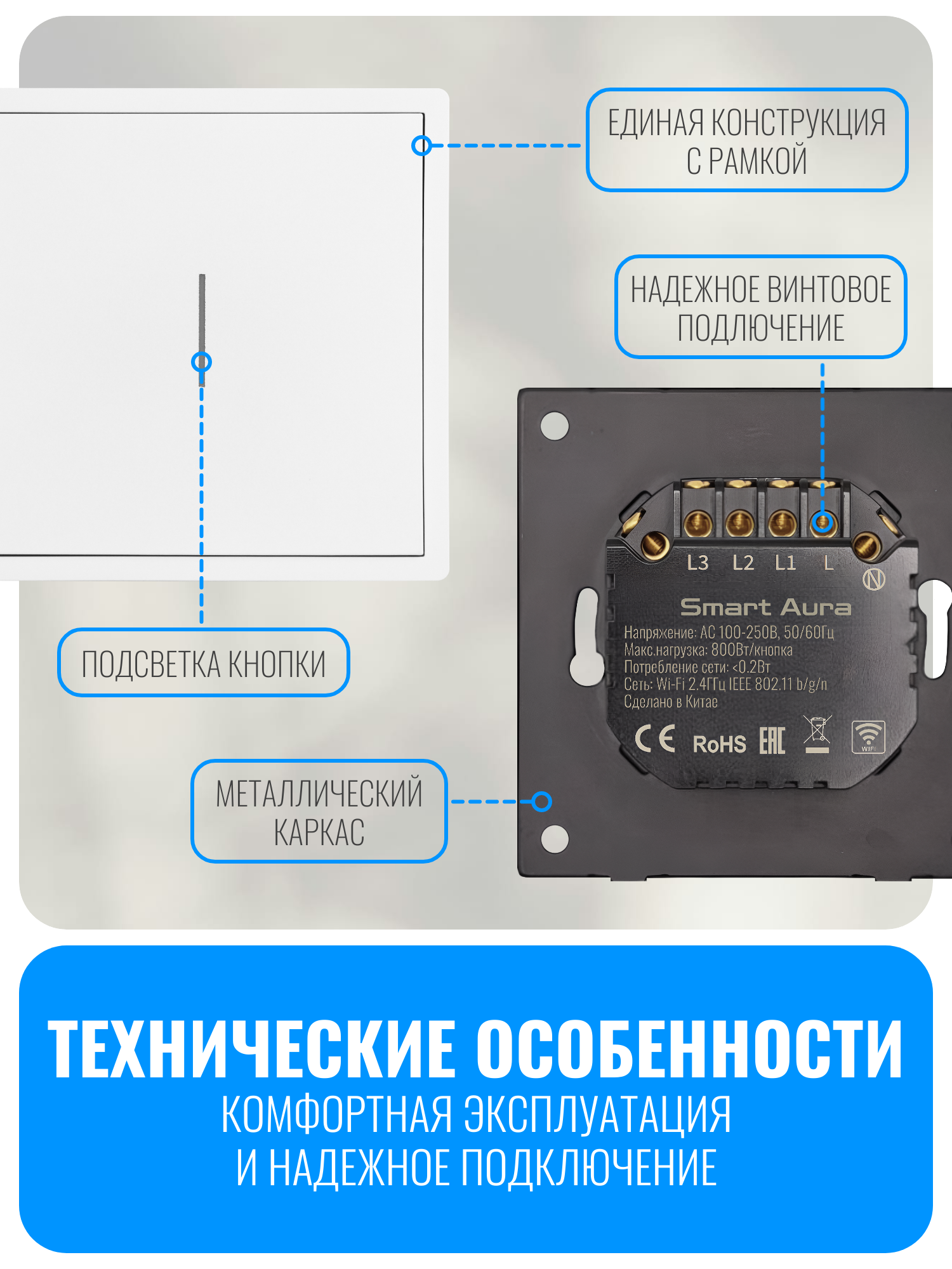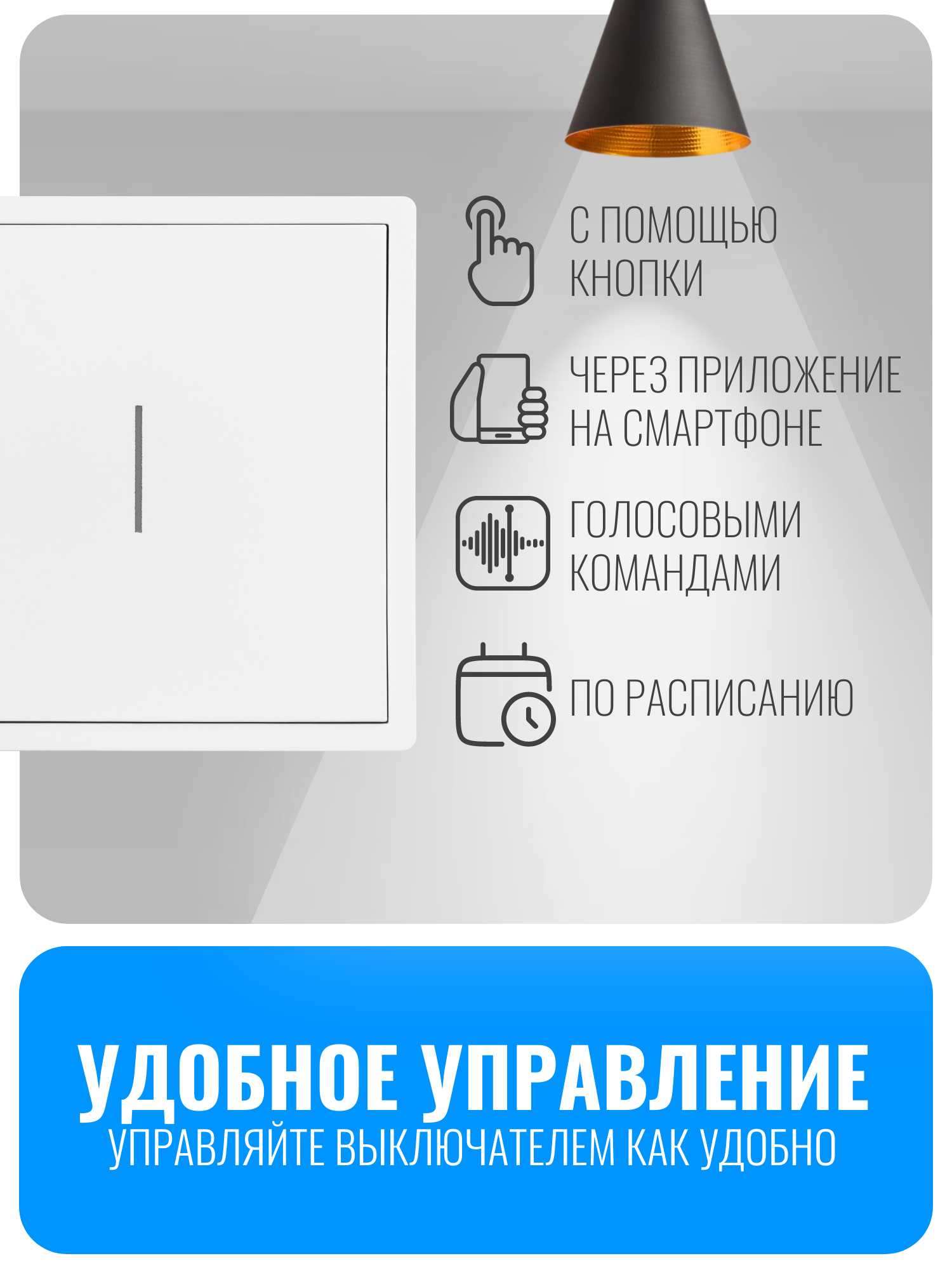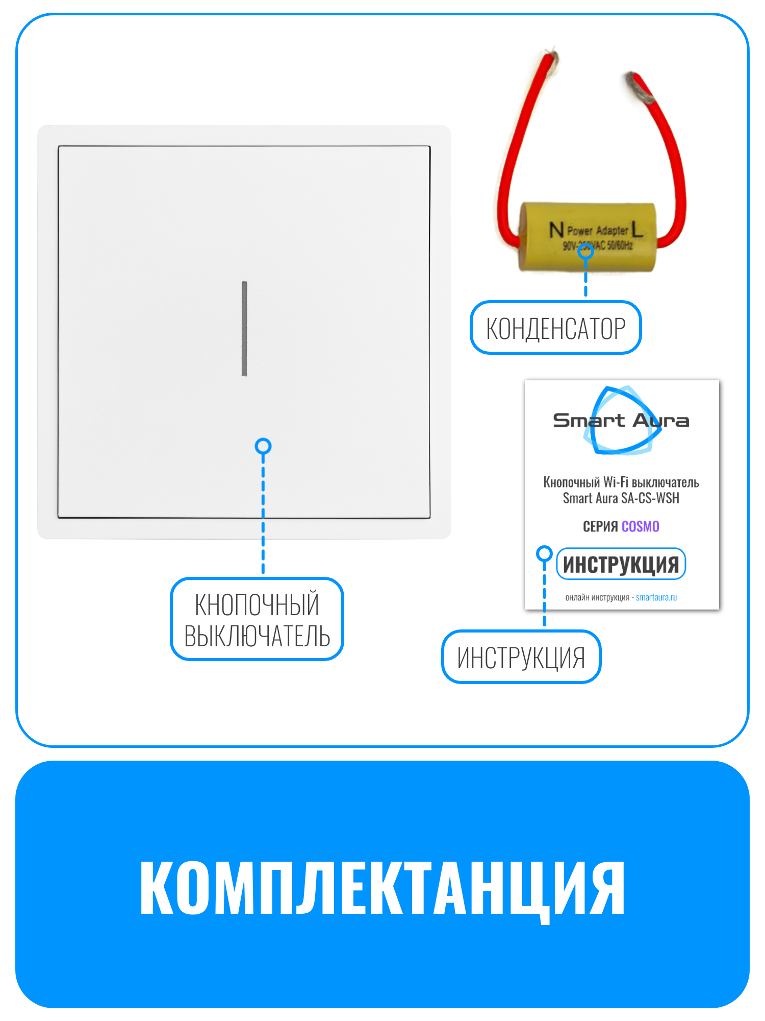 Умный кнопочный Wi-Fi выключатель Smart Aura серии COSMO — это современное устройство для управления освещением в доме. Пользователь может включать и выключать свет с помощью кнопки, мобильного приложения или голосовых команд.