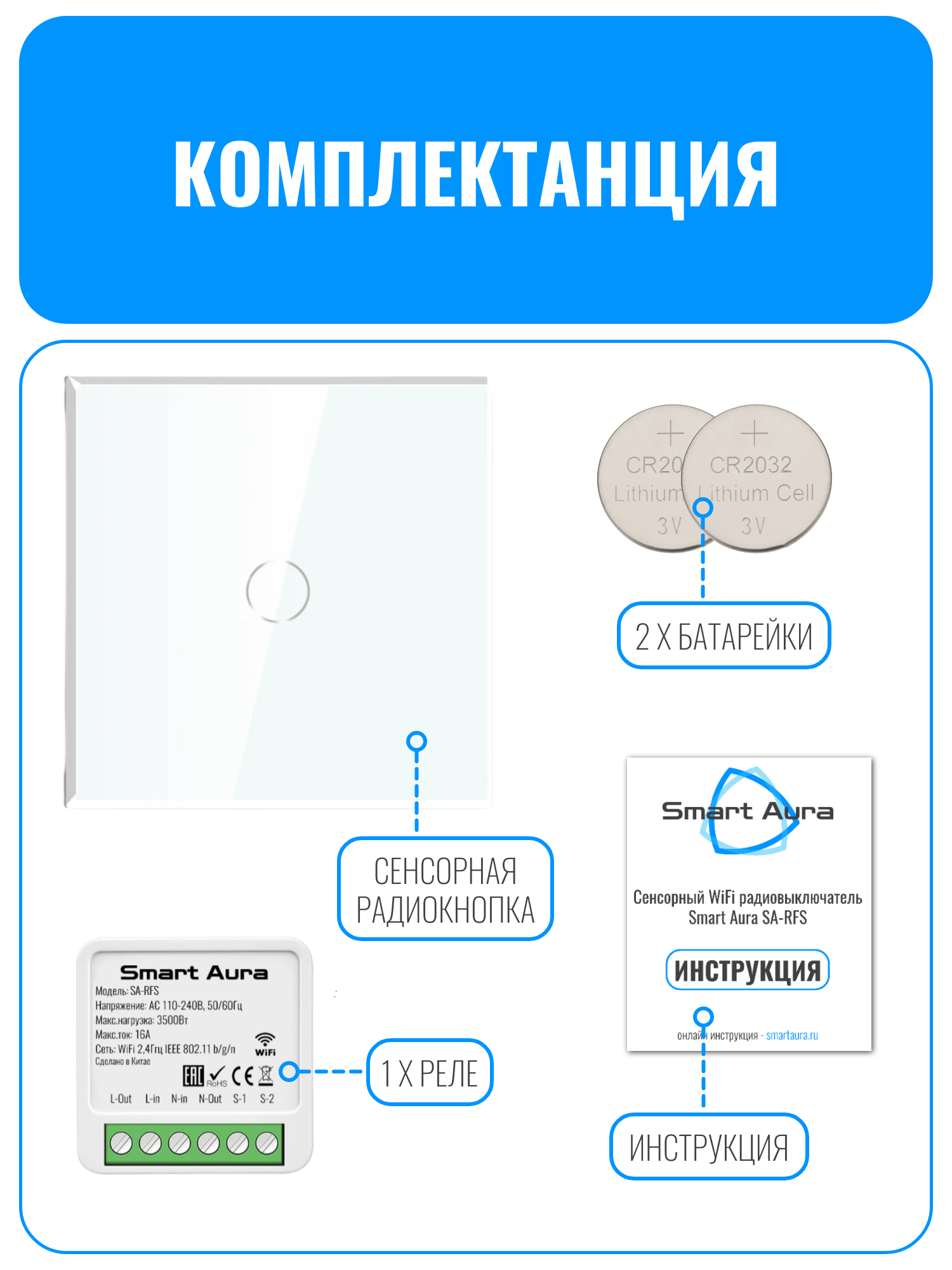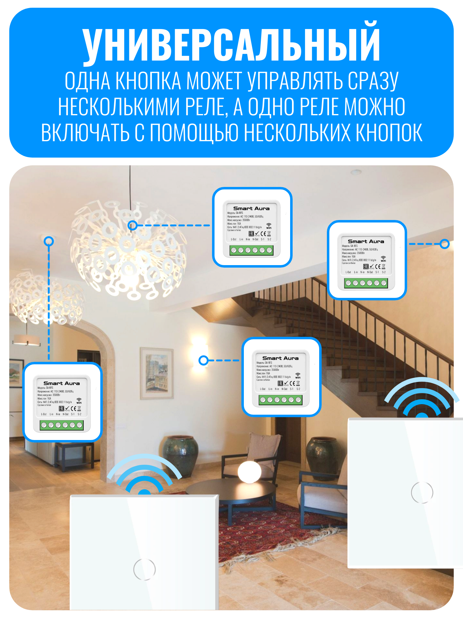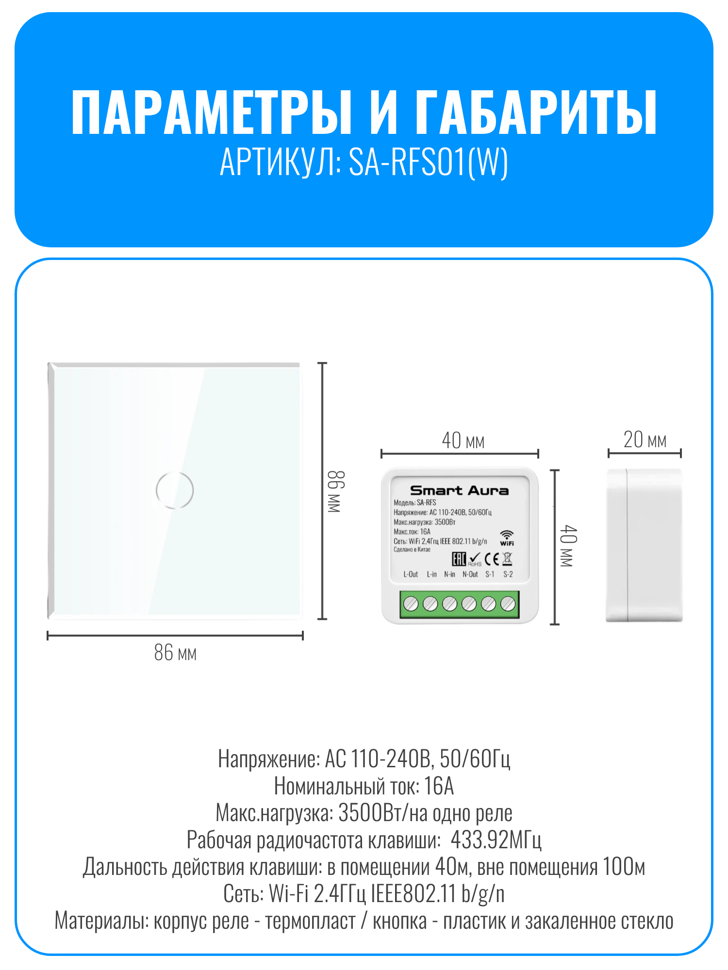 Умный сенсорный Wi-Fi радиовыключатель Smart Aura SA-RFS — это современное решение для дистанционного управления освещением. Беспроводная сенсорная кнопка работает от двух батареек CR2025, которые входят в комплект. Благодаря этому кнопку можно установить в любом удобном месте. Панель выполнена из закалённого стекла и передаёт радиосигнал на реле.