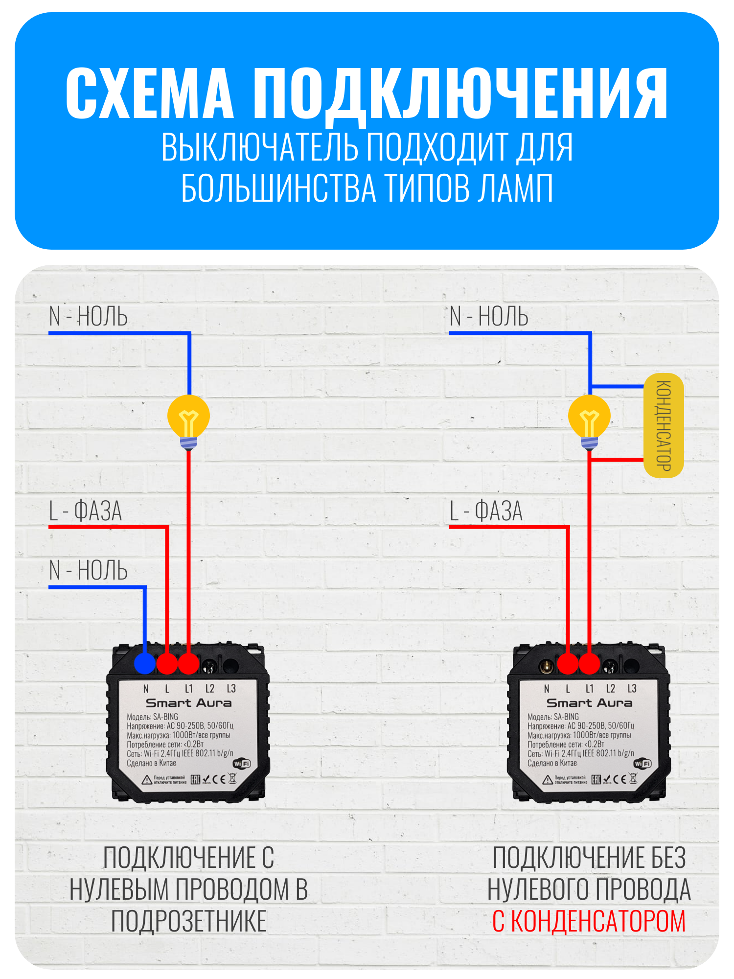 Кнопка оснащена синей подсветкой: при выключенном состоянии подсветка светит слабо, а при включенном — ярче. Элегантная панель выключателя выполнена из закаленного стекла высокого качества, что делает её устойчивой к влаге и легкой в уходе. Устройство оснащено ёмкостным сенсором, как в смартфонах, обеспечивая высокую чувствительность к легким прикосновениям. Выключатель может быть подключен как с нулевым проводом, так и без него, поскольку конденсатор уже входит в комплект. Общая допустимая нагрузка на все кнопки составляет 1000 Вт.