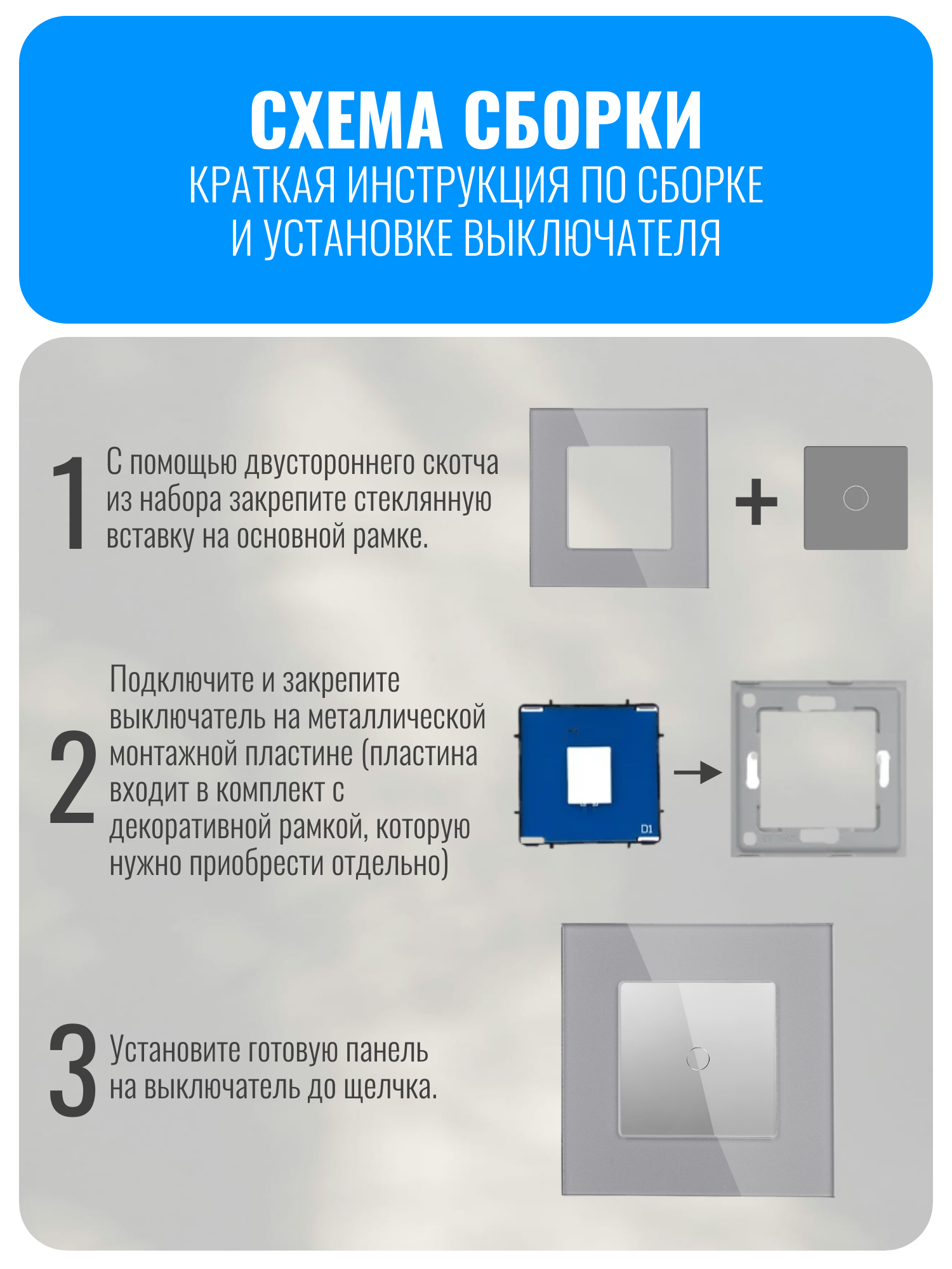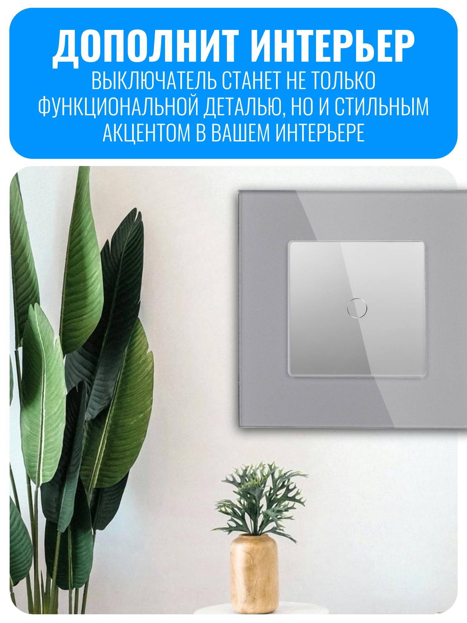 Выключатель можно установить как вертикально, так и горизонтально, что упрощает его интеграцию в любой интерьер. В комплекте поставляется только модуль сенсорного выключателя со стеклянной панелью, рамку нужно приобрести отдельно. Это позволяет выбрать рамку подходящего цвета и материала, чтобы она гармонично вписывалась в дизайн помещения.