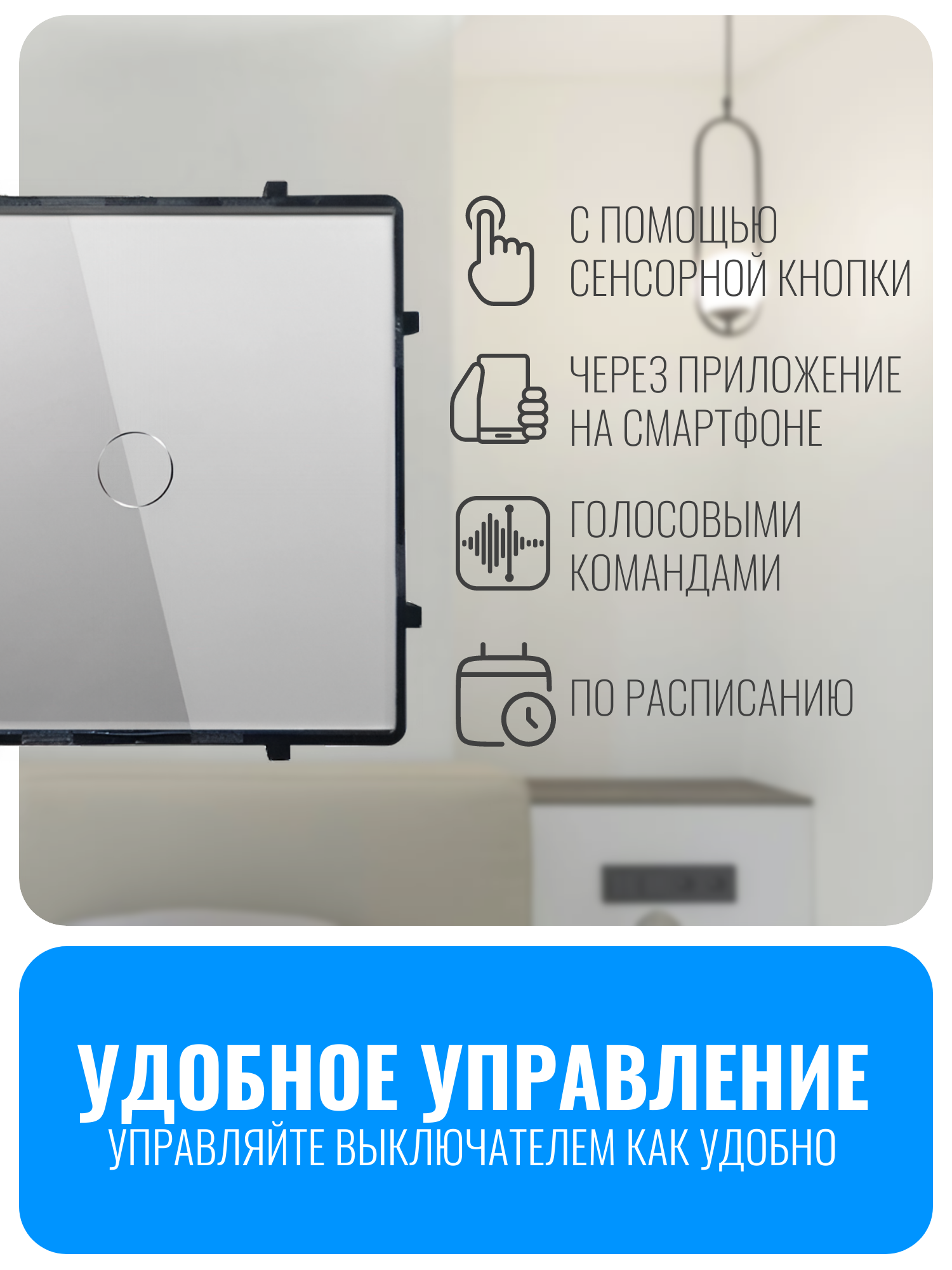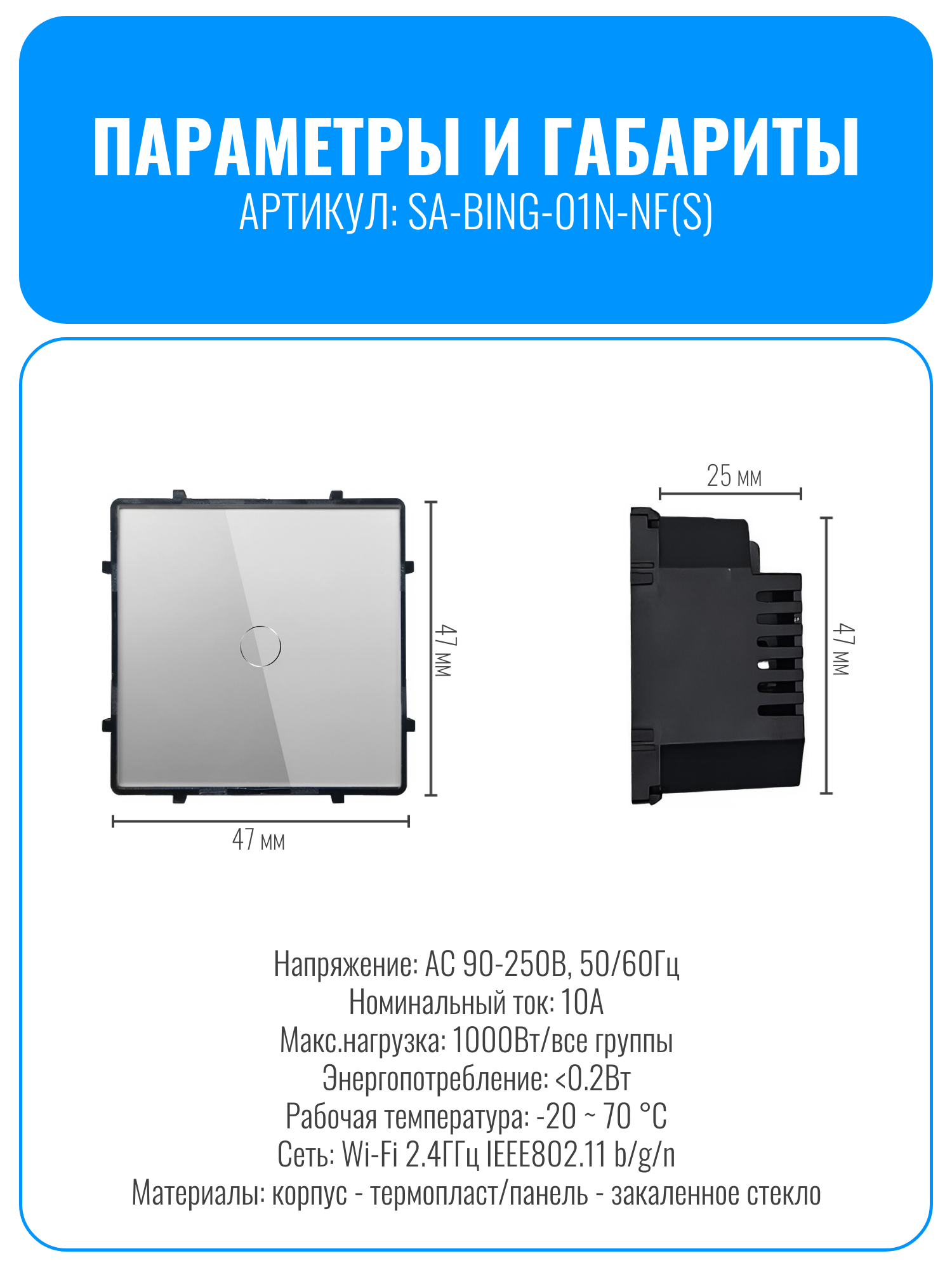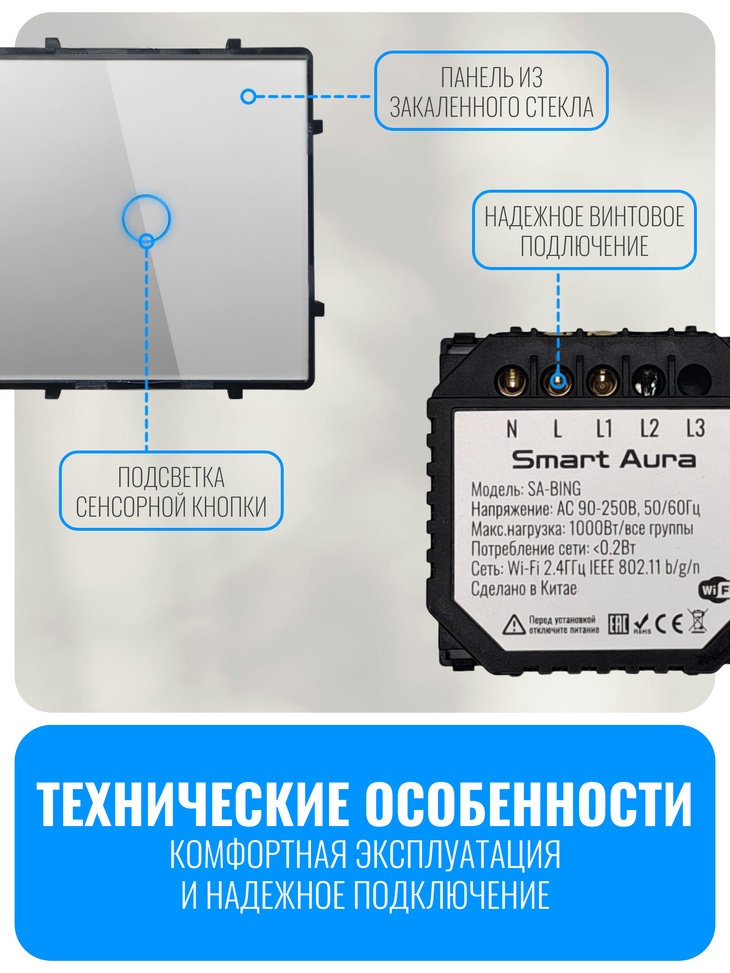 Умный сенсорный Wi-Fi выключатель Smart Aura серии SA-BING — это стильное и функциональное устройство для управления освещением. Пользователи могут включать и выключать свет с помощью сенсорной кнопки, через мобильное приложение или голосовыми командами.