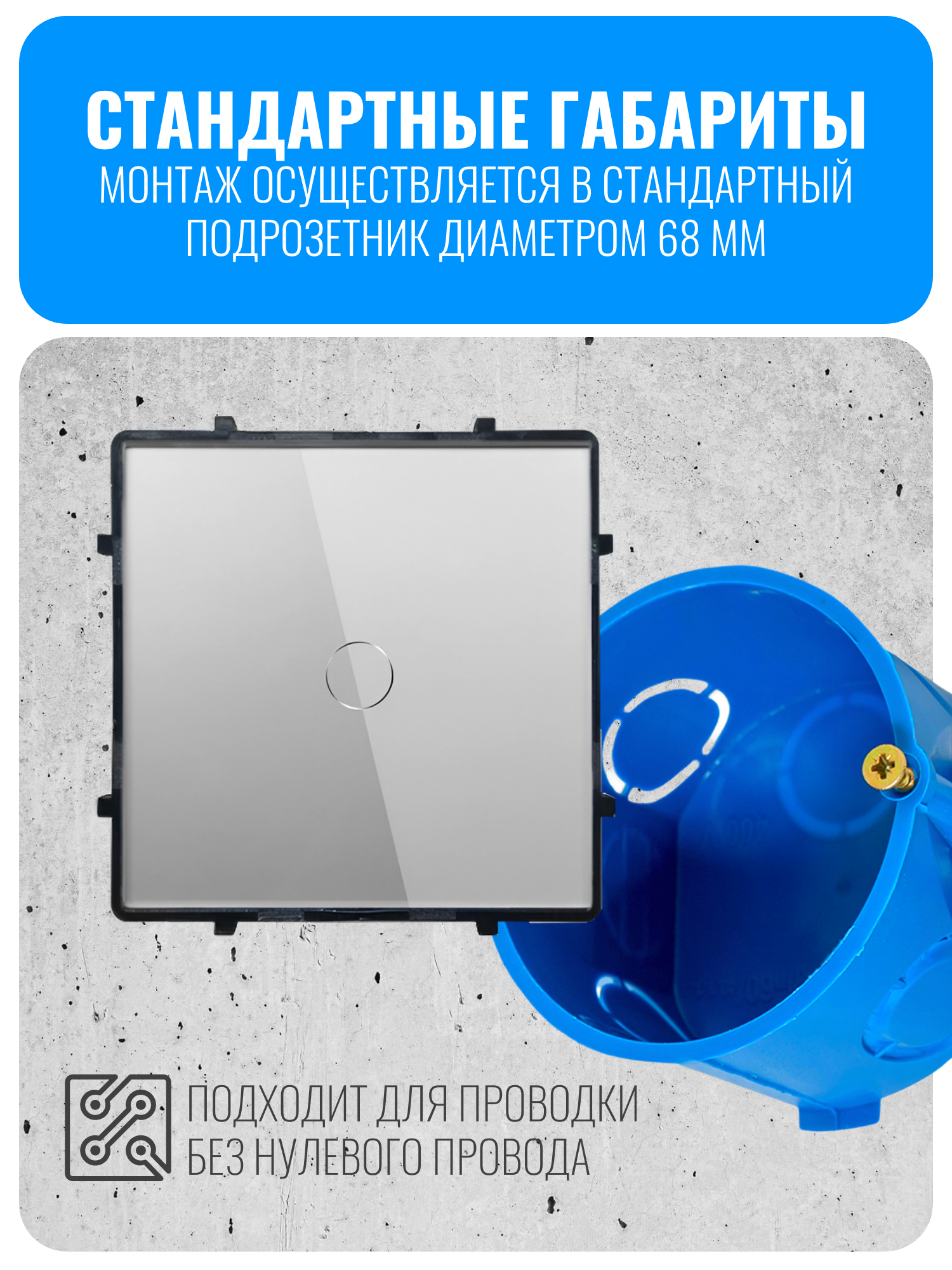 Кнопка оснащена синей подсветкой: при выключенном состоянии подсветка светит слабо, а при включенном — ярче. Элегантная панель выключателя выполнена из закаленного стекла высокого качества, что делает её устойчивой к влаге и легкой в уходе. Устройство оснащено ёмкостным сенсором, как в смартфонах, обеспечивая высокую чувствительность к легким прикосновениям. Выключатель может быть подключен как с нулевым проводом, так и без него, поскольку конденсатор уже входит в комплект. Общая допустимая нагрузка на все кнопки составляет 1000 Вт.