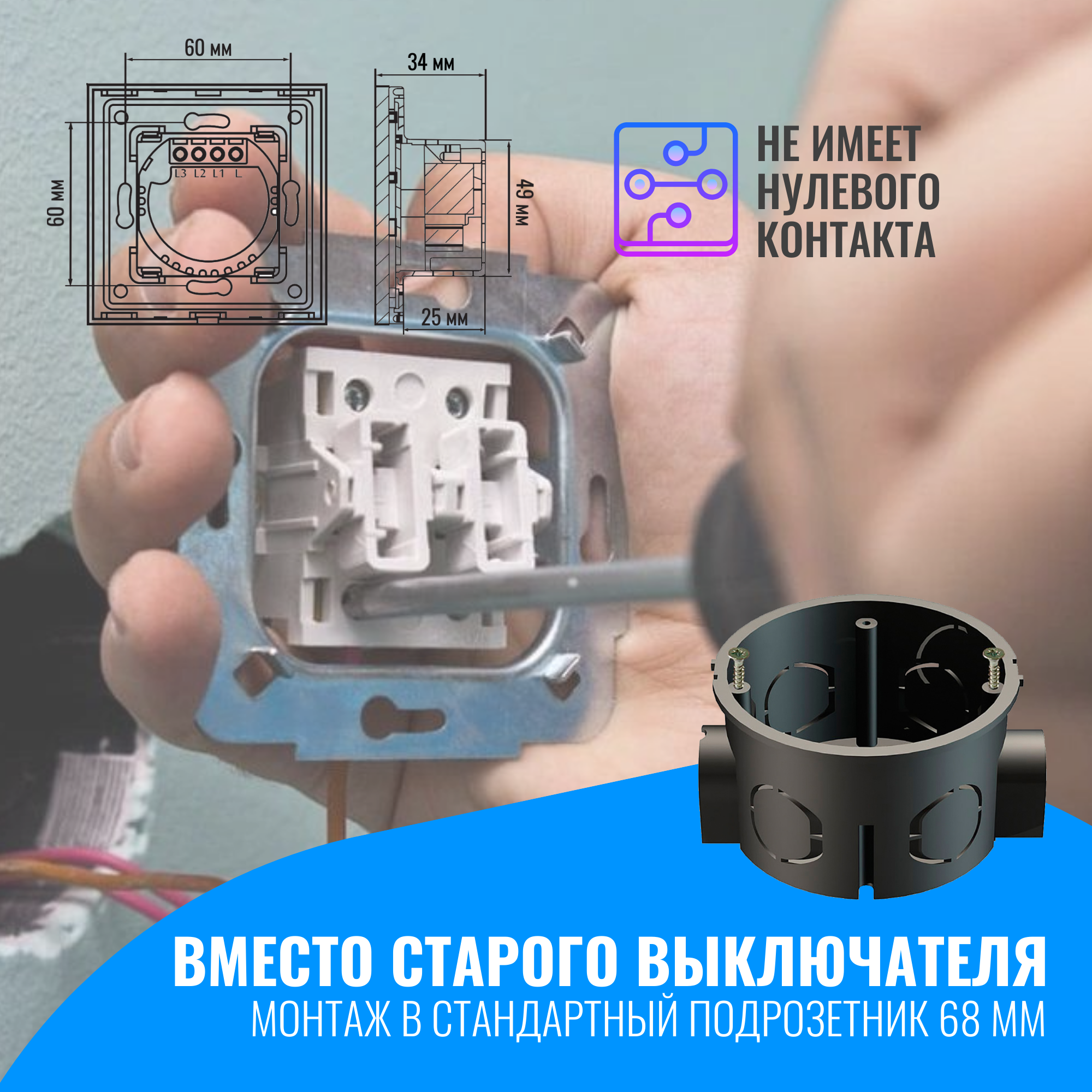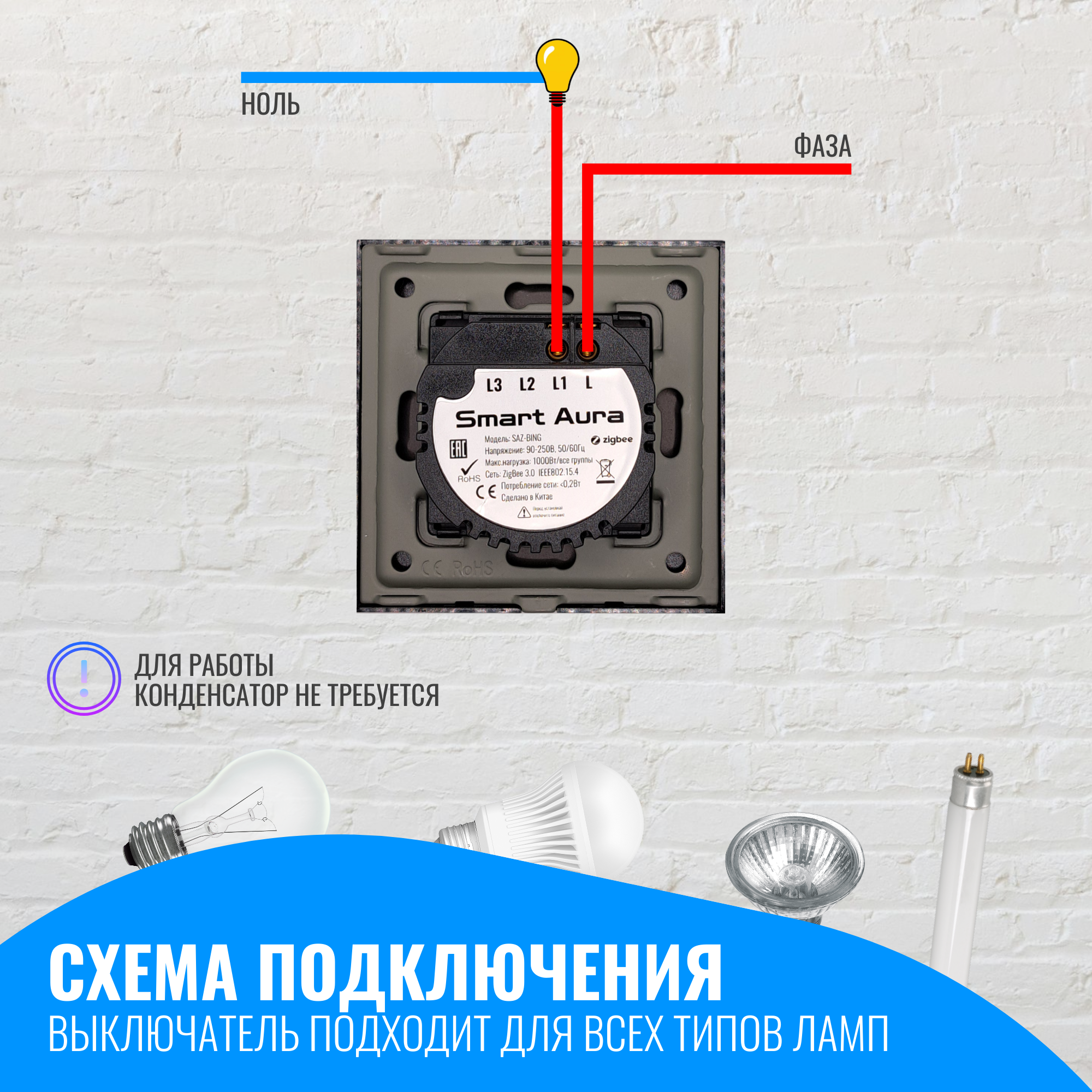 Выключатель подключается по схеме без нулевого провода (конденсатор не требуется). Максимальная нагрузка на все кнопки составляет 1000 Вт. Панель выключателя легко заменяется. При необходимости вы можете выбрать другой цвет или установить выключатель в многопостовую рамку вместе с розетками, диммерами, терморегуляторами и другими электроустановочными изделиями фирмы Smart Aura.