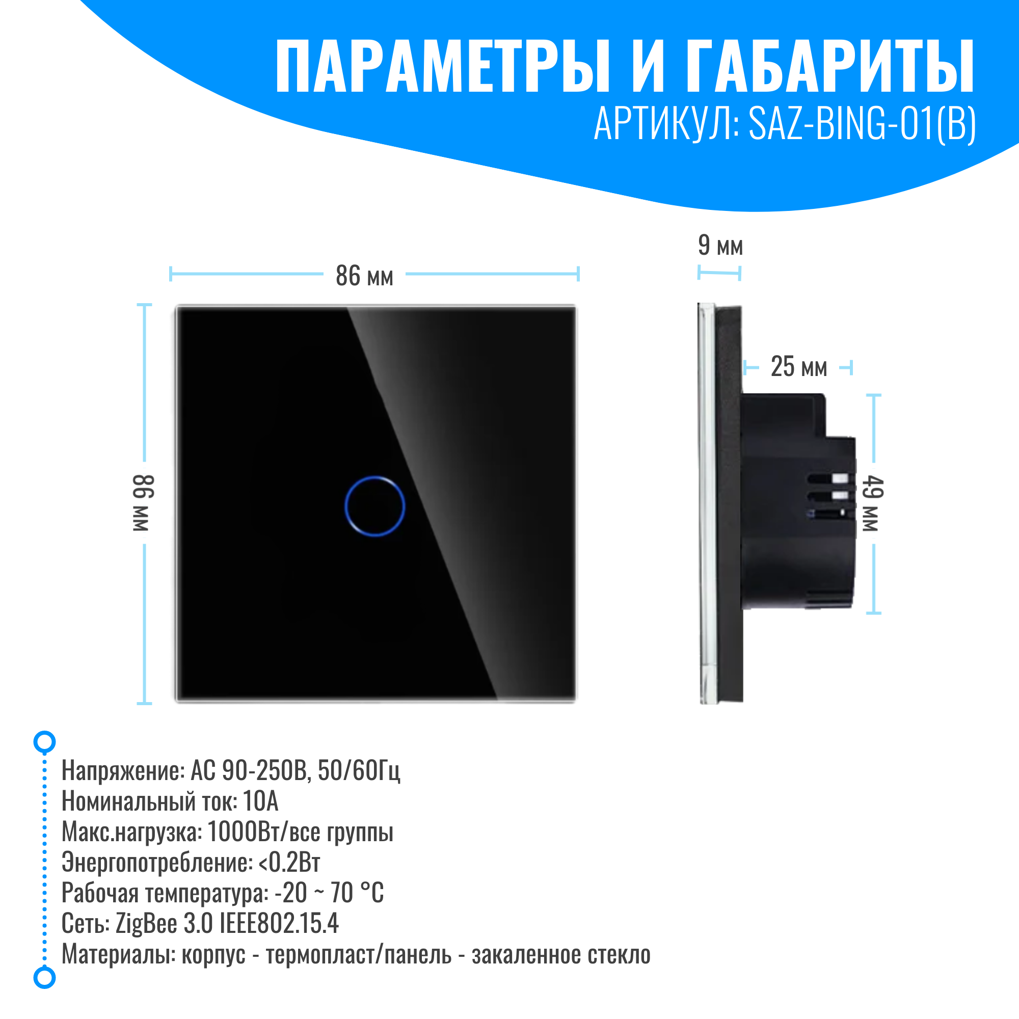 Умный сенсорный ZigBee выключатель Smart Aura серии SAZ-BING — это стильное и функциональное устройство для управления освещением. Вы можете включать и выключать свет с помощью сенсорной кнопки, мобильного приложения или голосовых команд.