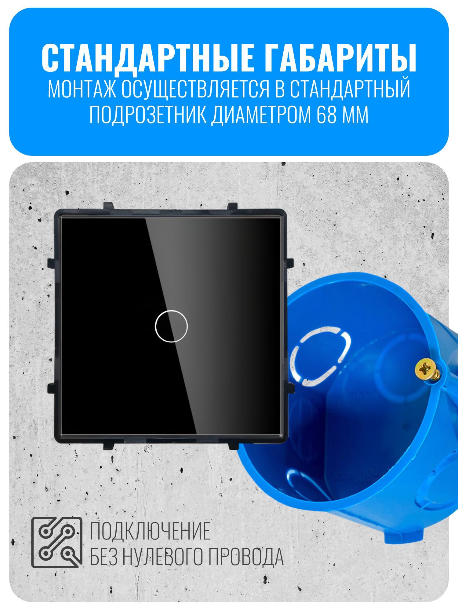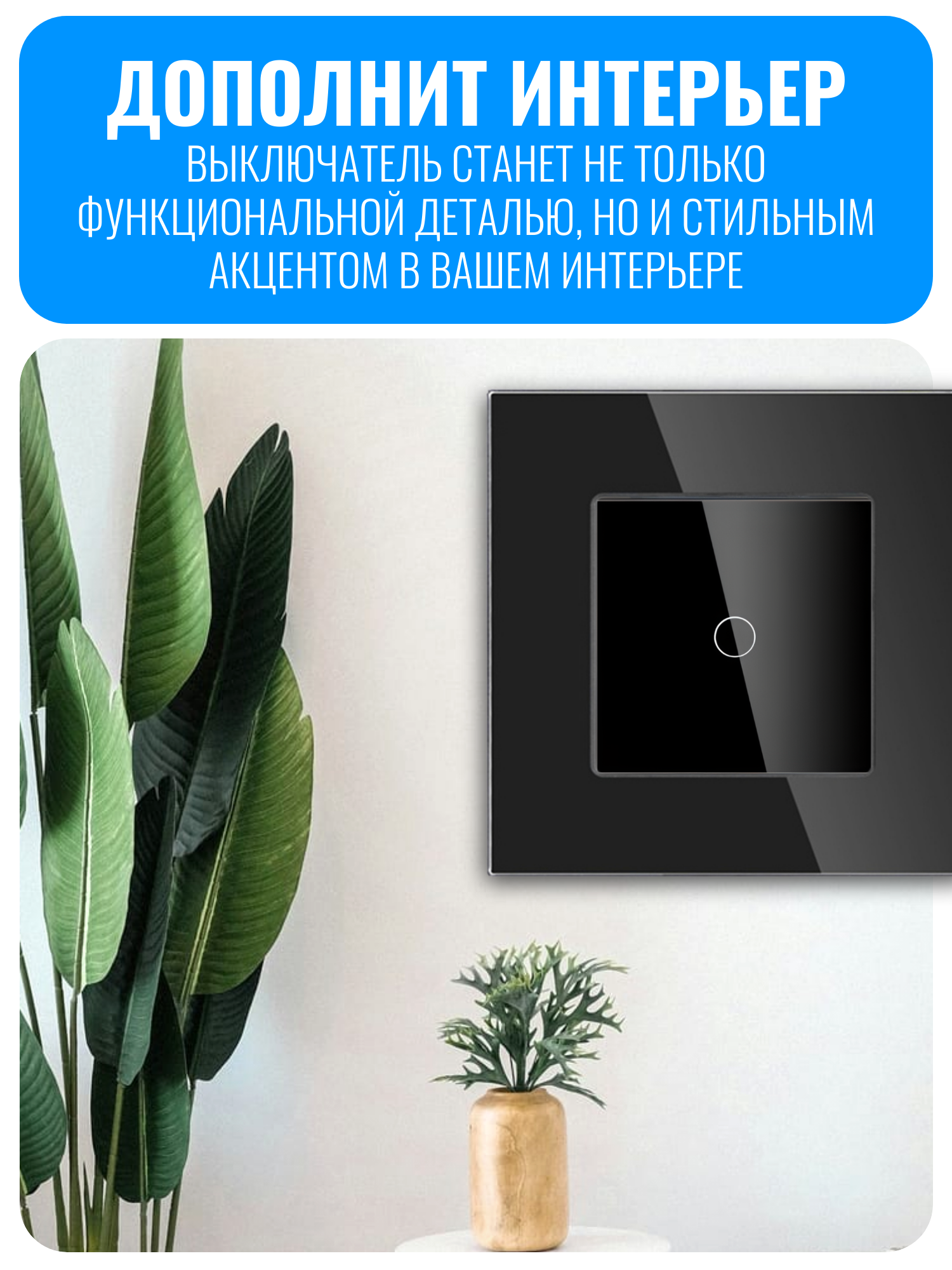 Выключатель можно установить как вертикально, так и горизонтально, что упрощает его интеграцию в любой интерьер. В комплекте поставляется только модуль сенсорного выключателя со стеклянной панелью, рамку нужно приобрести отдельно. Это позволяет выбрать рамку подходящего цвета и материала, чтобы она гармонично вписывалась в дизайн помещения.