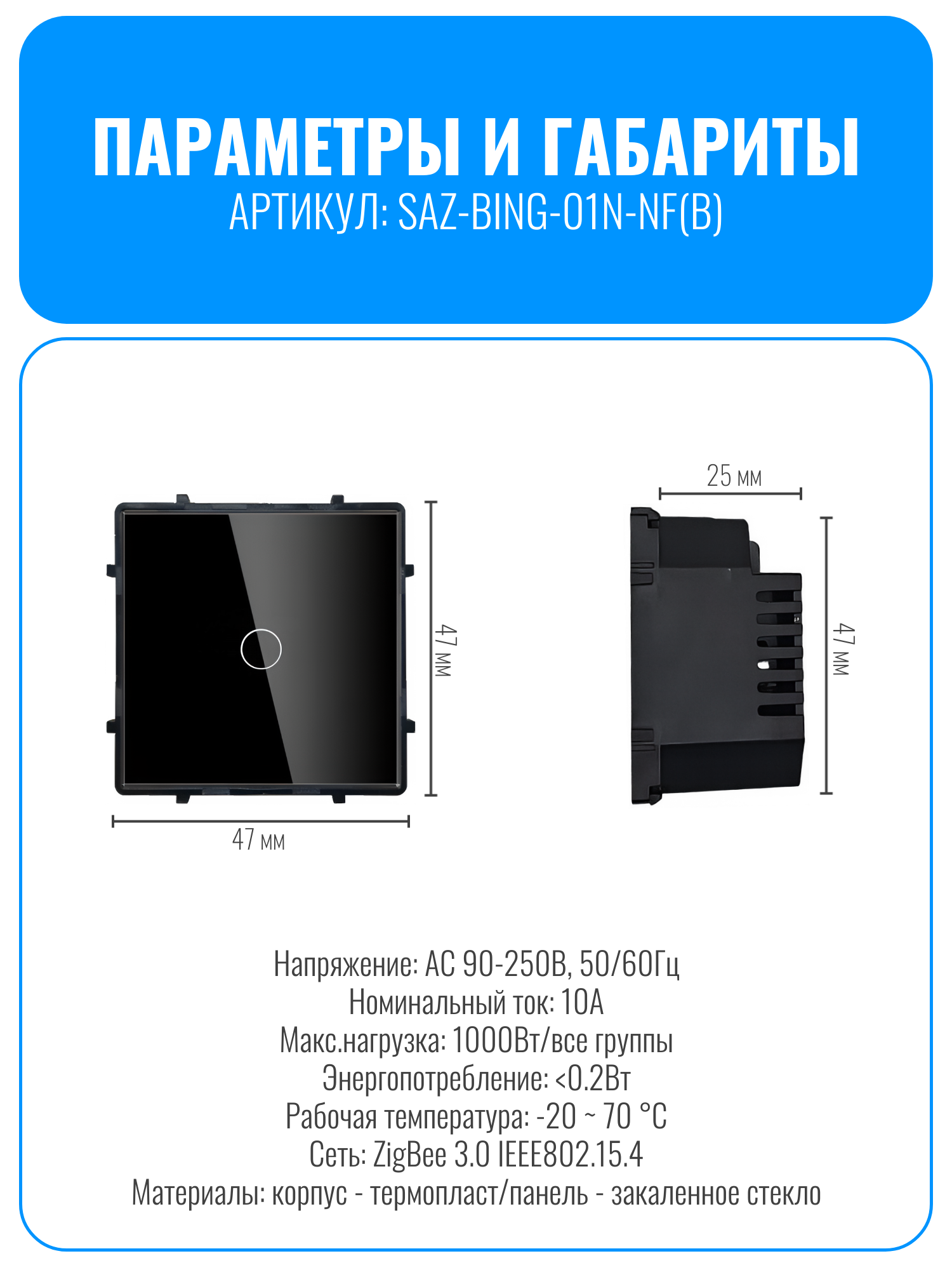 Умный сенсорный ZigBee выключатель Smart Aura серии SAZ-BING — это стильное и функциональное устройство для управления освещением. Вы можете включать и выключать свет с помощью сенсорной кнопки, мобильного приложения или голосовых команд.