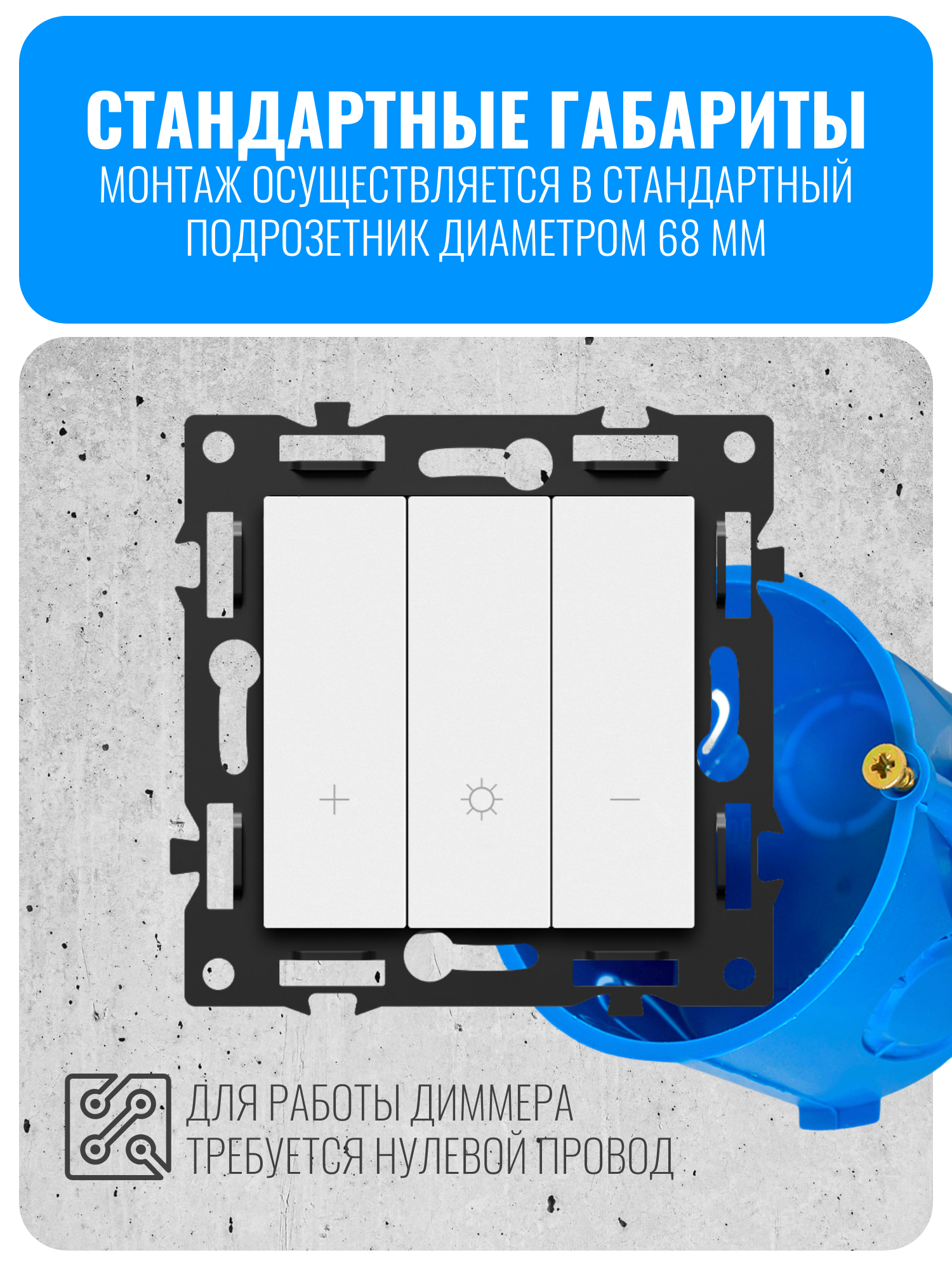 Диммер этой серии можно комбинировать между собой, создавая единый блок из нескольких устройств — до пяти постов подряд. Выключатель подходит как для вертикального, так и для горизонтального монтажа.