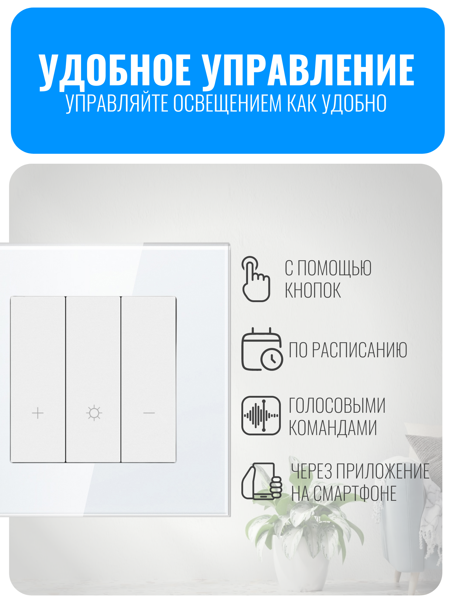 Для работы диммер подключается к Wi-Fi на частоте 2,4 ГГц, дополнительный хаб не требуется. Управлять выключателем можно через приложения Smart Life и DIGMA SmartLife. Поддерживается интеграция с голосовыми ассистентами Яндекс Алиса, VK Маруся и Сбер Салют. Это обеспечивает удобство и быструю реакцию на команды пользователя.