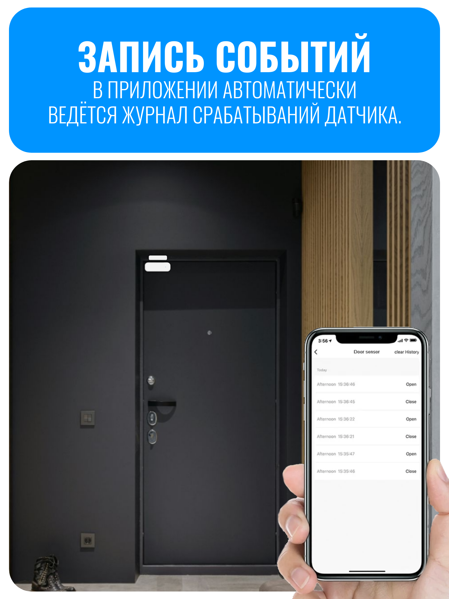 Этот датчик также идеально подходит для охраны помещения: при проникновении вы получите push-уведомление. Приложение ведёт журнал всех событий, что позволяет, например, отслеживать присутствие сотрудников на рабочих местах или проверять, когда ребёнок находится дома.