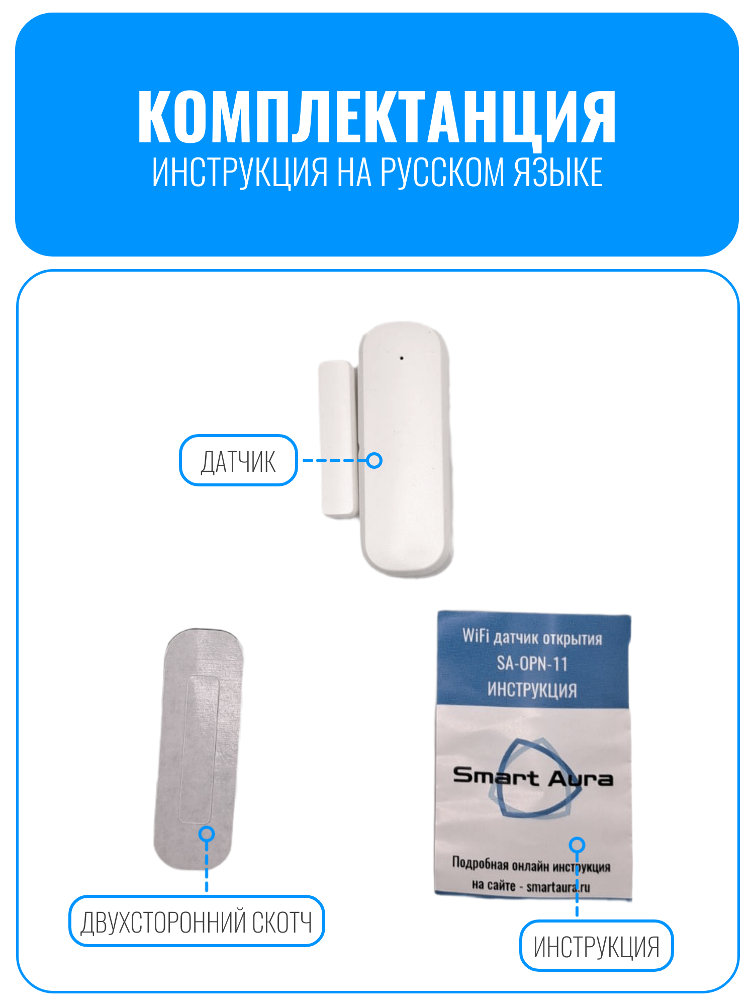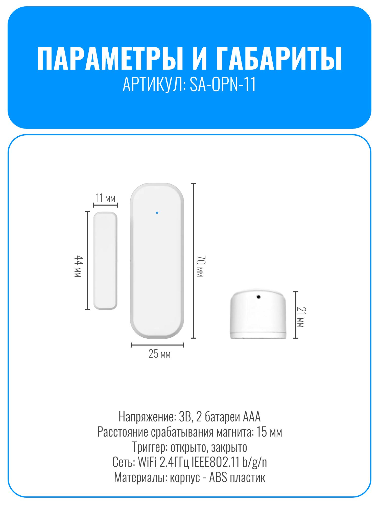 Умный Wi-Fi датчик для дверей или окон Smart Aura SA-OPN-11 - это компактное устройство, которое помогает вам контролировать несанкционированный доступ в ваше помещение. Вы можете настраивать сценарии взаимодействия с другими умными устройствами, например, включение света или активацию видеокамеры при открытии двери. Датчик имеет два триггера: "открыто" и "закрыто".