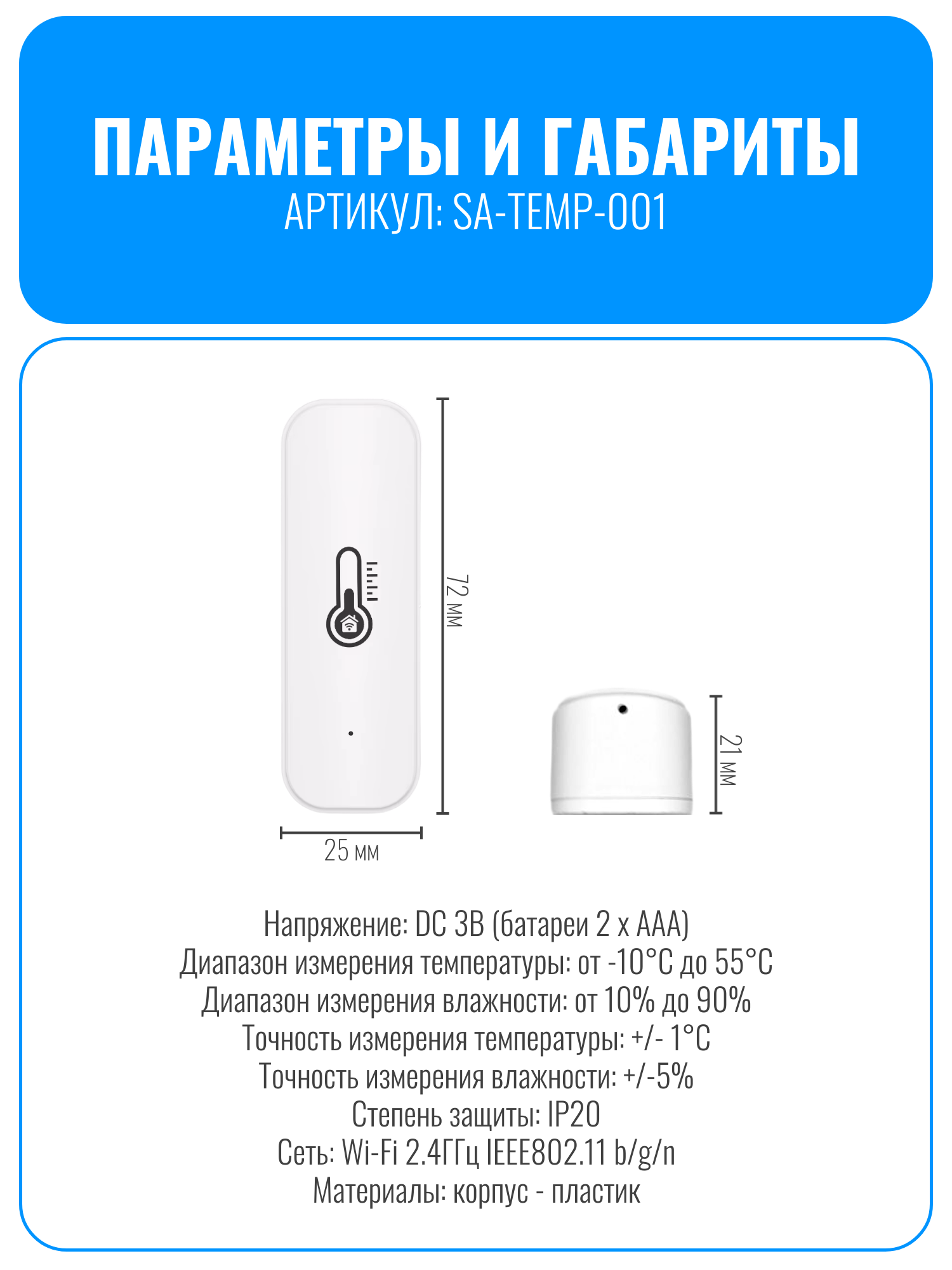 Диапазон измерения температуры: от -10 °C до 55 °C, влажности: от 10% до 90% относительной влажности. Точность измерений: температура ± 1 °C, влажность ± 5%. Компактные размеры и стильный белый корпус делают устройство удобным и эстетичным. Подключение осуществляется через Wi-Fi 2.4 ГГц, что позволяет разместить его в любом удобном месте. Питание обеспечивается двумя батарейками типа ААА (в комплект не входят).